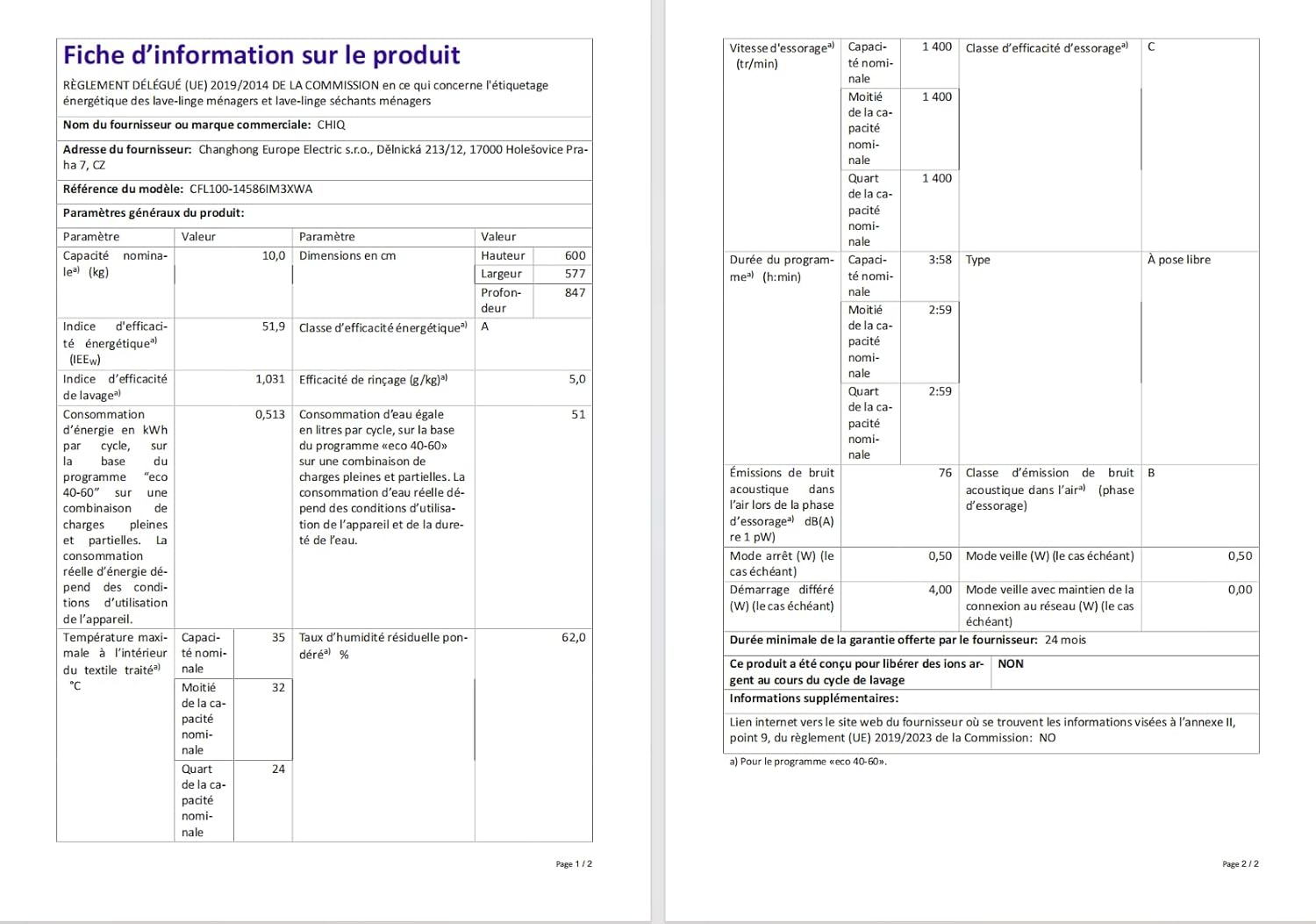 Lave-linge CHiQ à chargement frontal 10 kg CFL100-14586IM3XWA, blanc