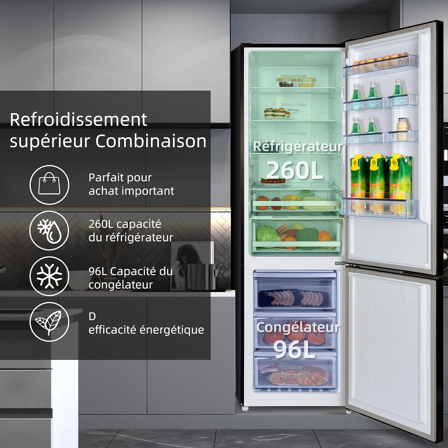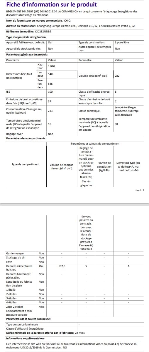 Combiné réfrigérateur-congélateur CHIQ, capacité totale 356 litres (260 +96 litres)