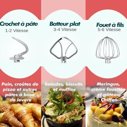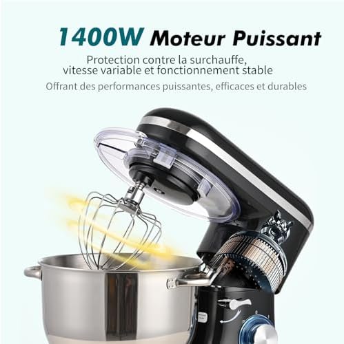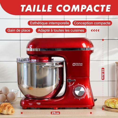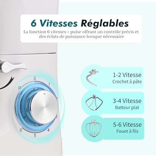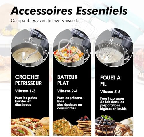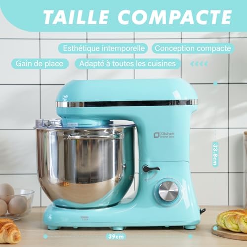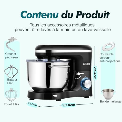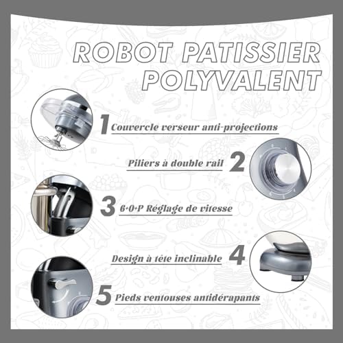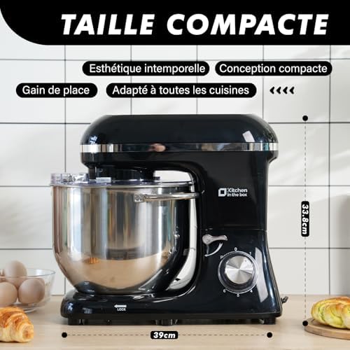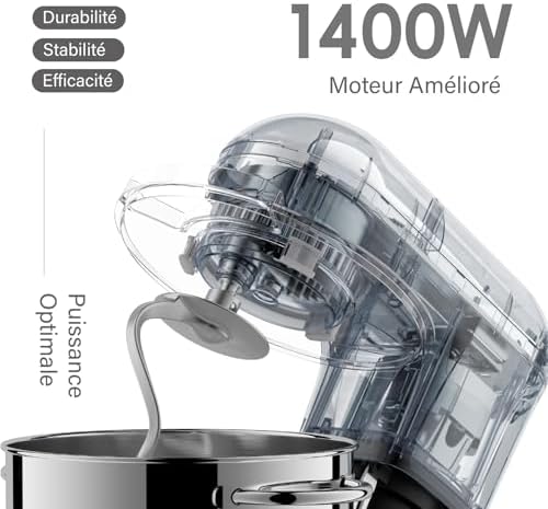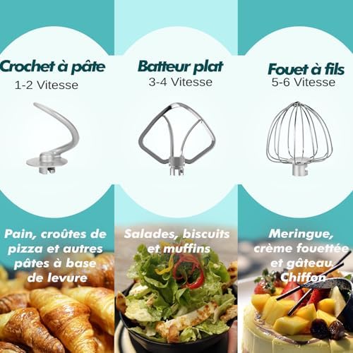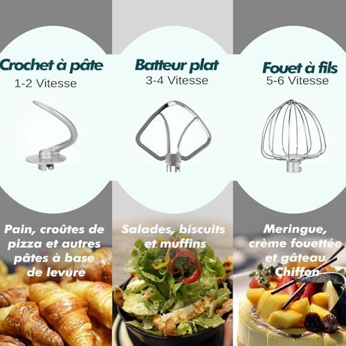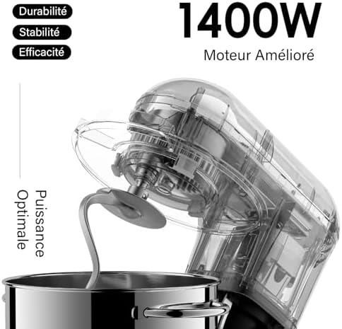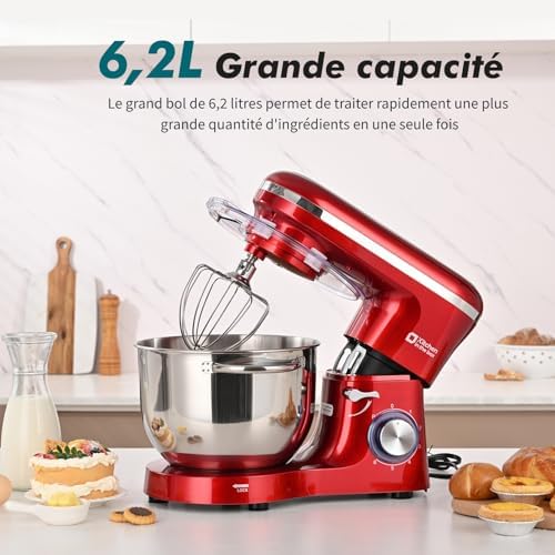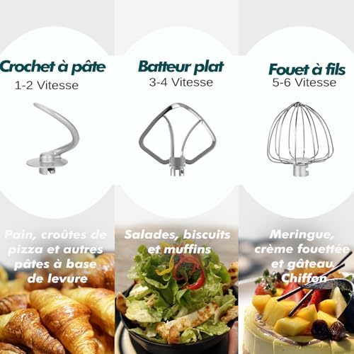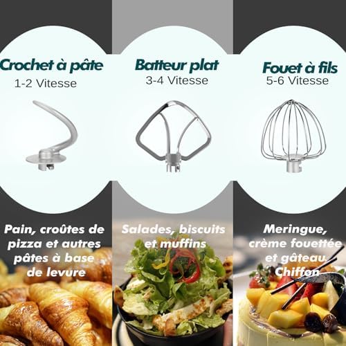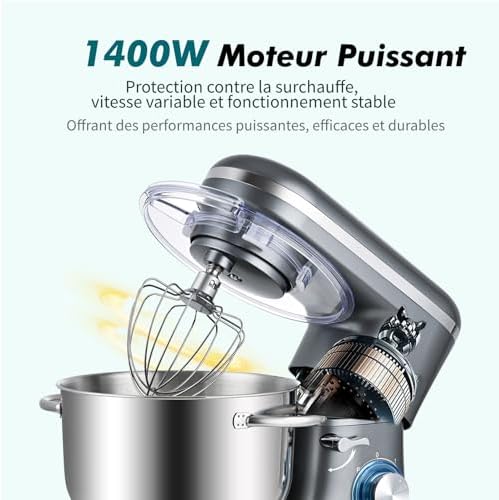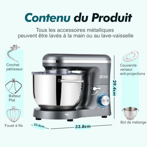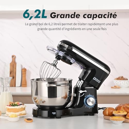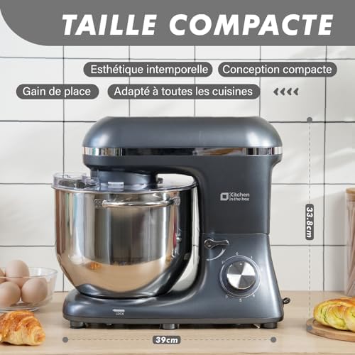 Kitchen in the box Robot Pâtissier 1400W, Bol 6,2L en Acier Inoxydable, 6 Vitesses, Fouet, Crochet et Batteur Inclus, Idéal pour Pâtisserie et Boulangerie (Gris) : Cuisine et Maison