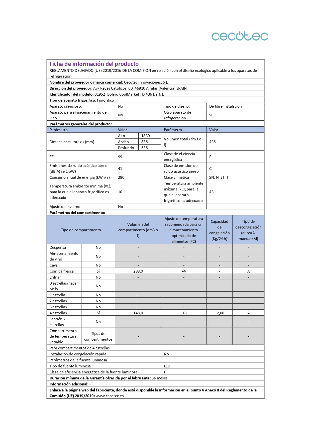Cecotec Réfrigérateur combinés Bolero CoolMarket Combi 205 DF Black. 117L, 169x54cm, Defrost, Classe E, Fast Cooling.