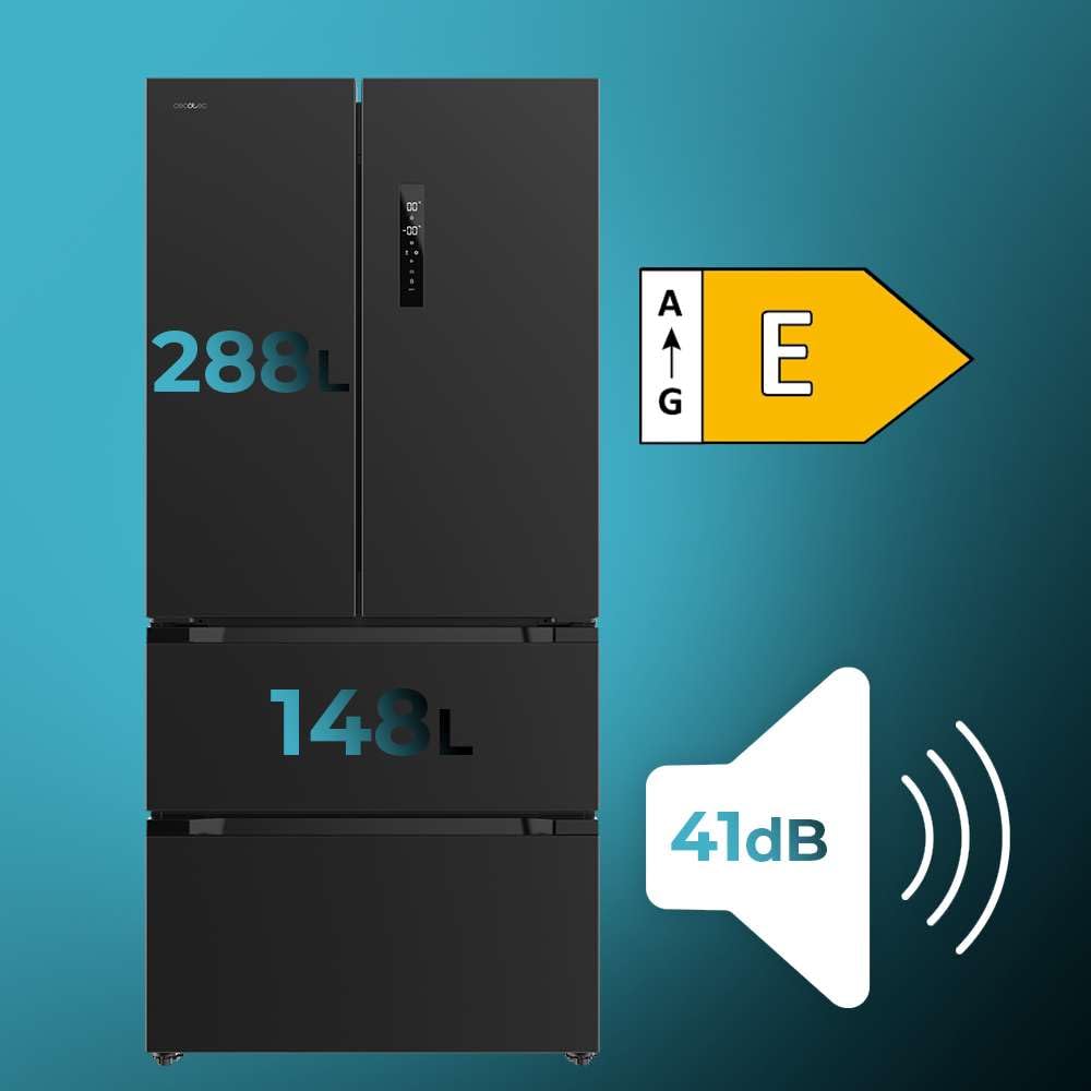 Cecotec Réfrigérateur Porte Française Inox 436L Bolero CoolMarket FD 436 Inox E, 183 x 83,6 cm, Basse Consommation, Compresseur Inverter Plus, Total N