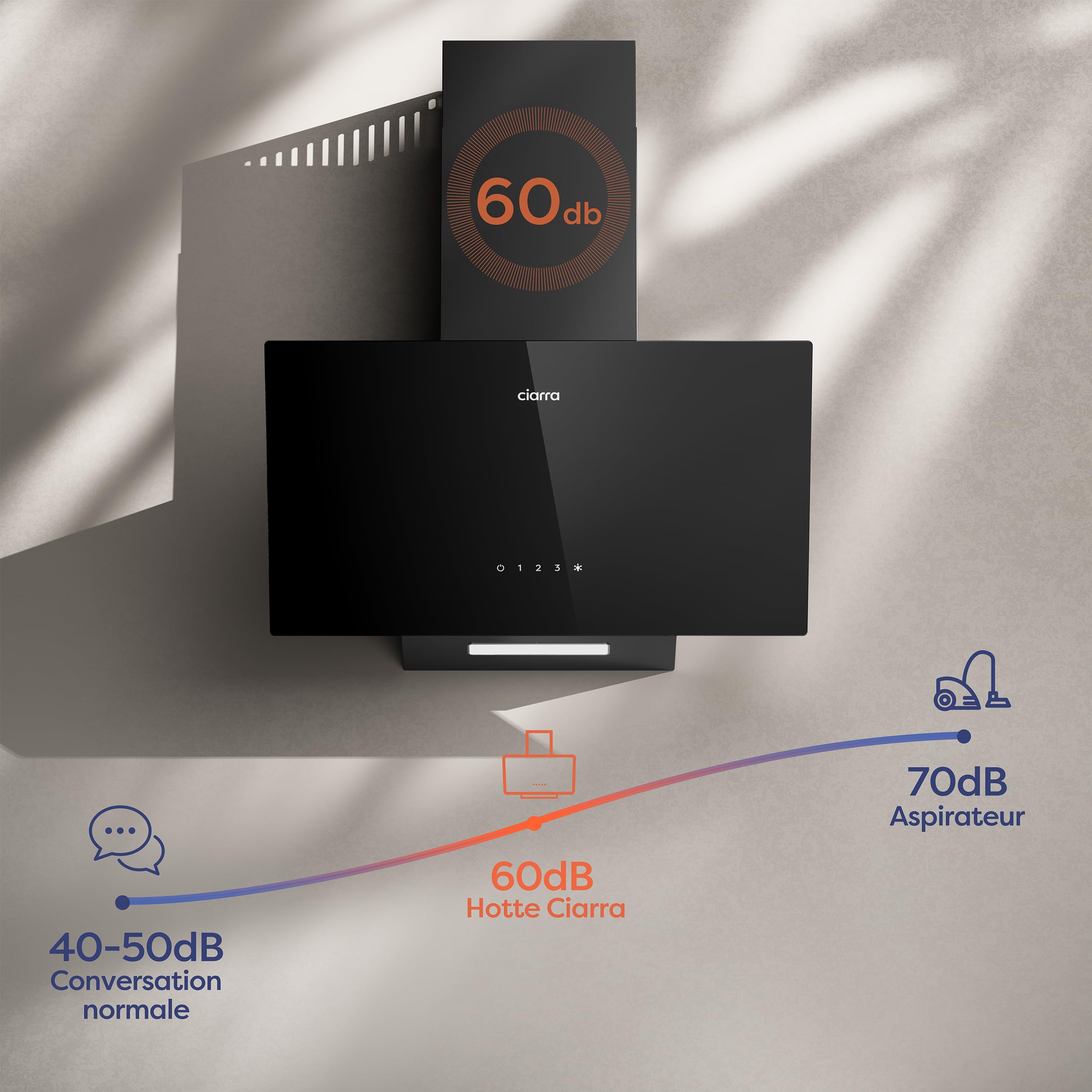 Ciarra CBCB6750C Classe A++ Hotte Murale Inclinée 60 cm 350 m³/h - 3 Vitesses - Mode Recyclage ou Evacuation - Filtre Charbon CBCF002 Inclus - Contrôl