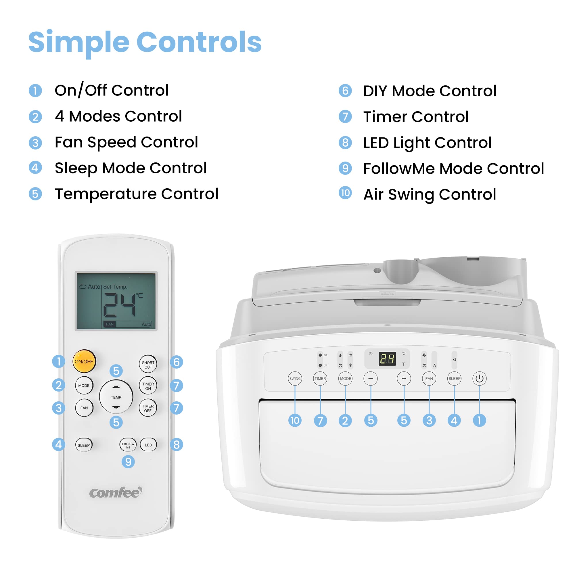 COMFEE' Climatiseur Mobile 8000 BTU/h 2,3kW, 3-EN-1 Refroidisseur Déshumidificateur Ventilateur, Fonction Follow me, Minuterie, Pour salon et appartem