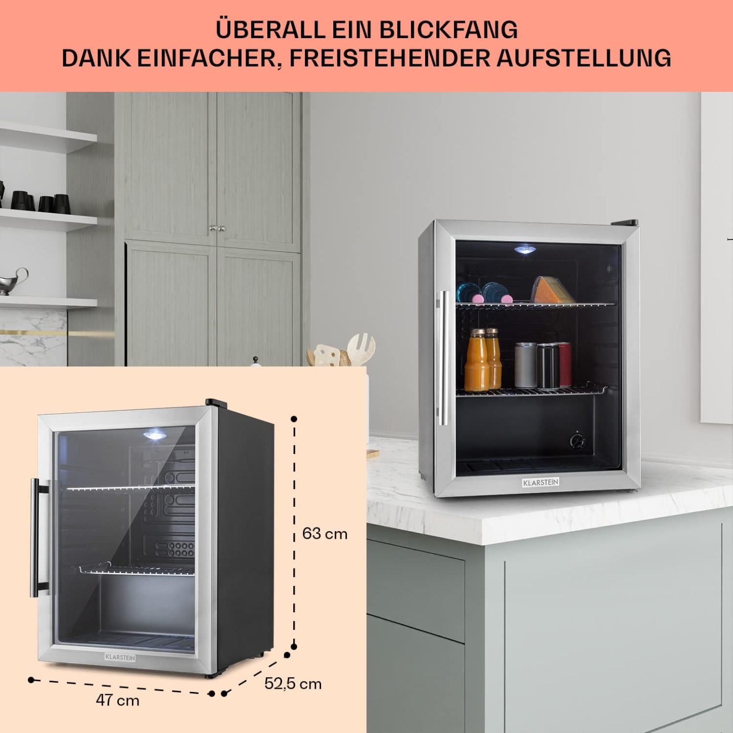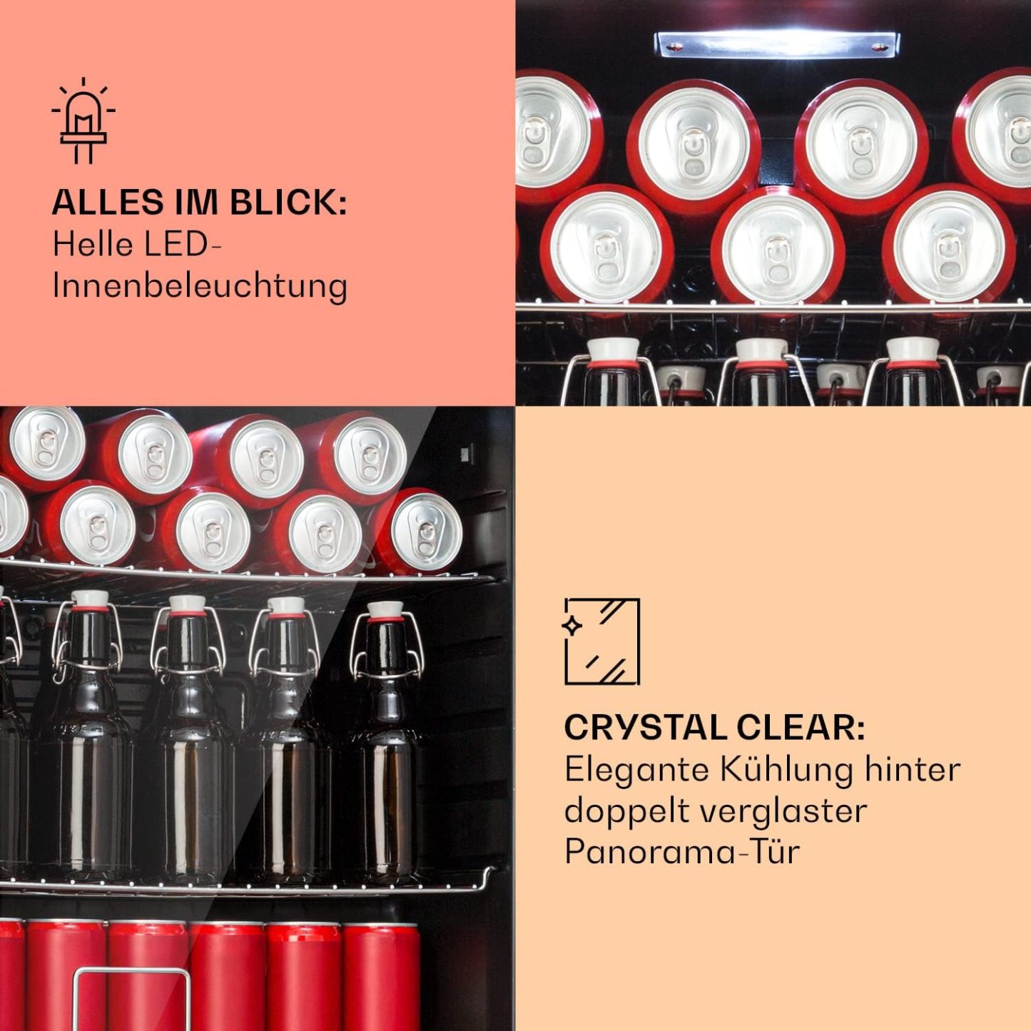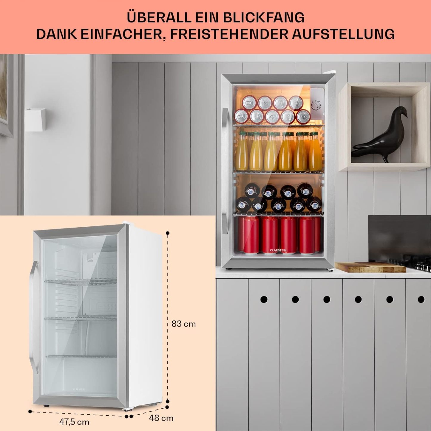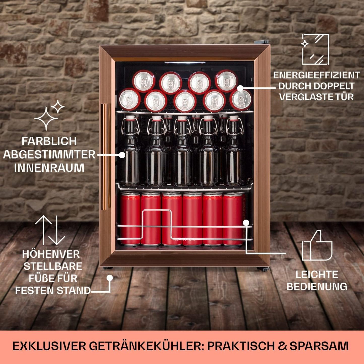 Klarstein Mini Kühlschrank mit Glastür für Zimmer, Getrnkekühlschrank mit Verstellbaren Ablagen, Kleiner 80 Liter, Indoor/Outdoor Kühlschrank Leise