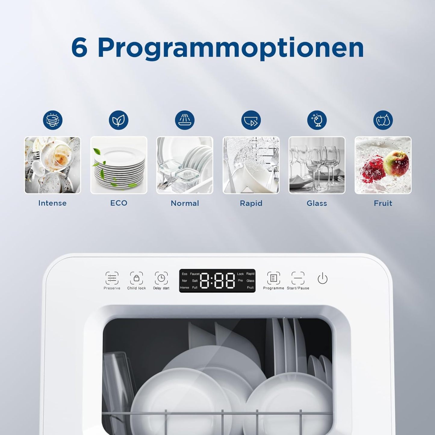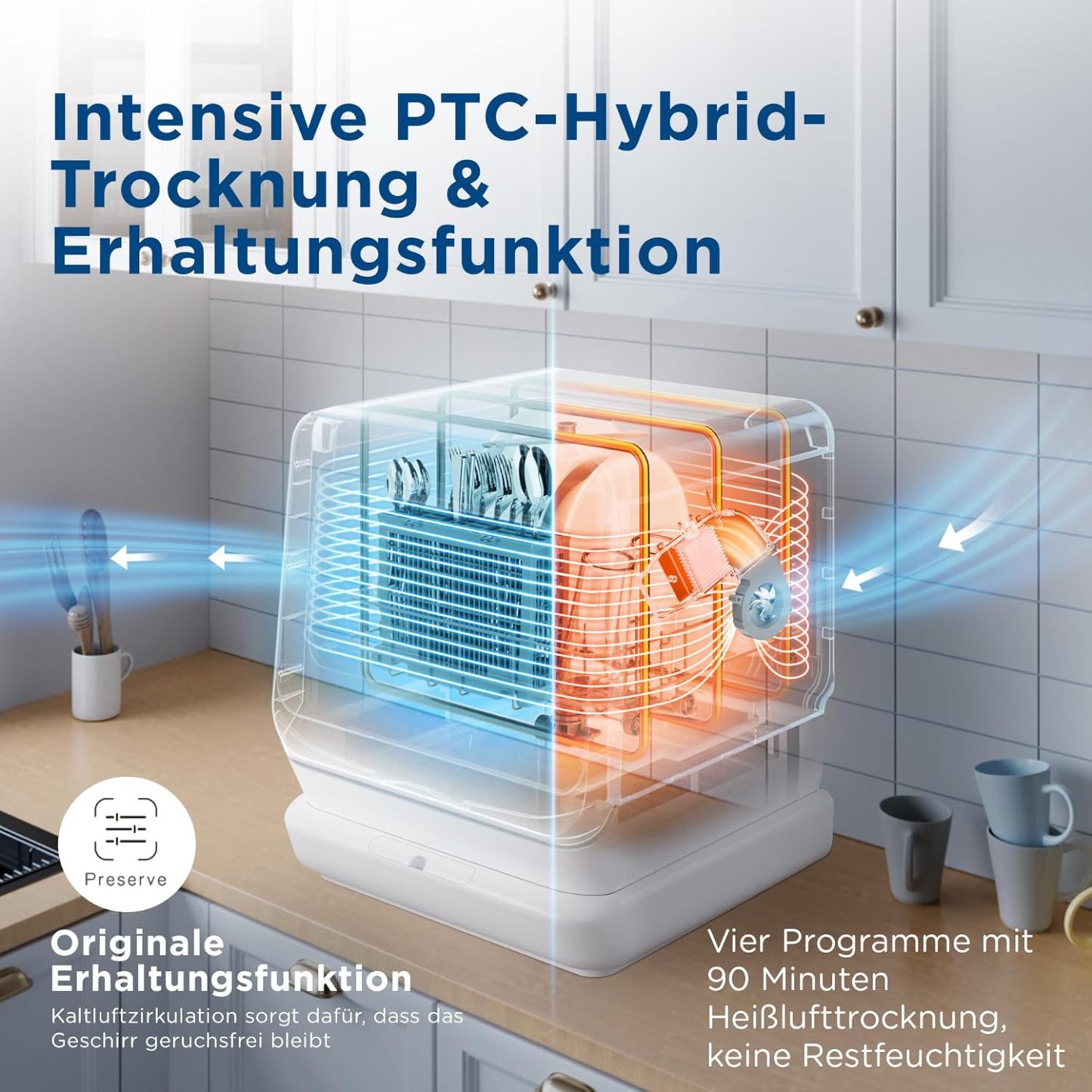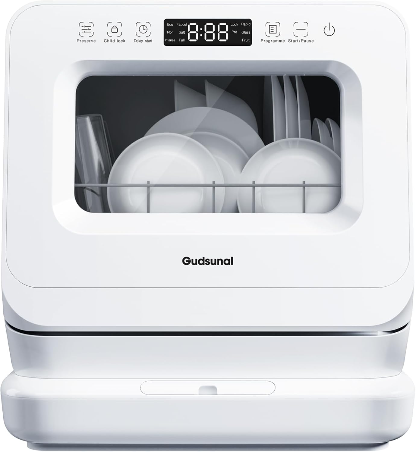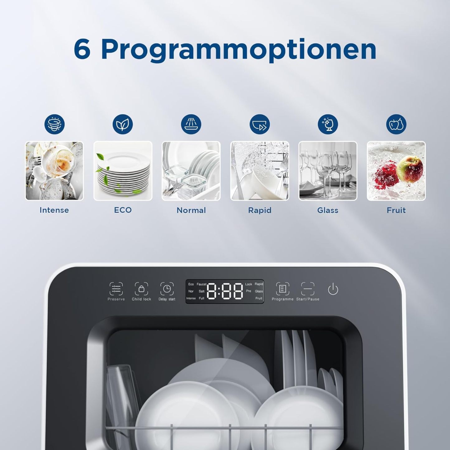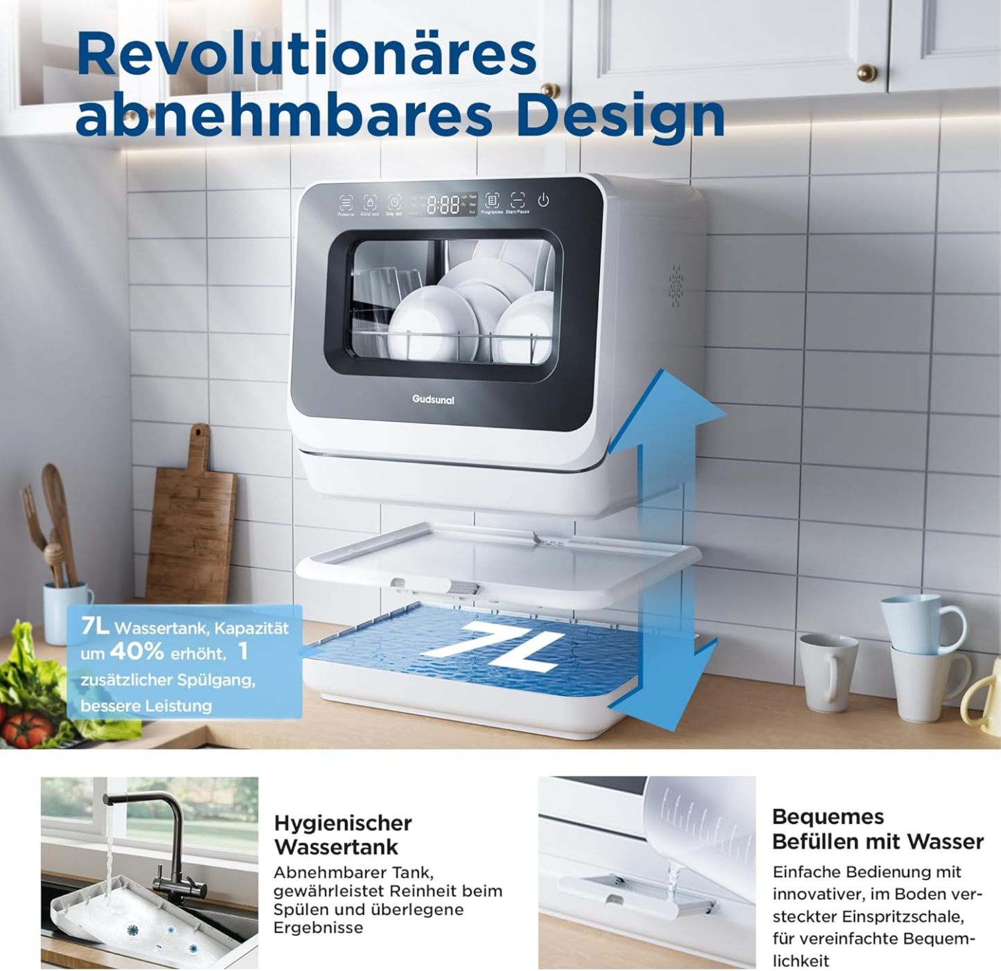 Gudsunal Tischgeschirrspüler, Mini Geschirrspüler mit 7L Wassertank,ohne Wasseranschluss, 6 Programme,72°C Hochtemperatur-Hygiene,Hybrid-Trocknung & Erhaltungsfunktion, Spülmaschine klein für Camping