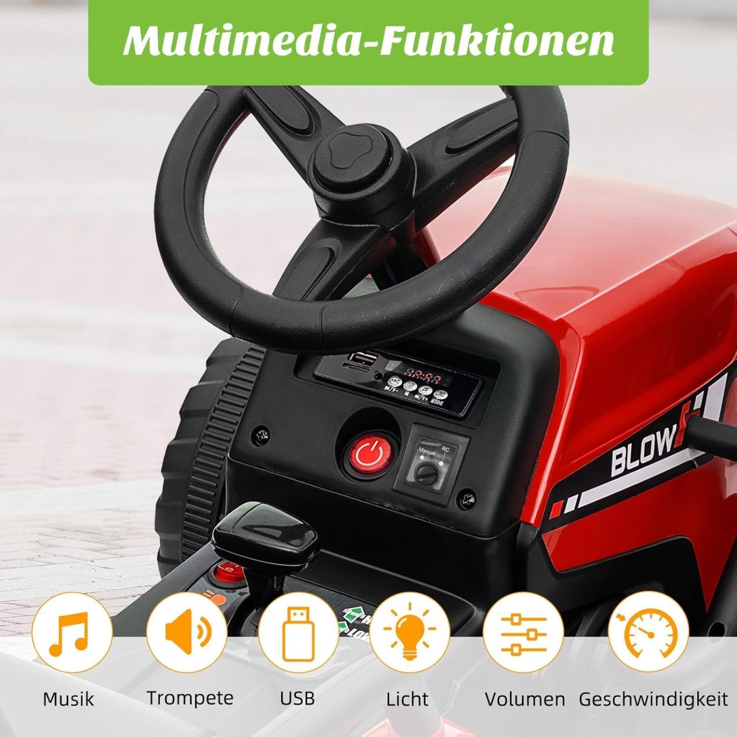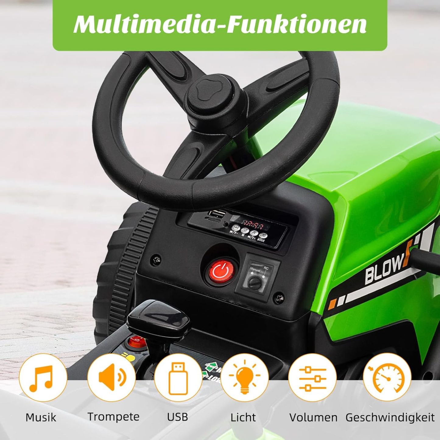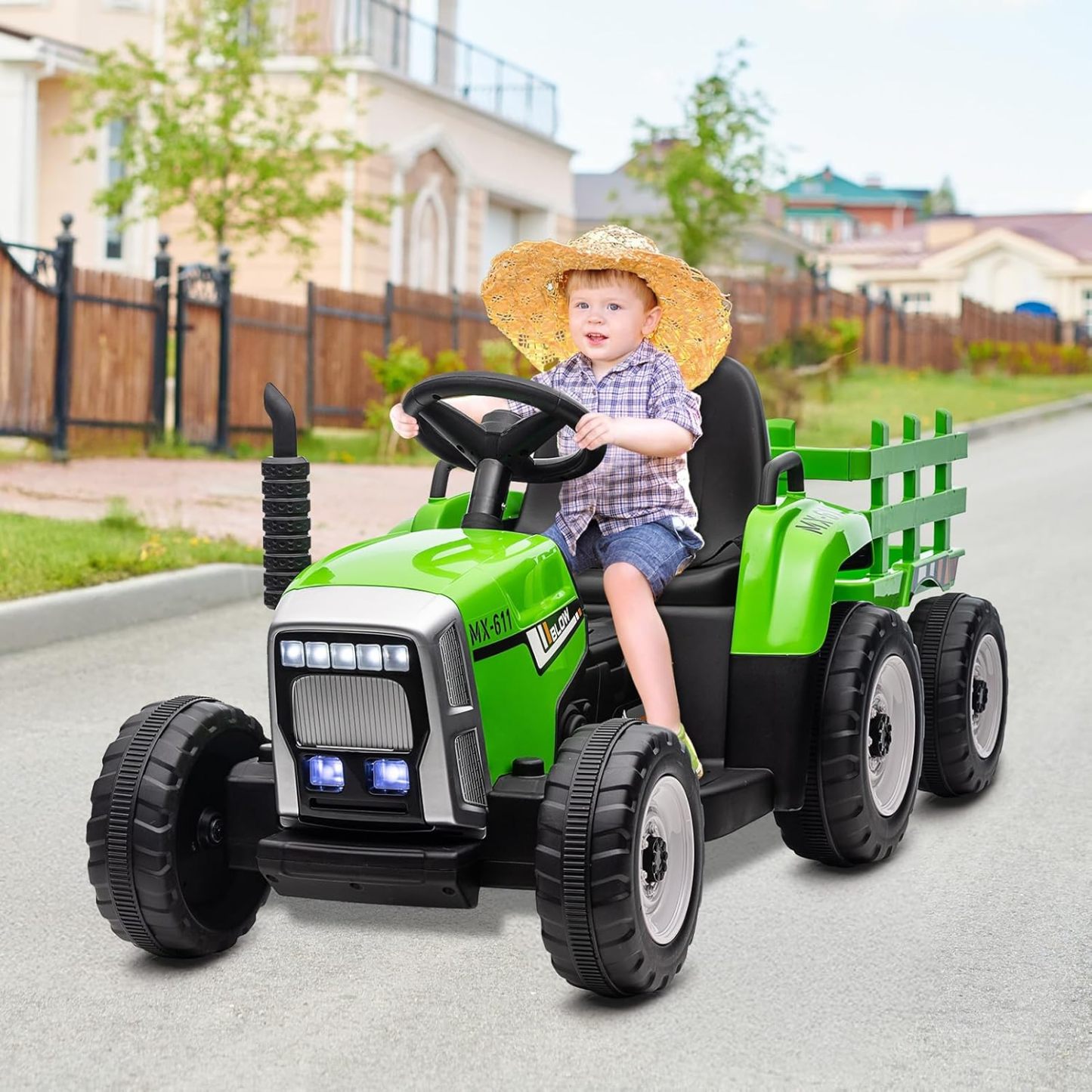 HAUSPROFI 12V 3-Gang Kinder Elektroauto mit Anhänger, Elektro Traktor 2 Fahrmodi, 2,4G-Fernbedienung, Kinder Traktor LED-Licht, Bluetooth, Musik, USB, Elektrischer Traktor für kinder ab 3 Jahren, Grün