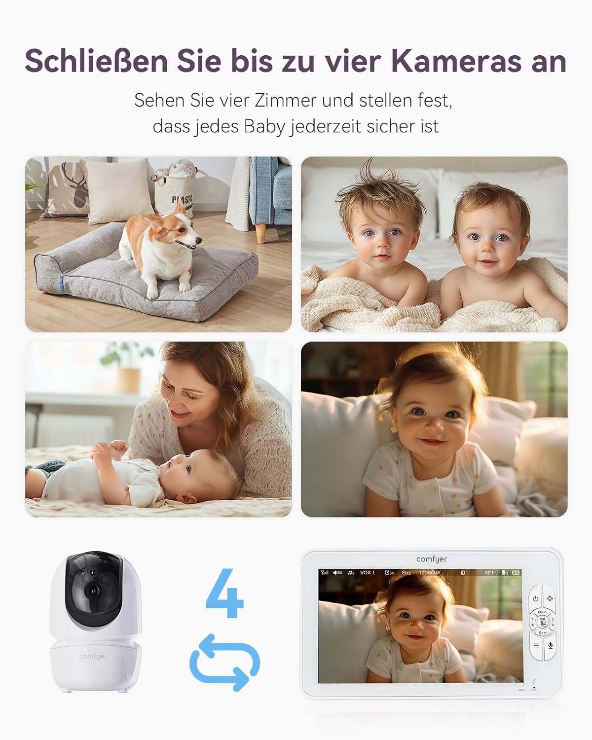 Comfyer Split-Screen Babyphone mit 2 Kameras, 7 HD 720P Video Babyphone ohne WLAN mit Halterung, IR-Nachtsicht Weitwinkelobjektiv Vox-Modus 2-Wege-Audio 960 Fuß Reichweite Videoüberwachungsgeräte
