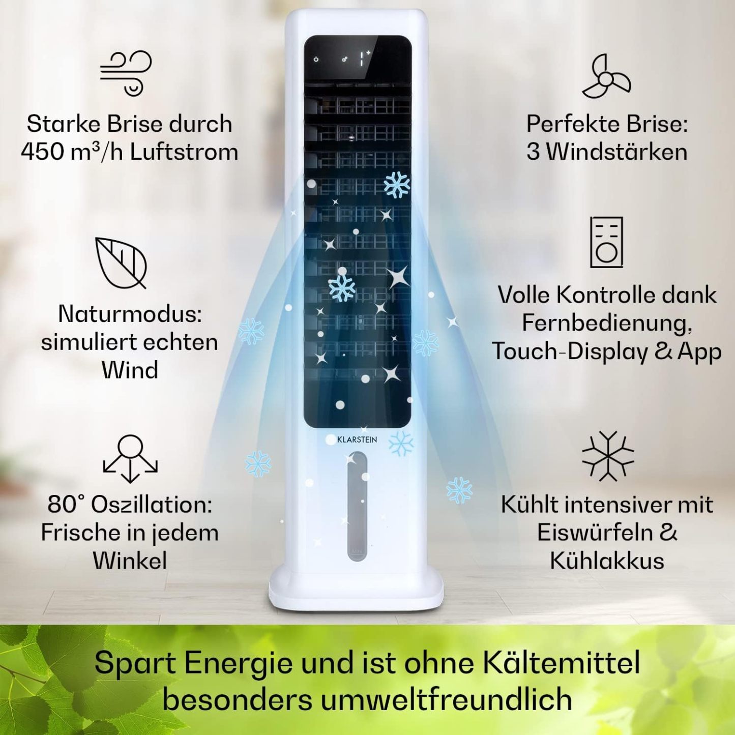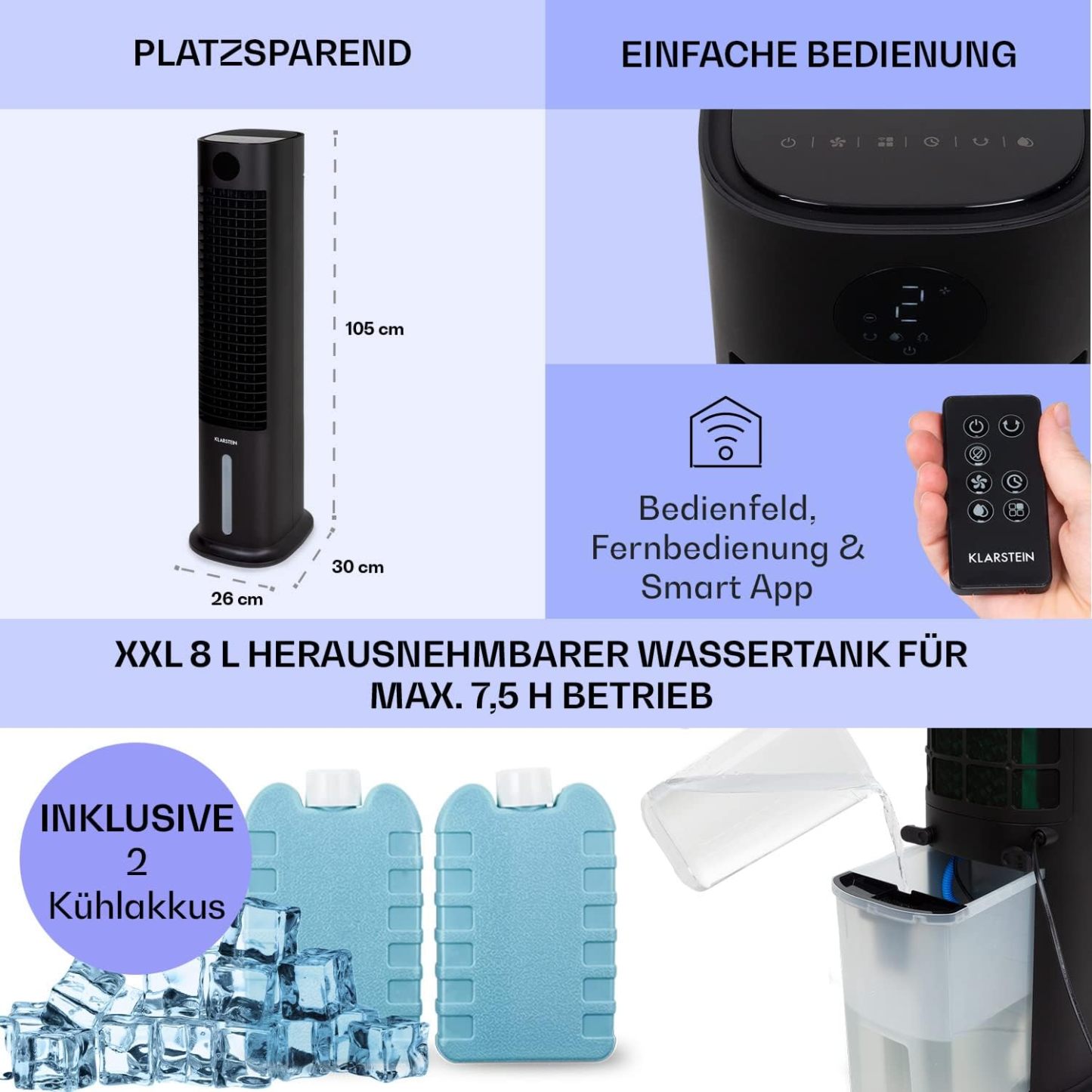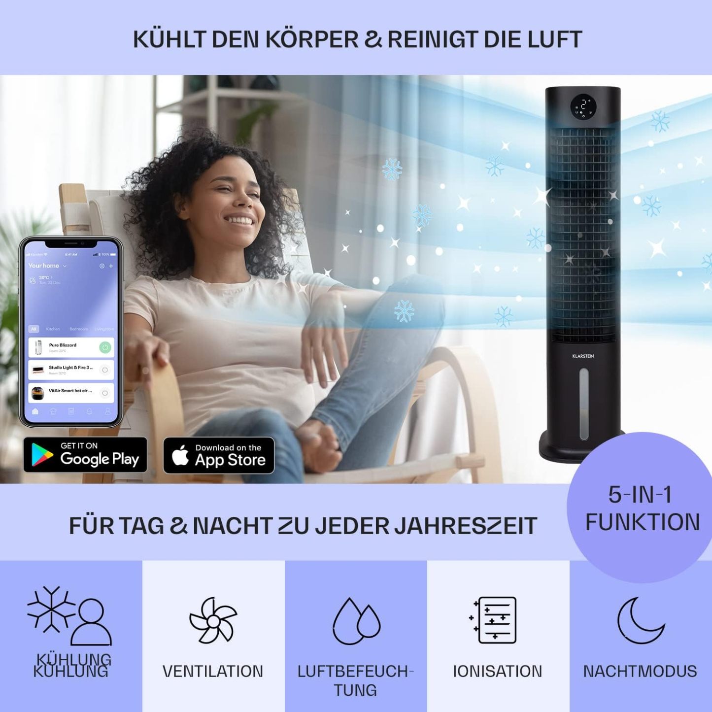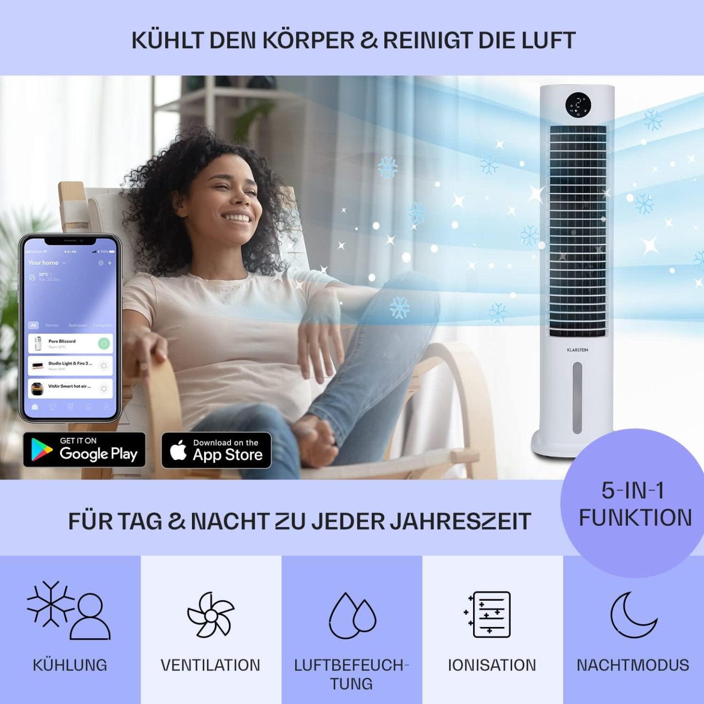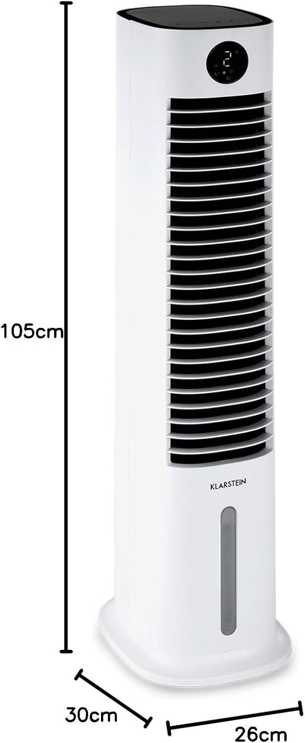 Klarstein Luftkühler mit Wasserkühlung, 5-in-1 Verdunstungskühler, Luftbefeuchter, Ventilator & Luftreiniger, Mobile Klimageräte Luftkühler mit App-Steuerung, 80W Air Cooler, 462m³/h Luftstrom, Weiß
