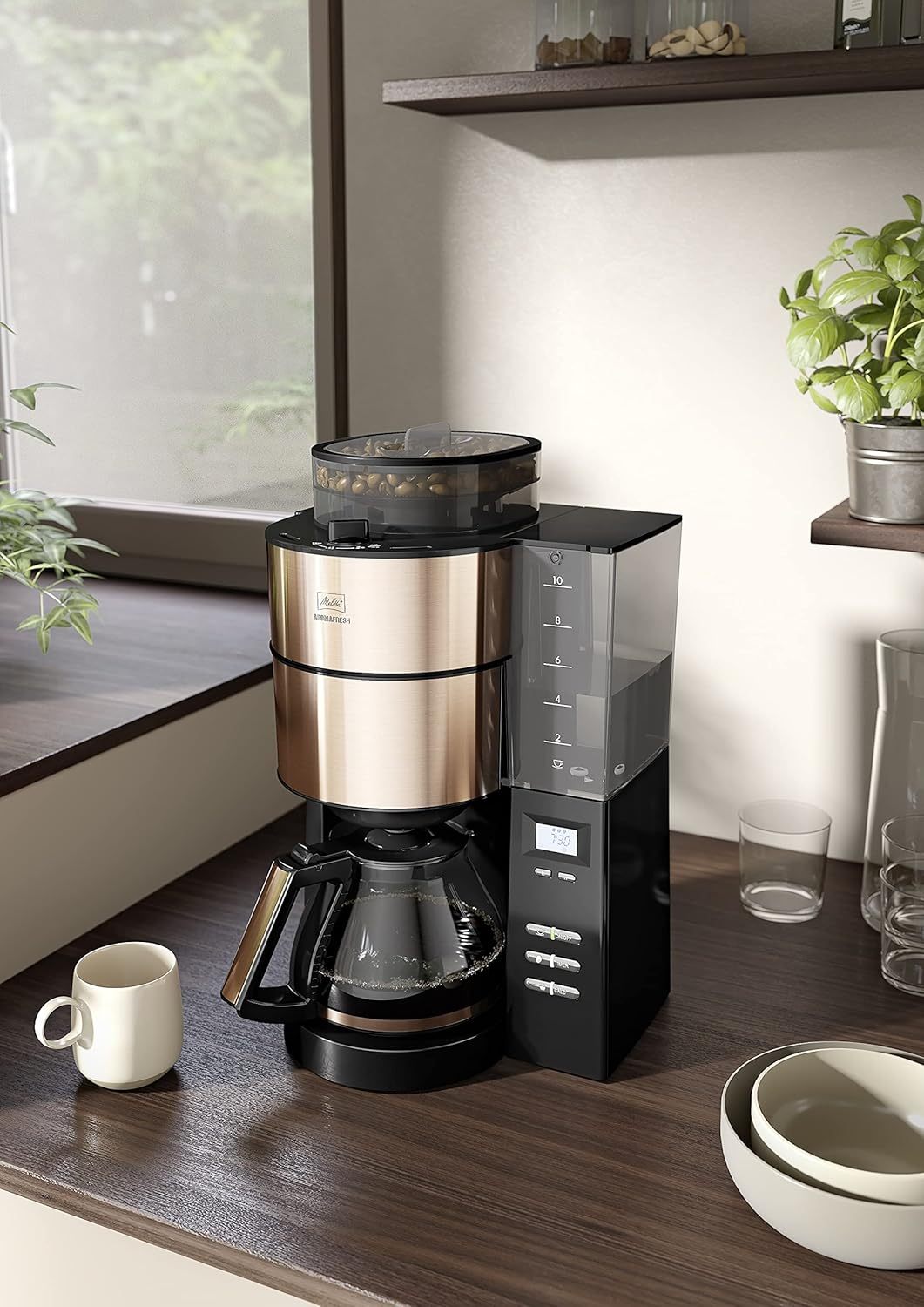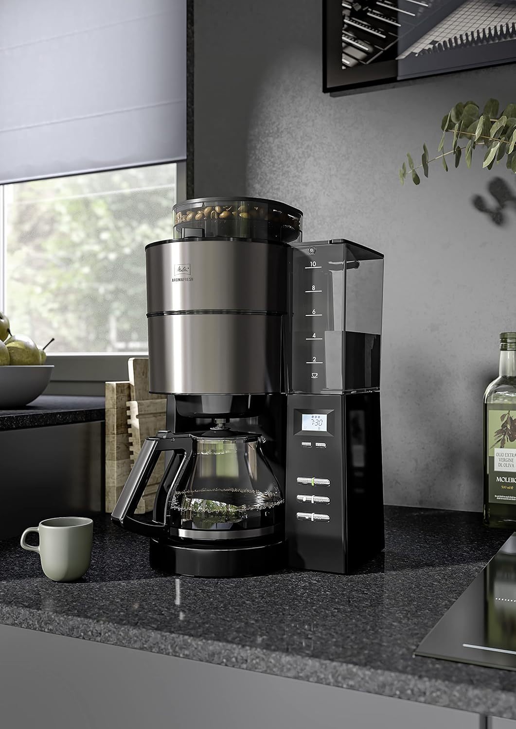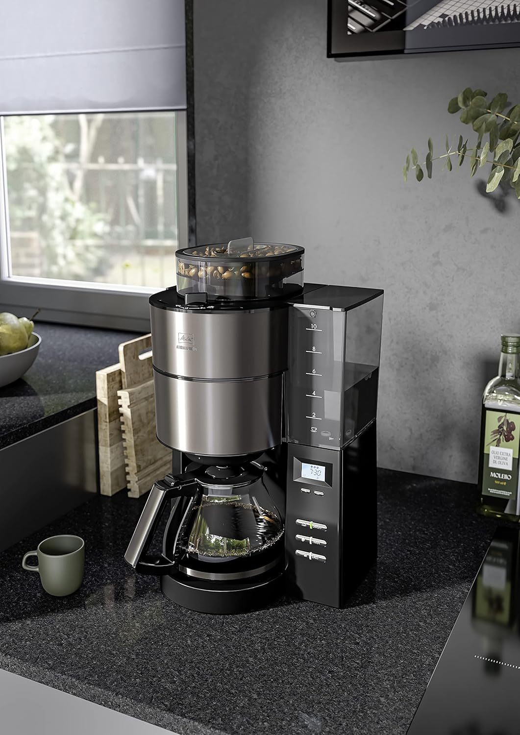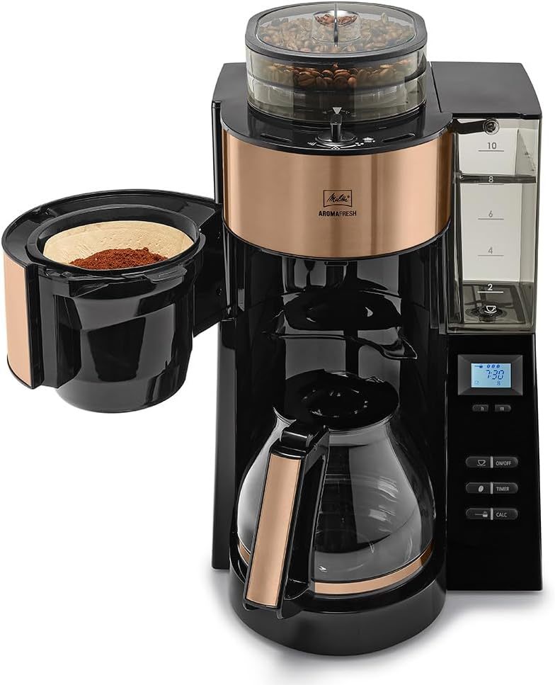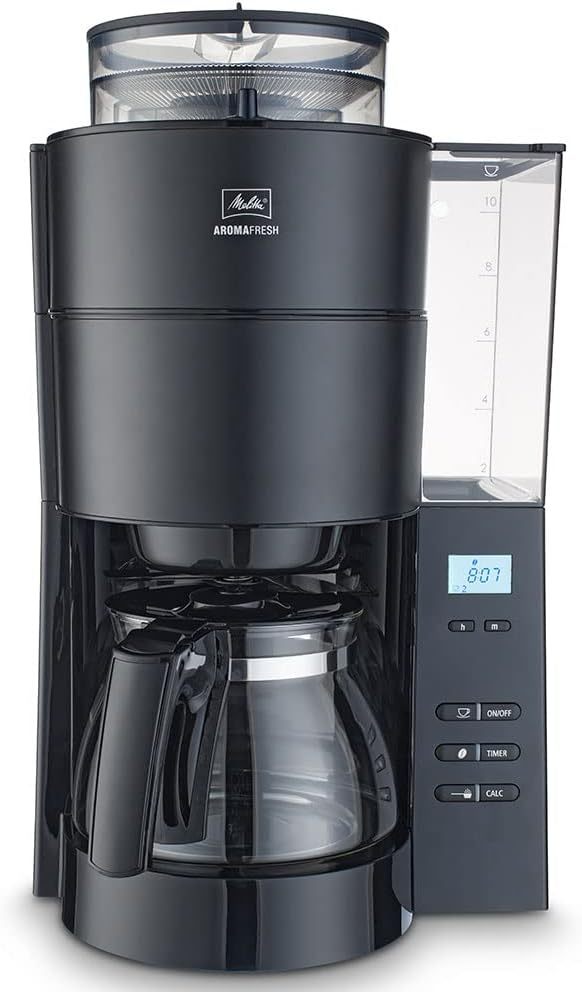 Melitta AromaFresh - Filterkaffeemaschine - mit Glaskanne - integriertes Mahlwerk - Timer Funktion - 10 Tassen - Pure Black