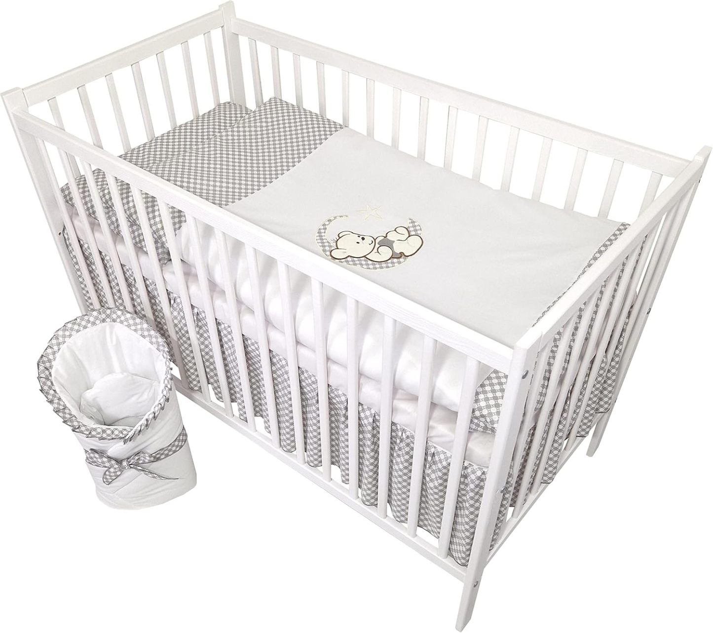 Bello24 - 16 Teiliges Babybett Kinderbett und Bettwäsche komplett Set Happy Leo inkl. Matratze höhenverstellbar für Neugeborene Babys und Kleinkinder aus Massivholz (Grau - Teddybär Mond)