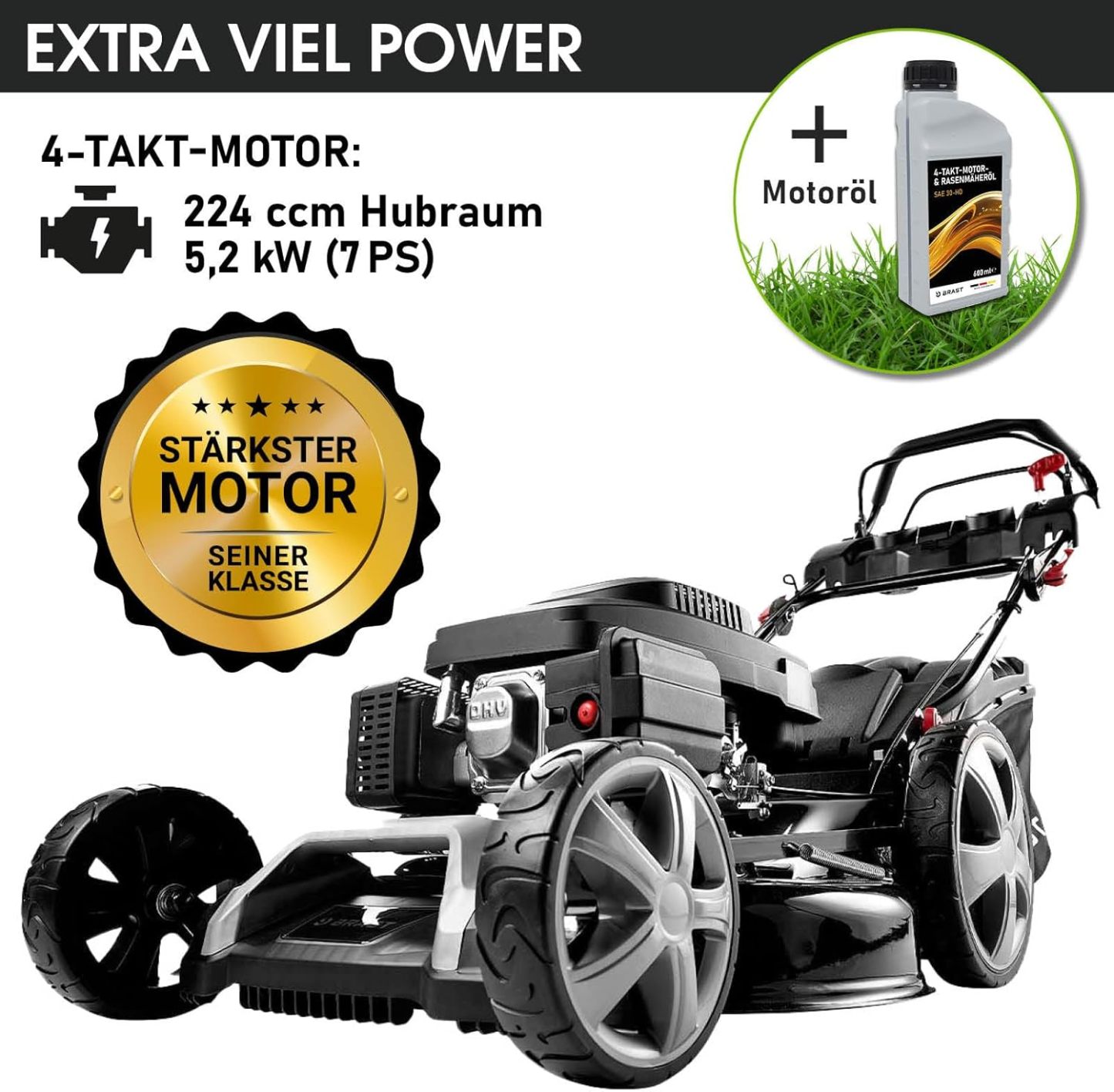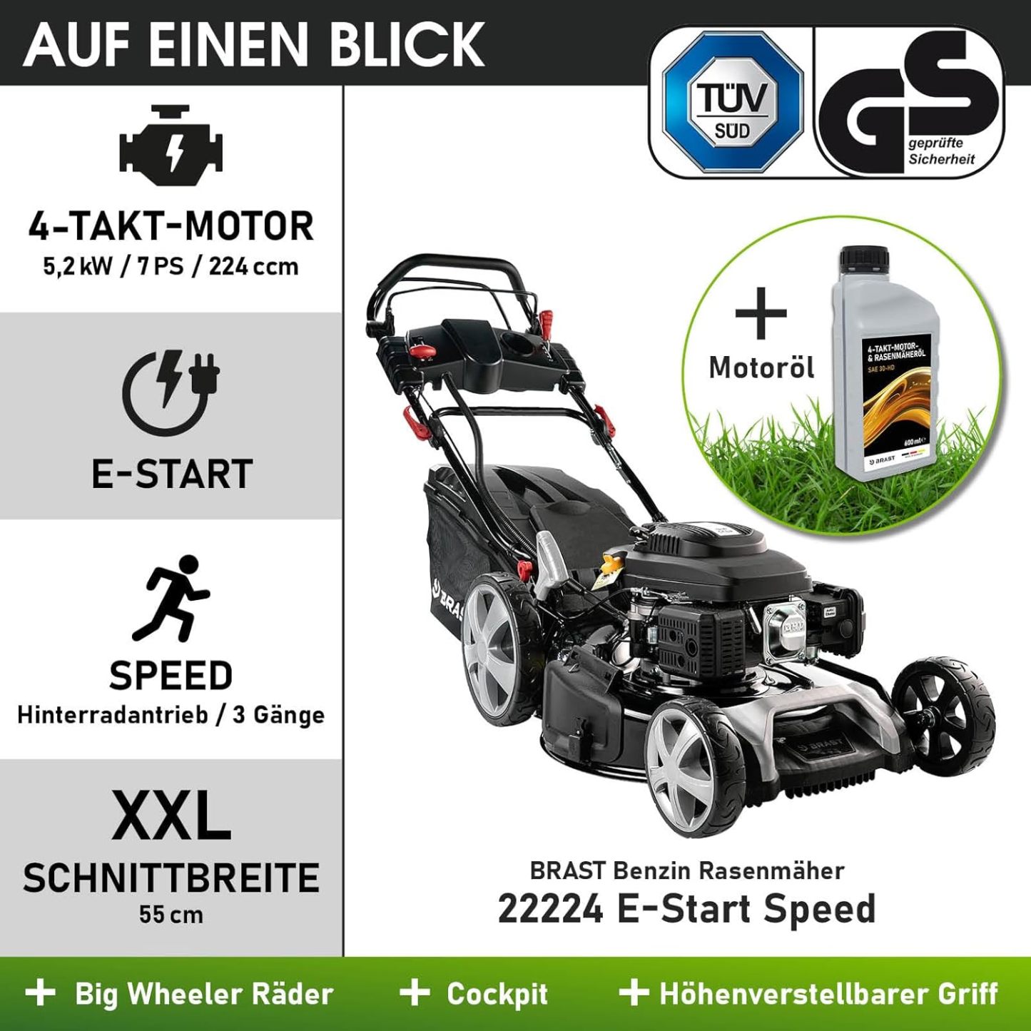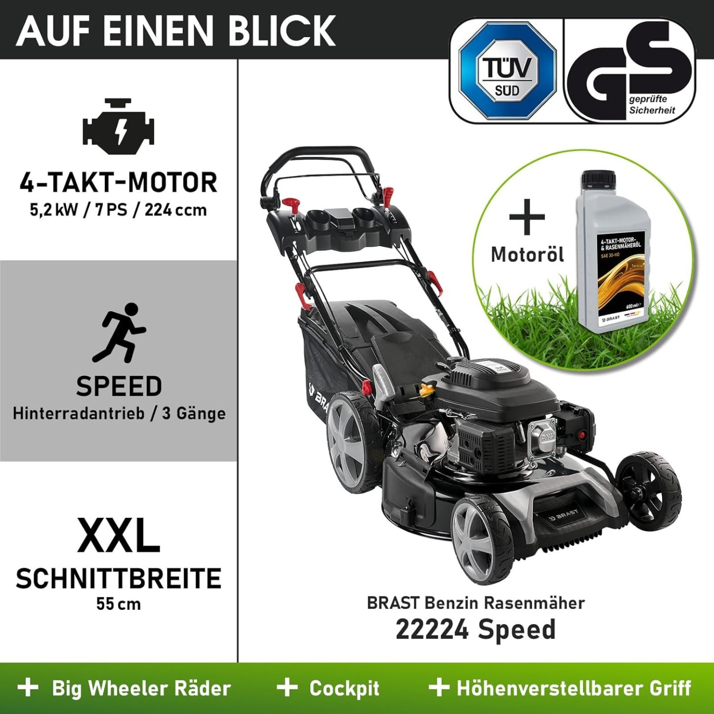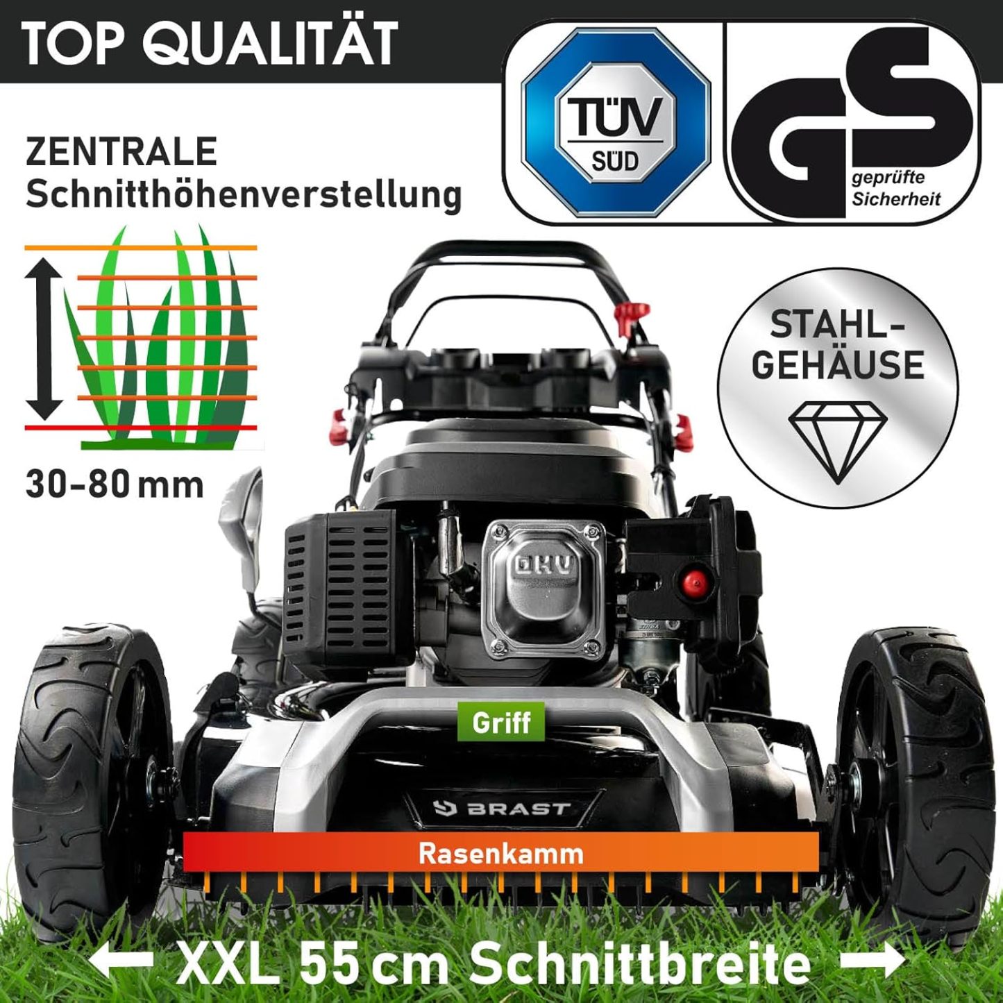 BRAST Benzin Rasenmäher mit Antrieb | 5,2kW (7PS) | 55cm Schnittbreite | viele Modelle | TÜV | 30-80mm Schnitthöhe | 60L Fangkorb | 4 Takt OHV Motor | Stahlgehäuse | Power