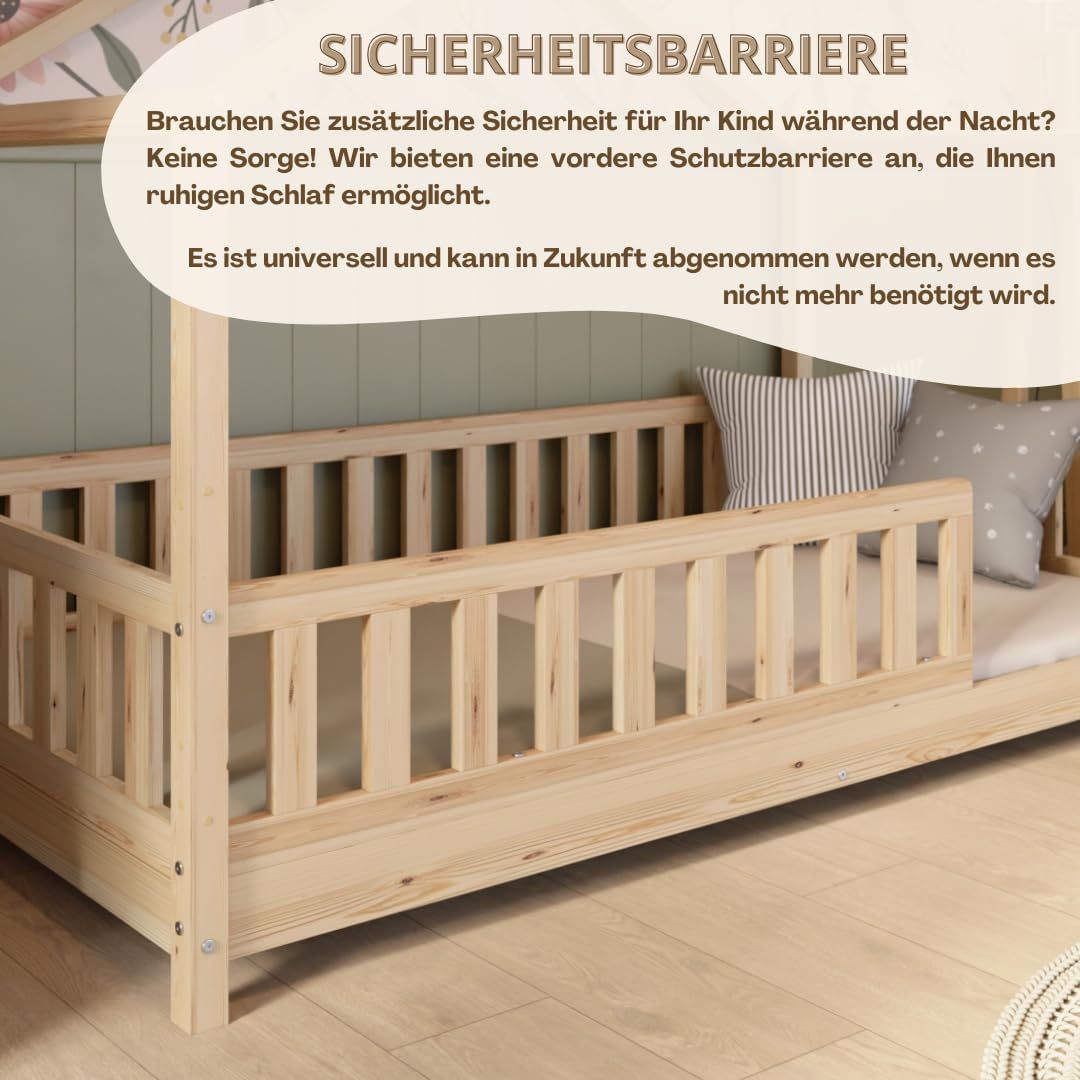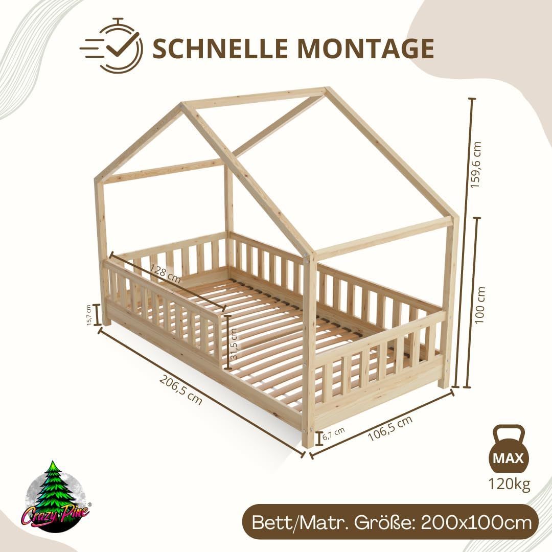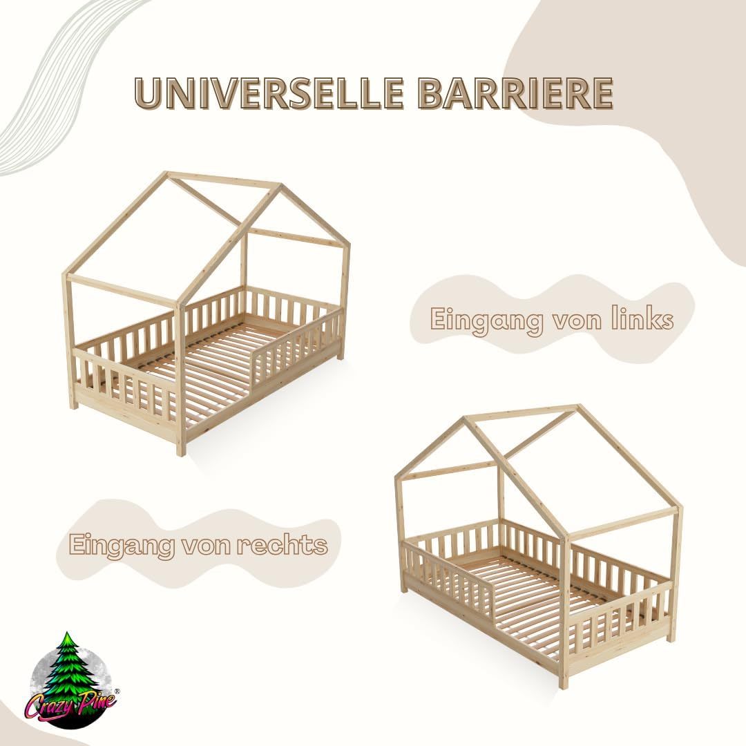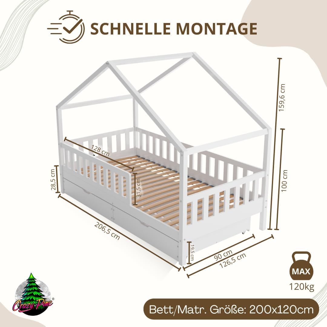 Crazy Pine Hausbett mit Schubladen 200x90 cm – Kinderbett aus Naturholz mit Rausfallschutz – Montessori Bodenbett mit zusätzlichen Stauraum und und Abnehmbarer Barriere - Crazy House
