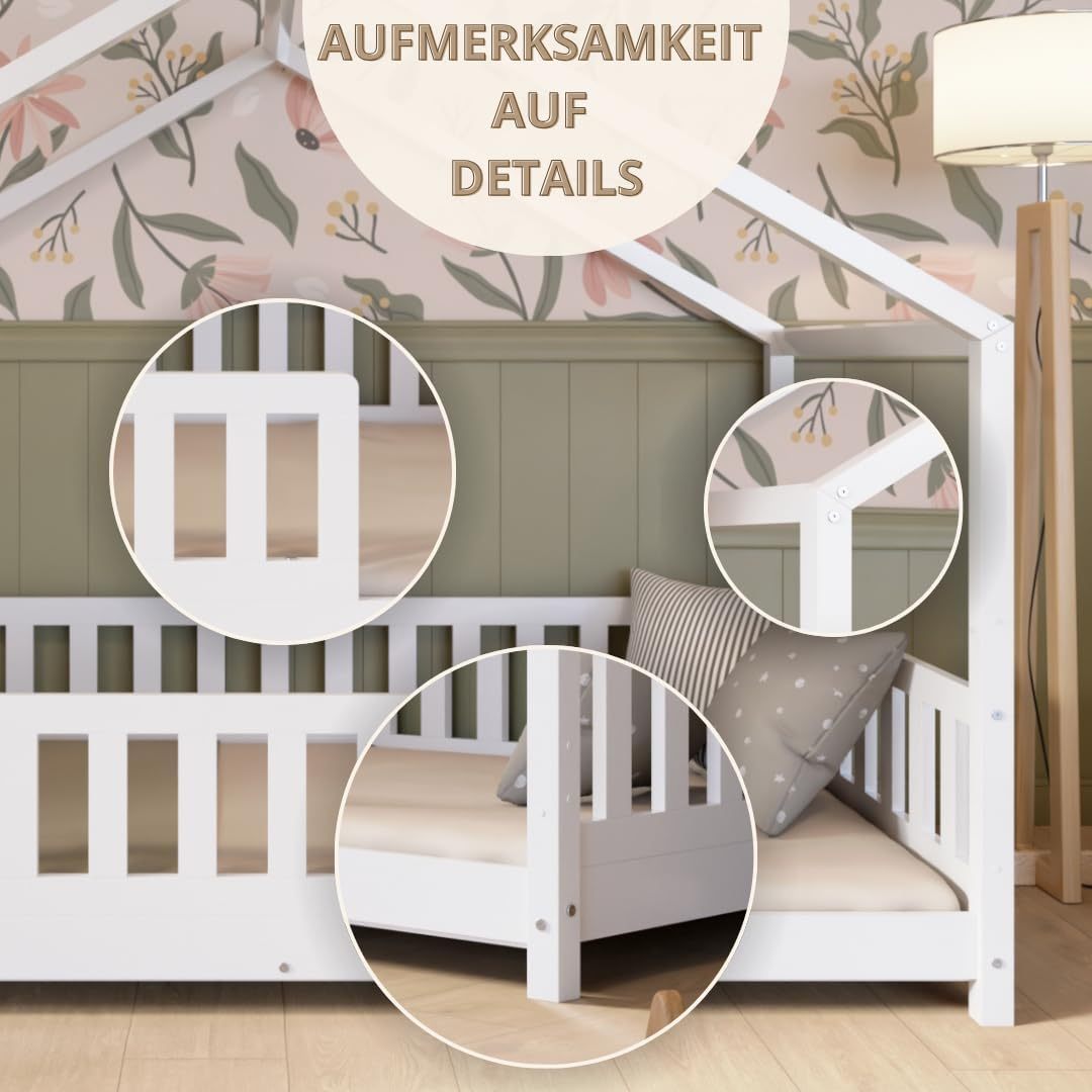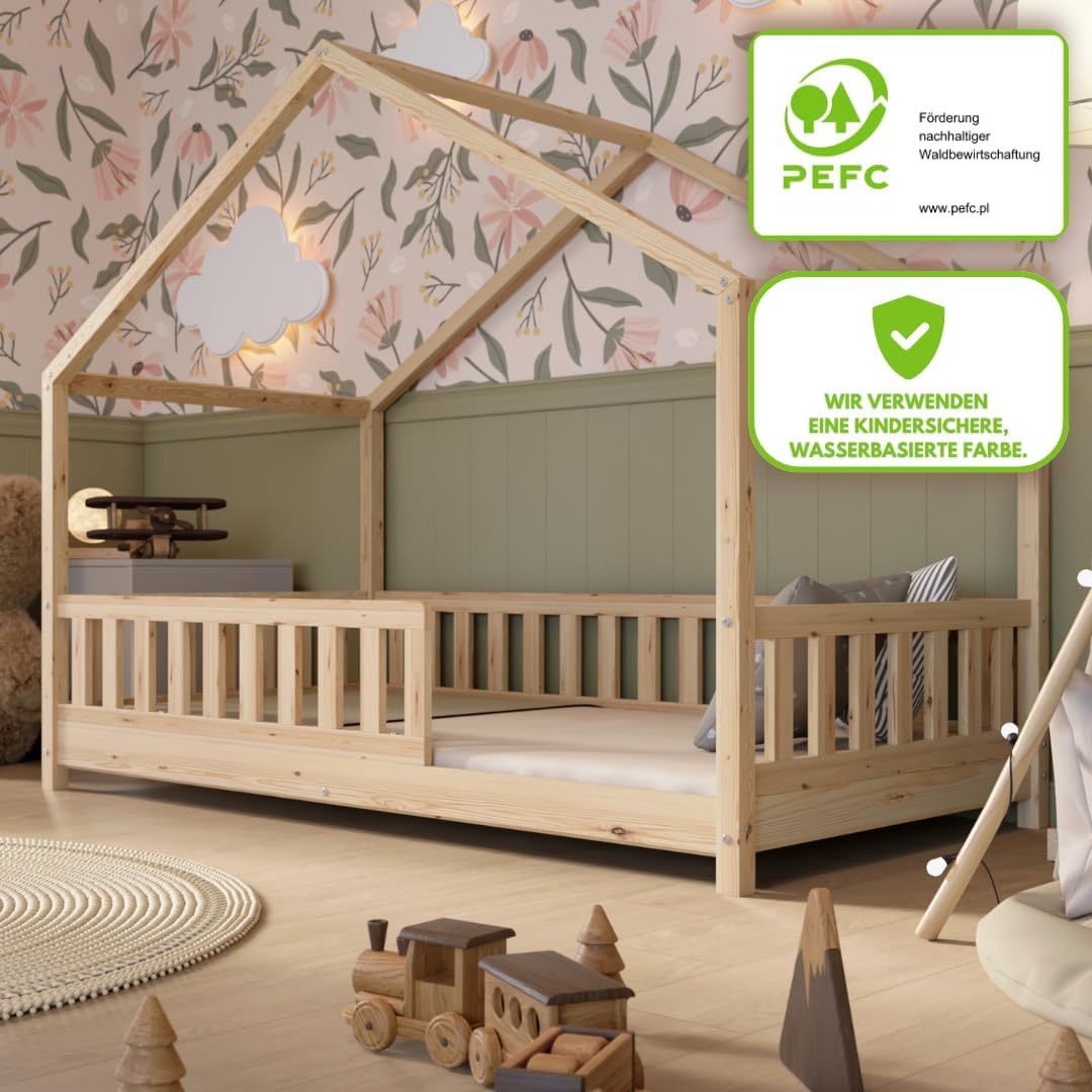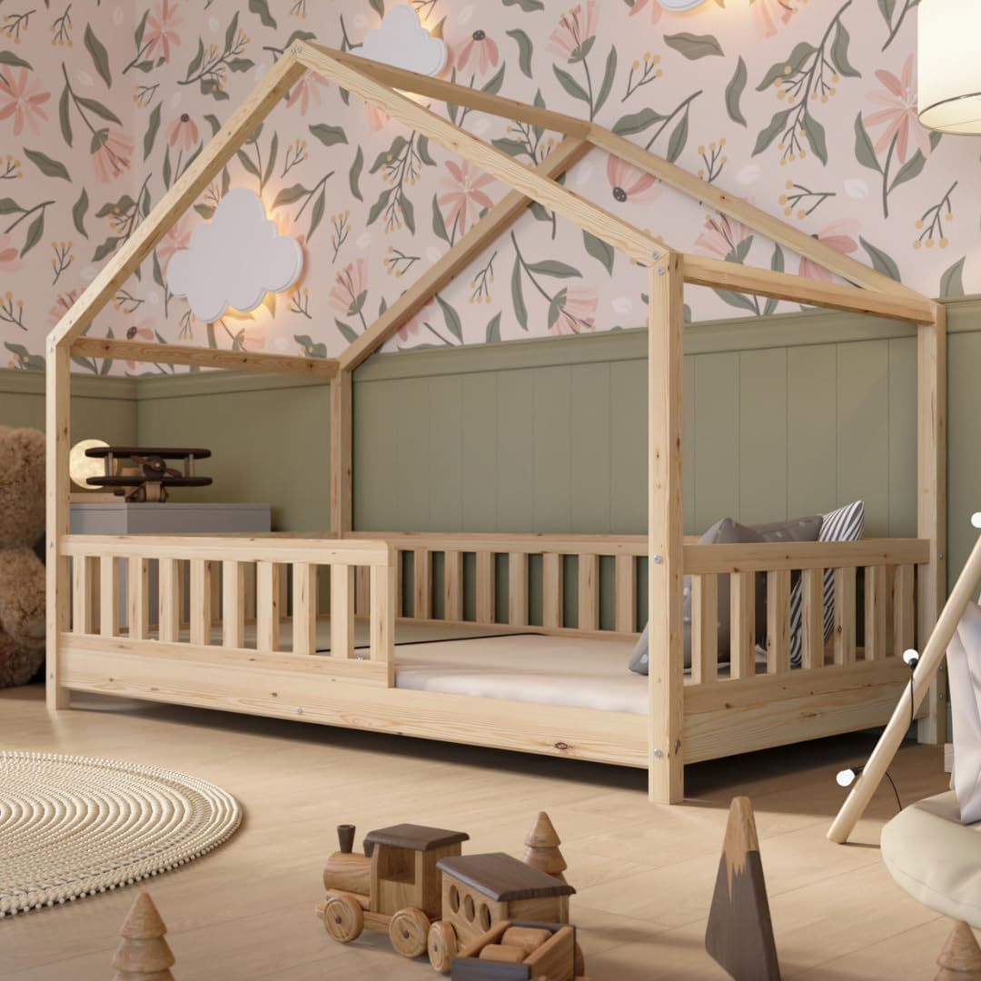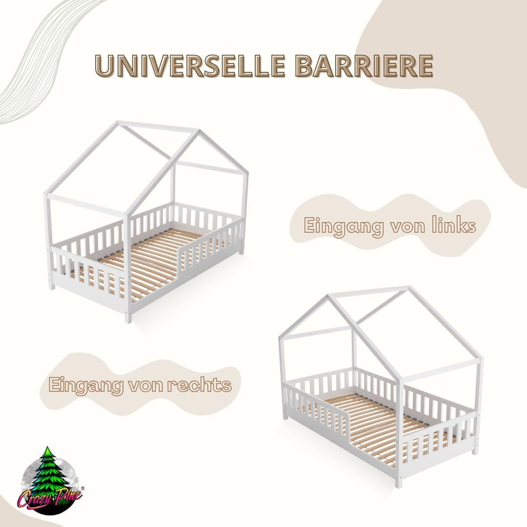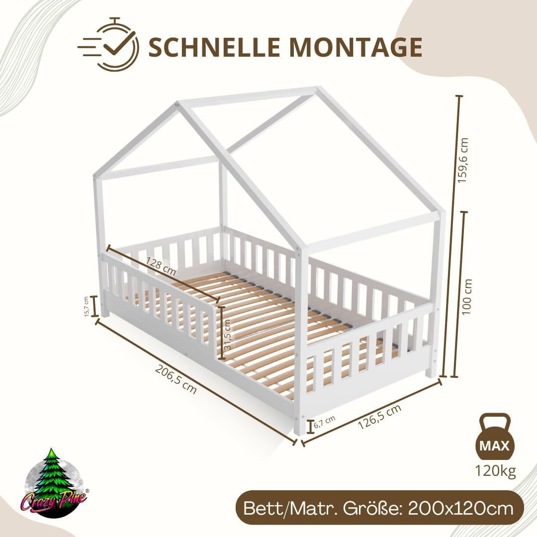Crazy Pine Hausbett mit Schubladen 200x90 cm – Kinderbett aus Naturholz mit Rausfallschutz – Montessori Bodenbett mit zusätzlichen Stauraum und und Abnehmbarer Barriere - Crazy House