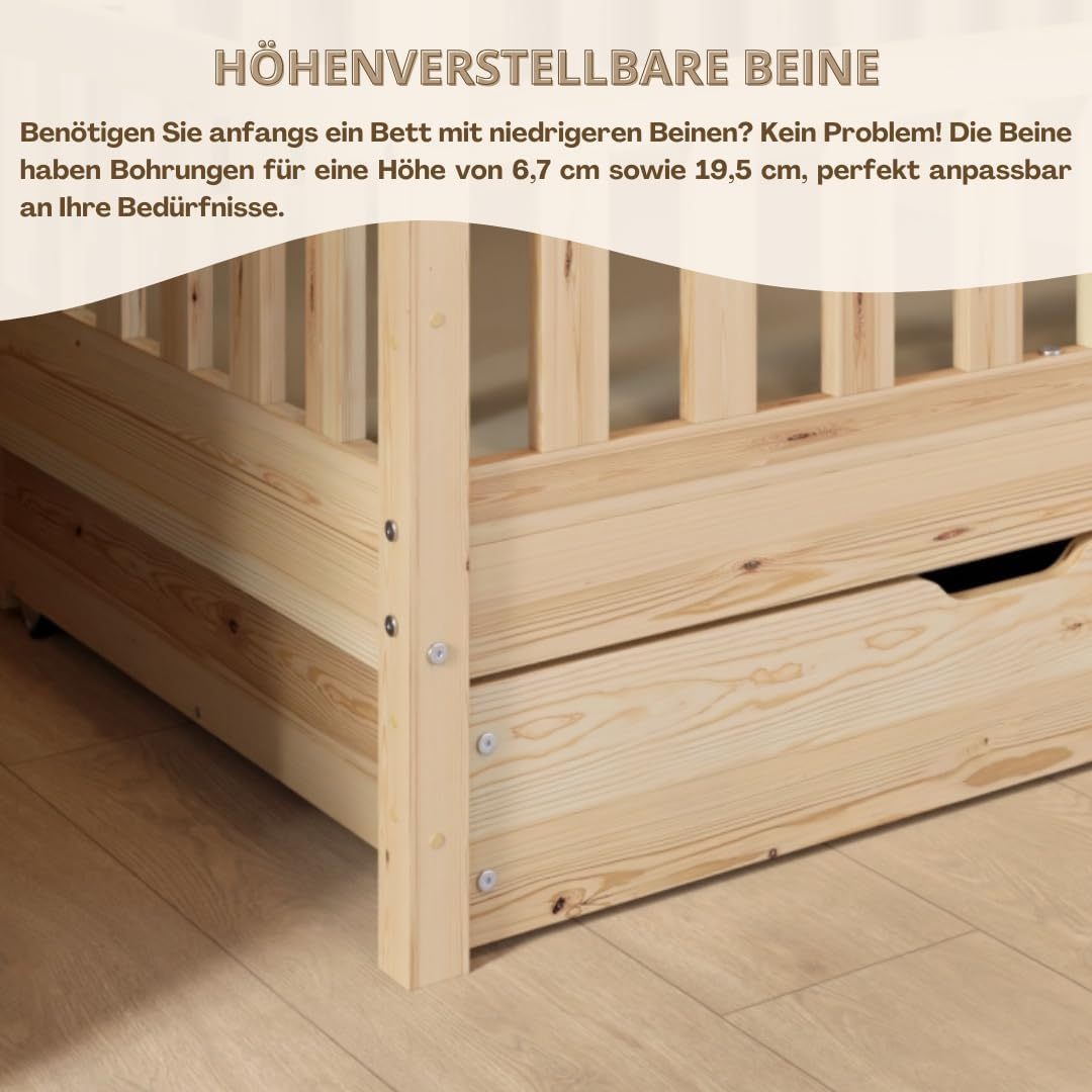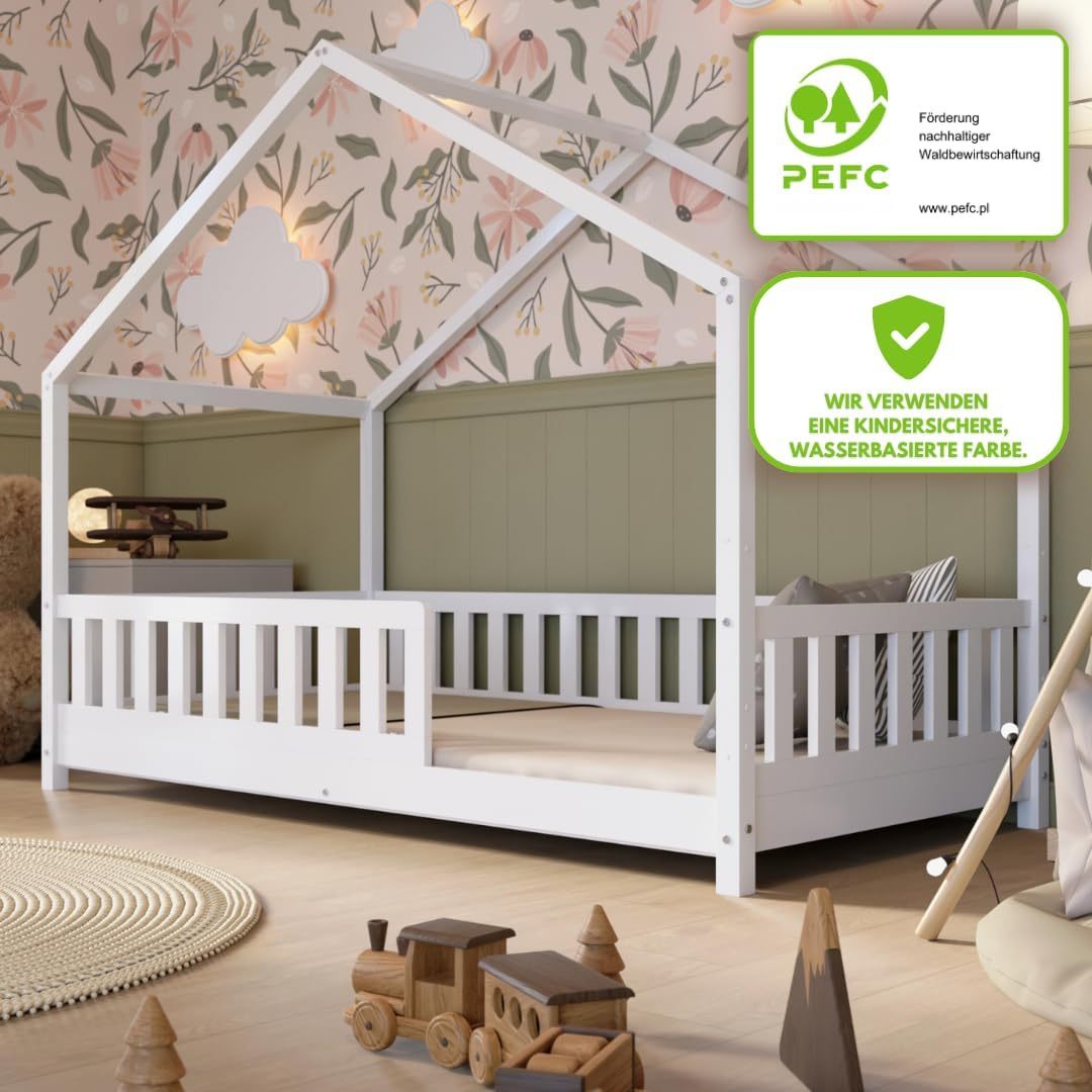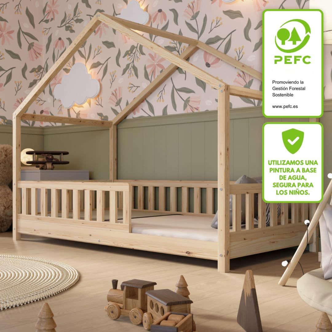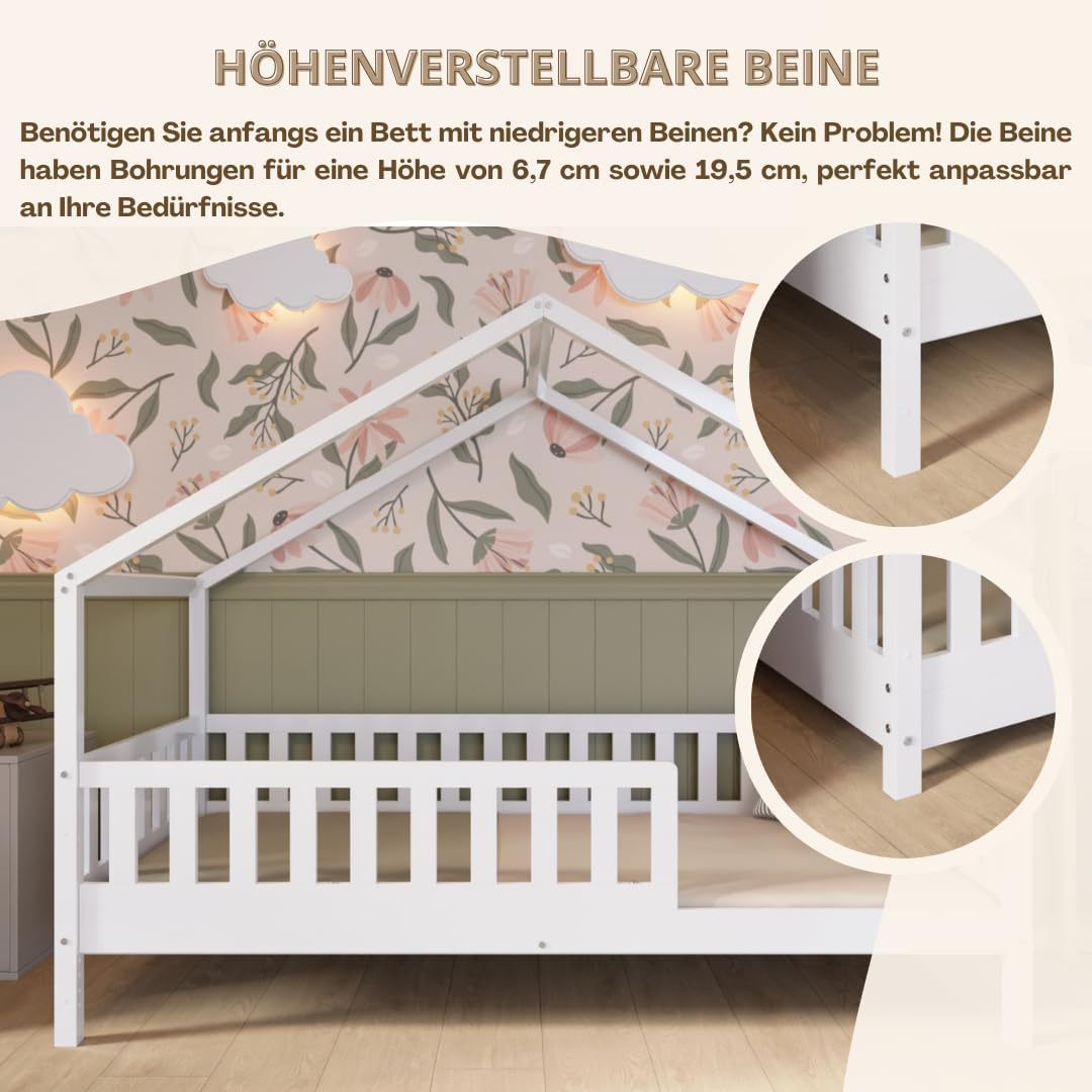 Crazy Pine Hausbett mit Schubladen 200x90 cm – Kinderbett aus Naturholz mit Rausfallschutz – Montessori Bodenbett mit zusätzlichen Stauraum und und Abnehmbarer Barriere - Crazy House