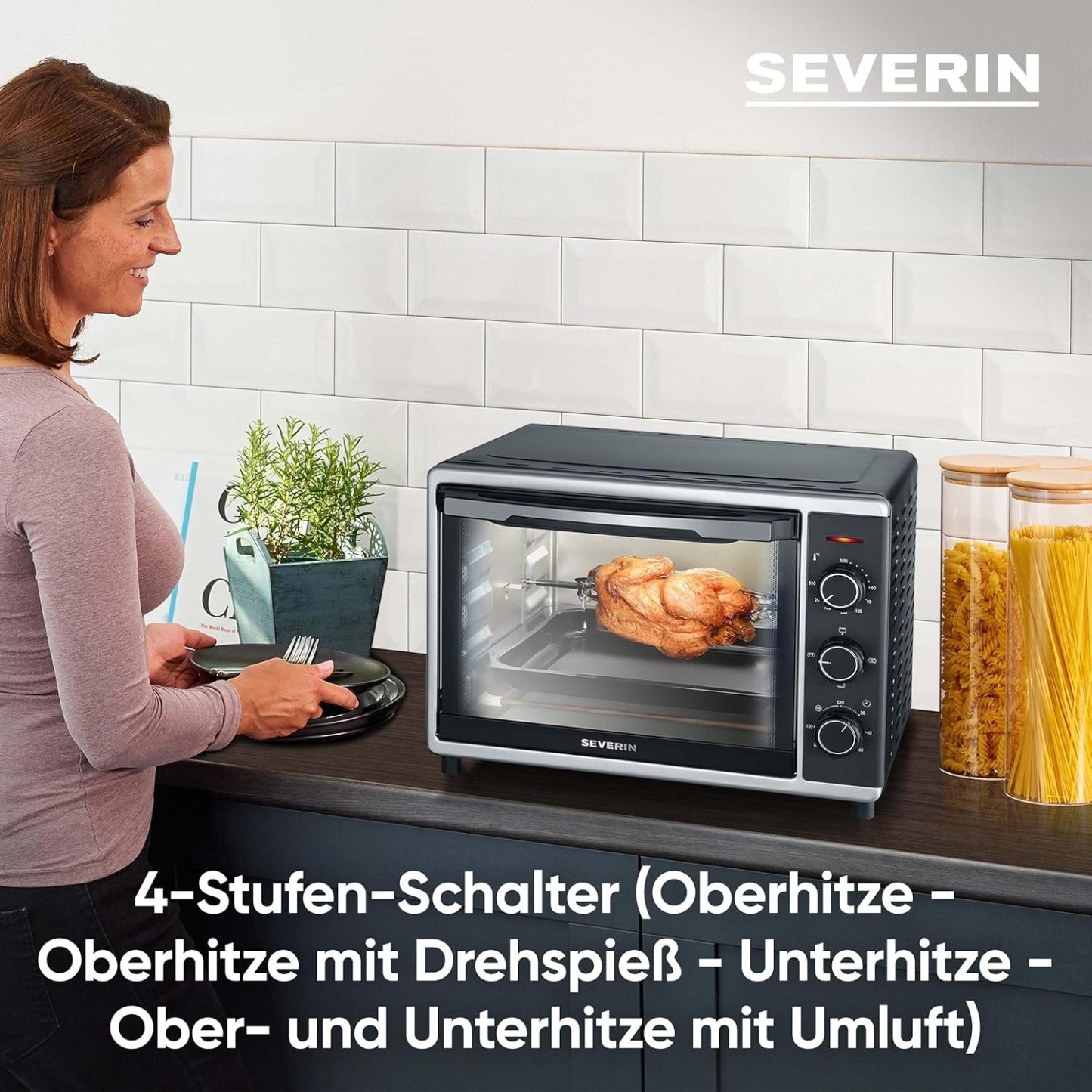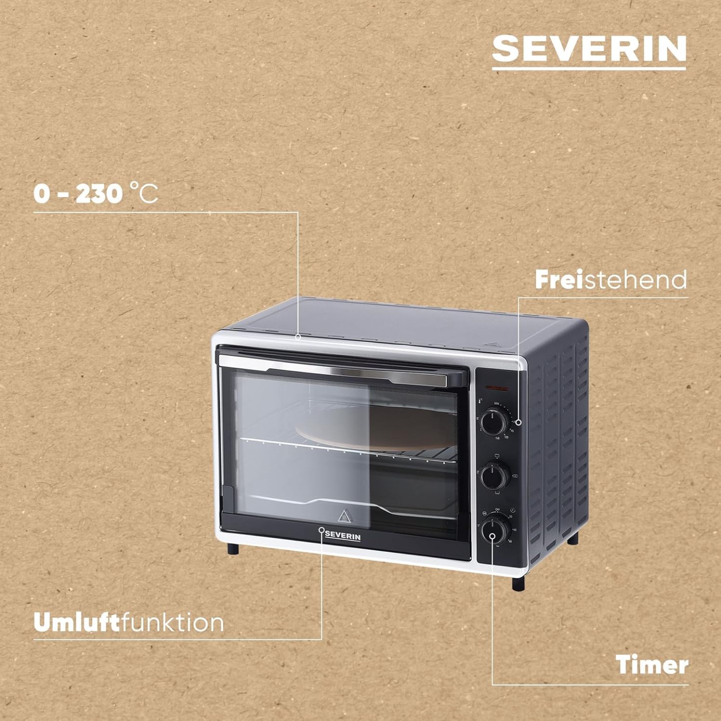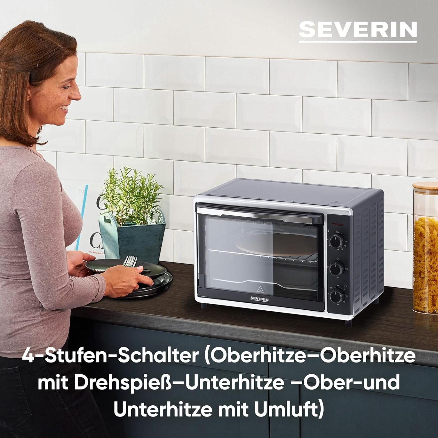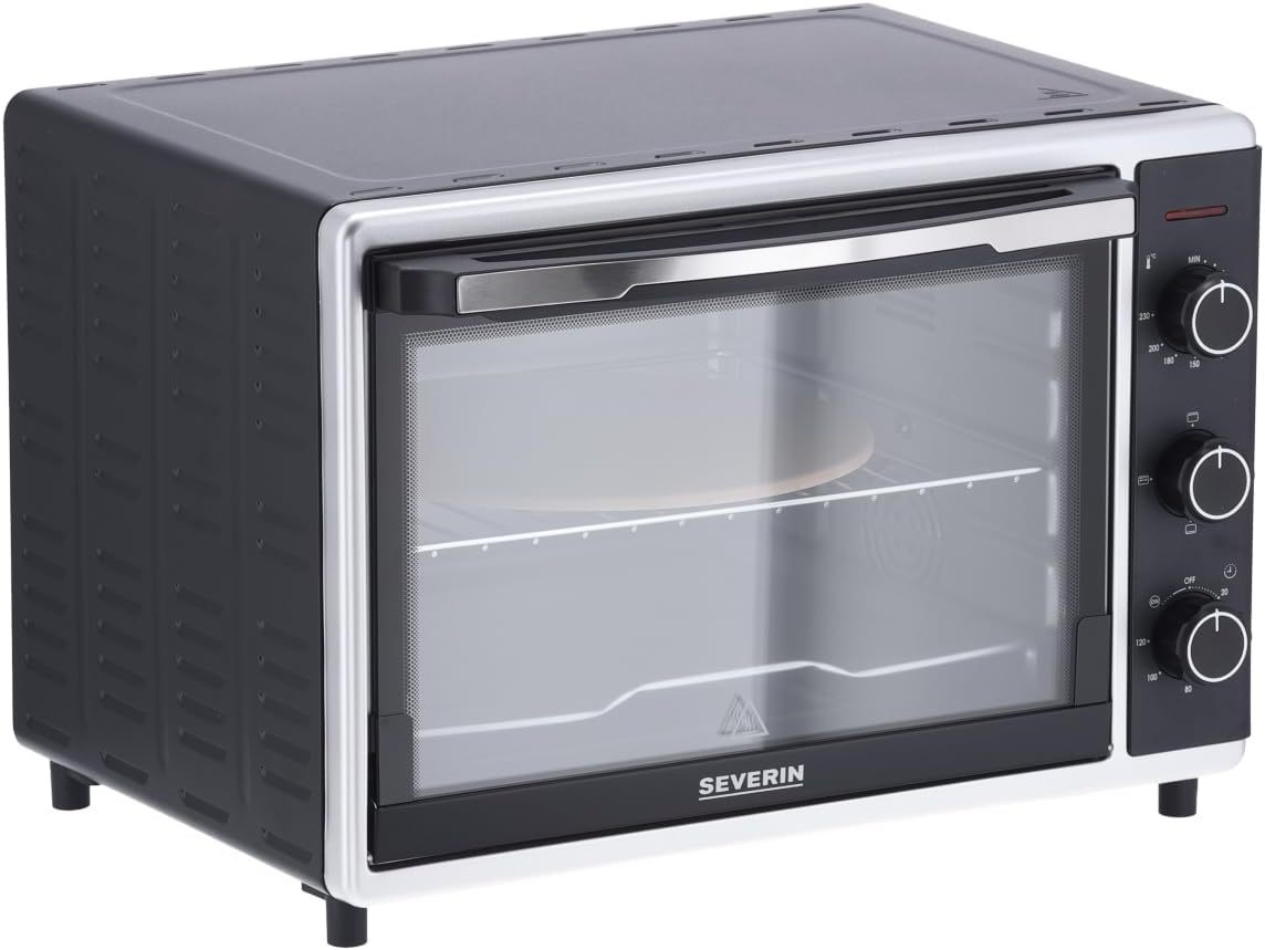SEVERIN Back- und Toastofen mit Umluftfunktion, Mini Backofen mit Grillrost, Backblech, Drehspie und Pizzastein, vielseitiger Heiluftofen mit 42 L Kapazitt, 1.800 W, schwarz, TO 2058