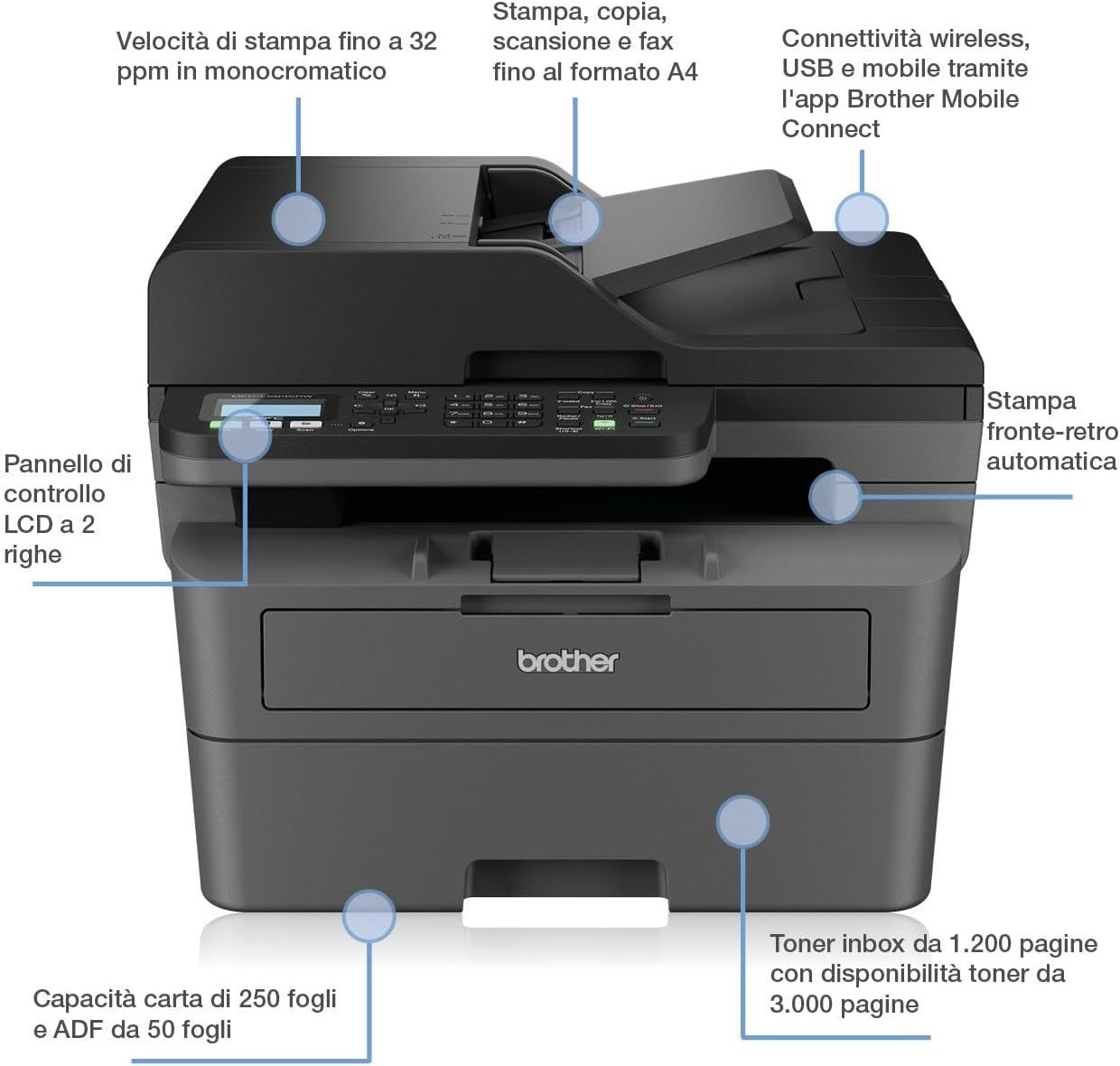 Brother MFC-L2835DW | 4-in-1-Multifunktionsdrucker (Drucken/Scan/Kopieren/Faxen) Laserdrucker Monochrom – WLAN & Ethernet – Dokumentenzuführung (ADF) für 50 Blatt – Druckgeschwindigkeit von 32 Seiten
