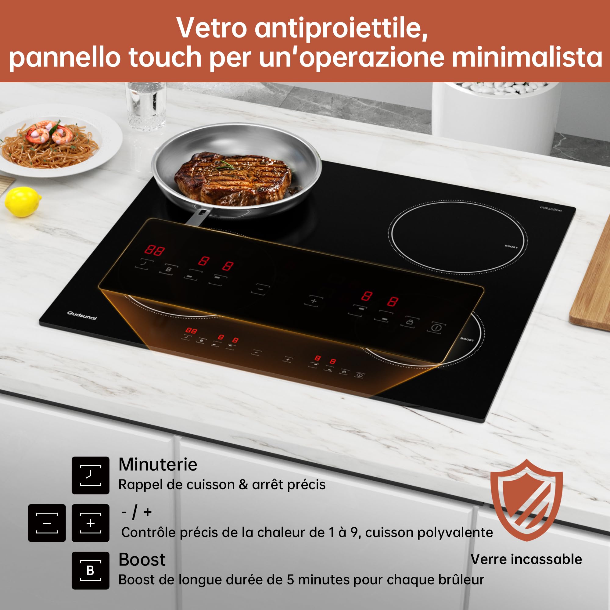 Gudsunal Plaque induction 4 feux, Table de Cuisson Encastrable,7200W, 9 niveaux de chauffage,Boost, Minuterie, Arrêt automatique, Verrouillage de sécu