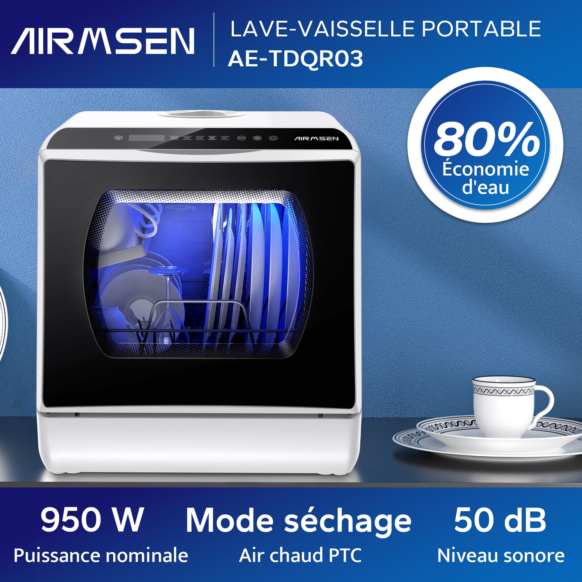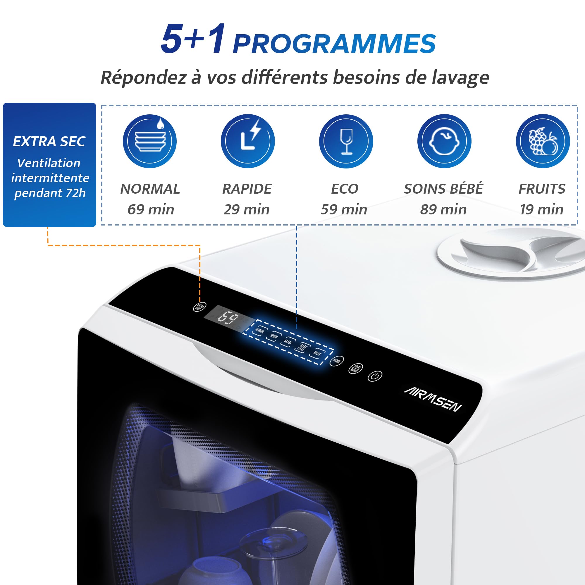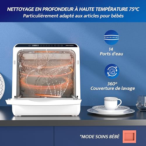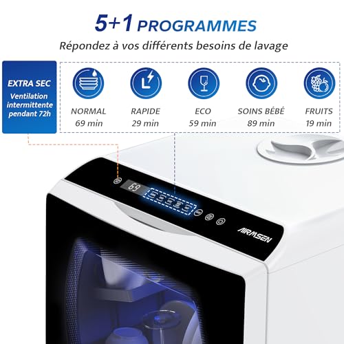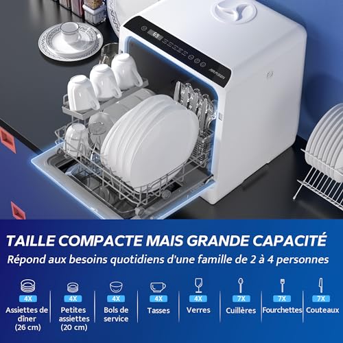 AIRMSEN Mini Lave-Vaisselle de Comptoir, 5+1 Programmes, Réservoir d'Eau de 5L, Contrôle Tactile et Écran LED, Adapté pour les Cuisines Familiales, Ap