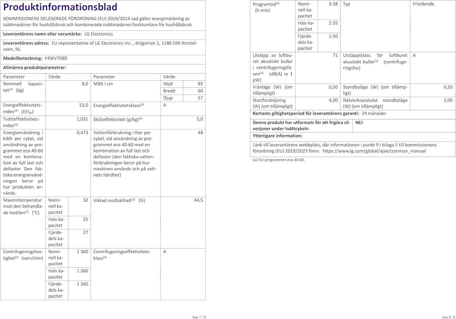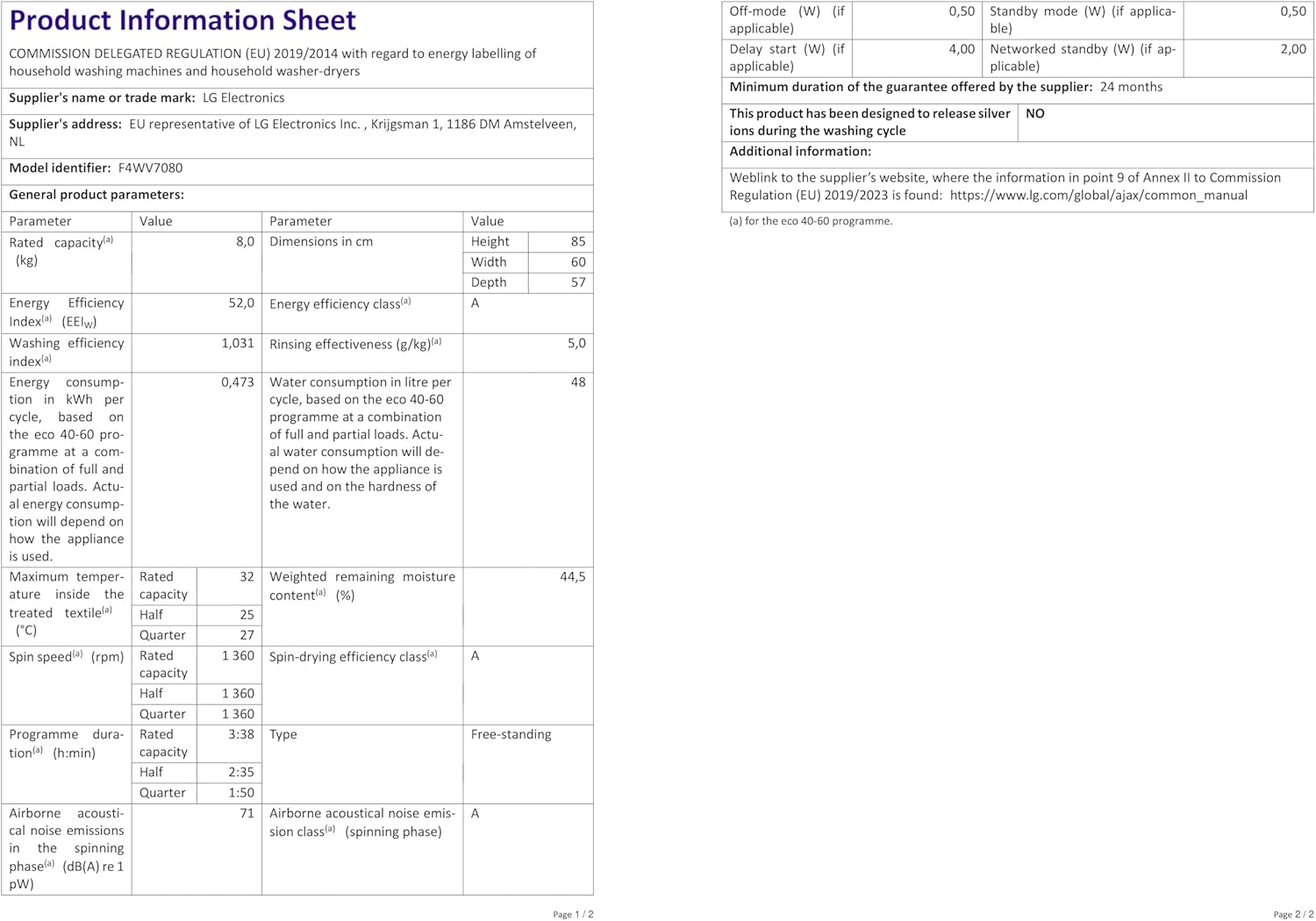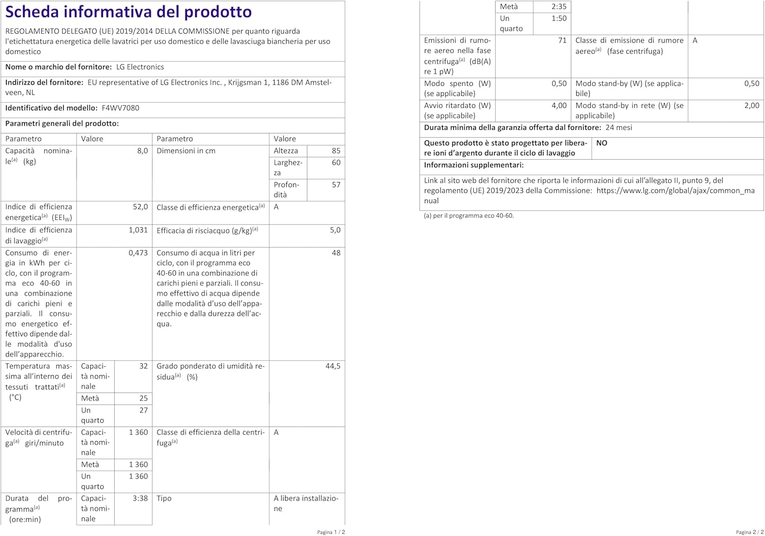 LG F4WV7080, Klasse A, Frontlader-Waschmaschine 8 kg, 1400 U/Min, AI Direct Drive, Wi-Fi, Tiefenreinigung mit Dampf, Große Kapazität, TRIPLE A, Außentür aus Sicherheitsglas, 62 x 60 x 85 cm ꟷ Weiß