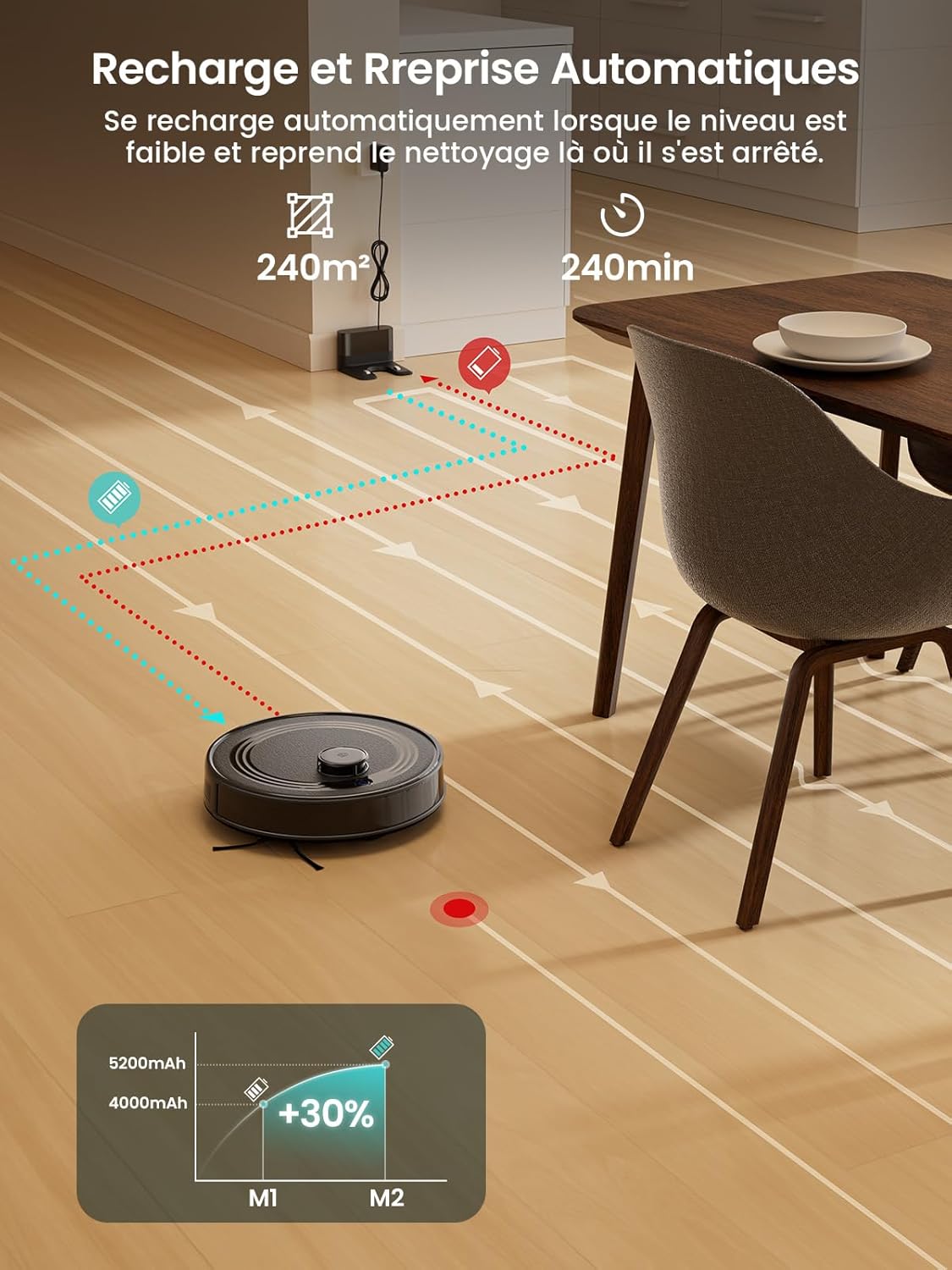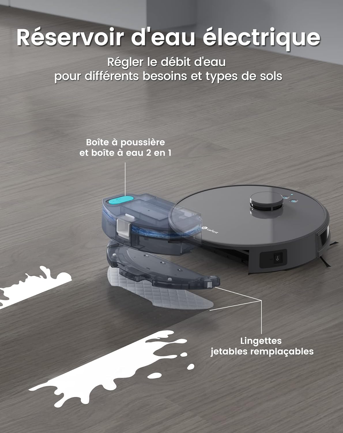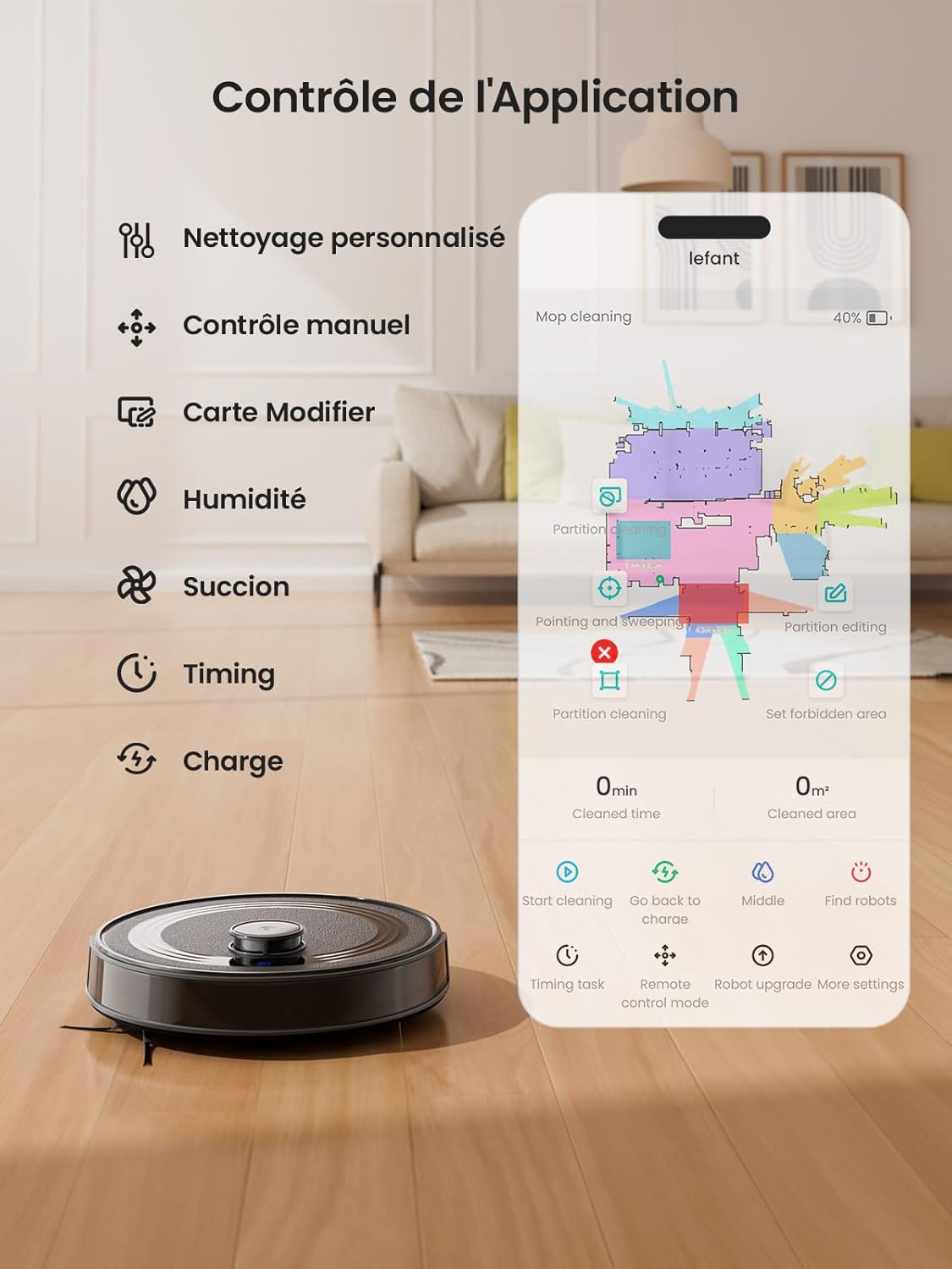 Lefant M2 Robot Aspirateur Laveur avec Cartographie, Aspiration de 5500Pa, Navigation Laser, Technologie d'évitement PSD, Nettoyage Personnalisé, Autonomie de 240 Minutes, Contrôle Via APP/Alexa/WiFi