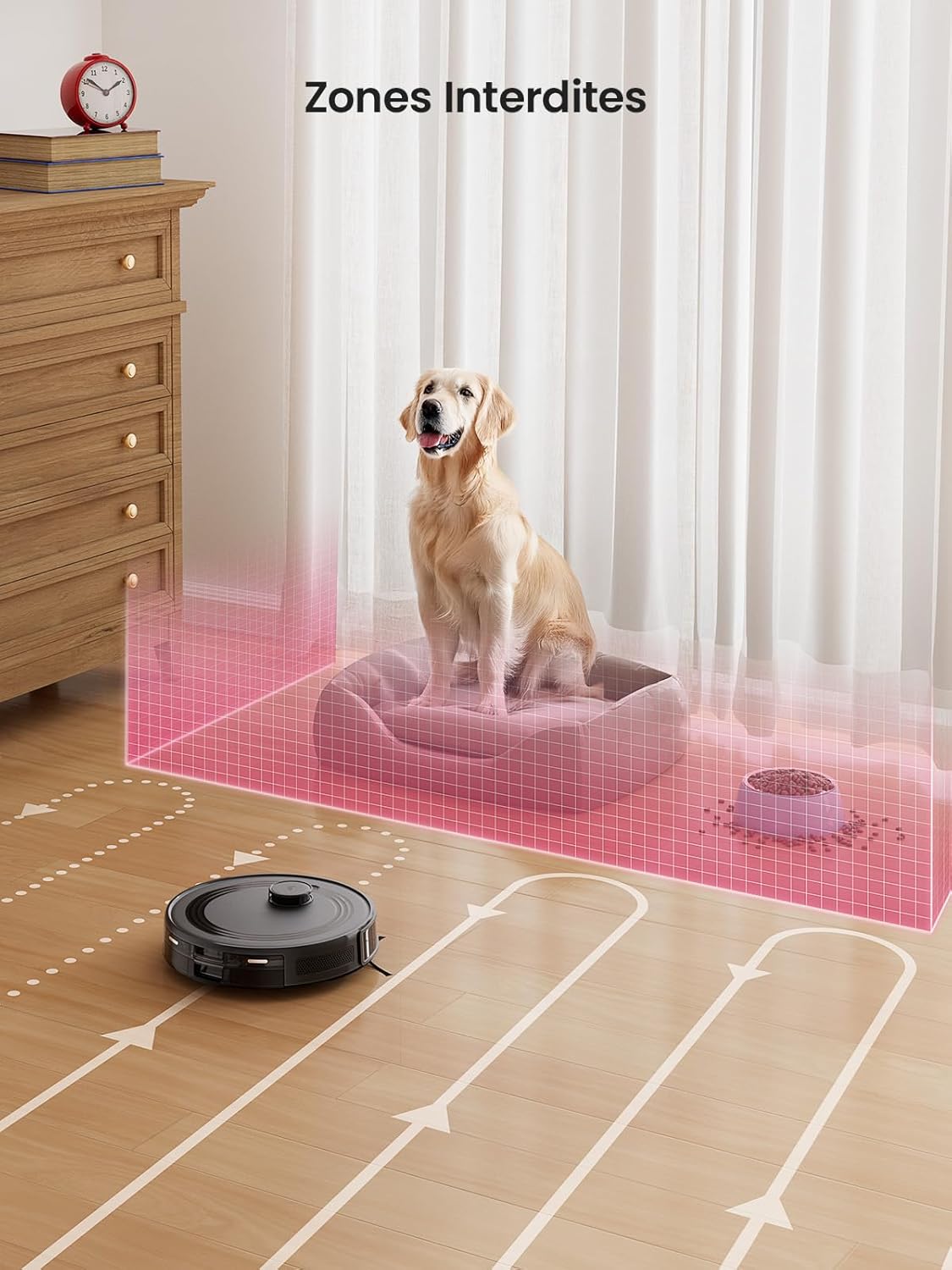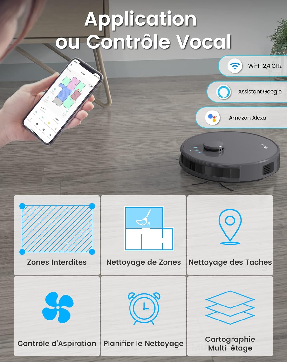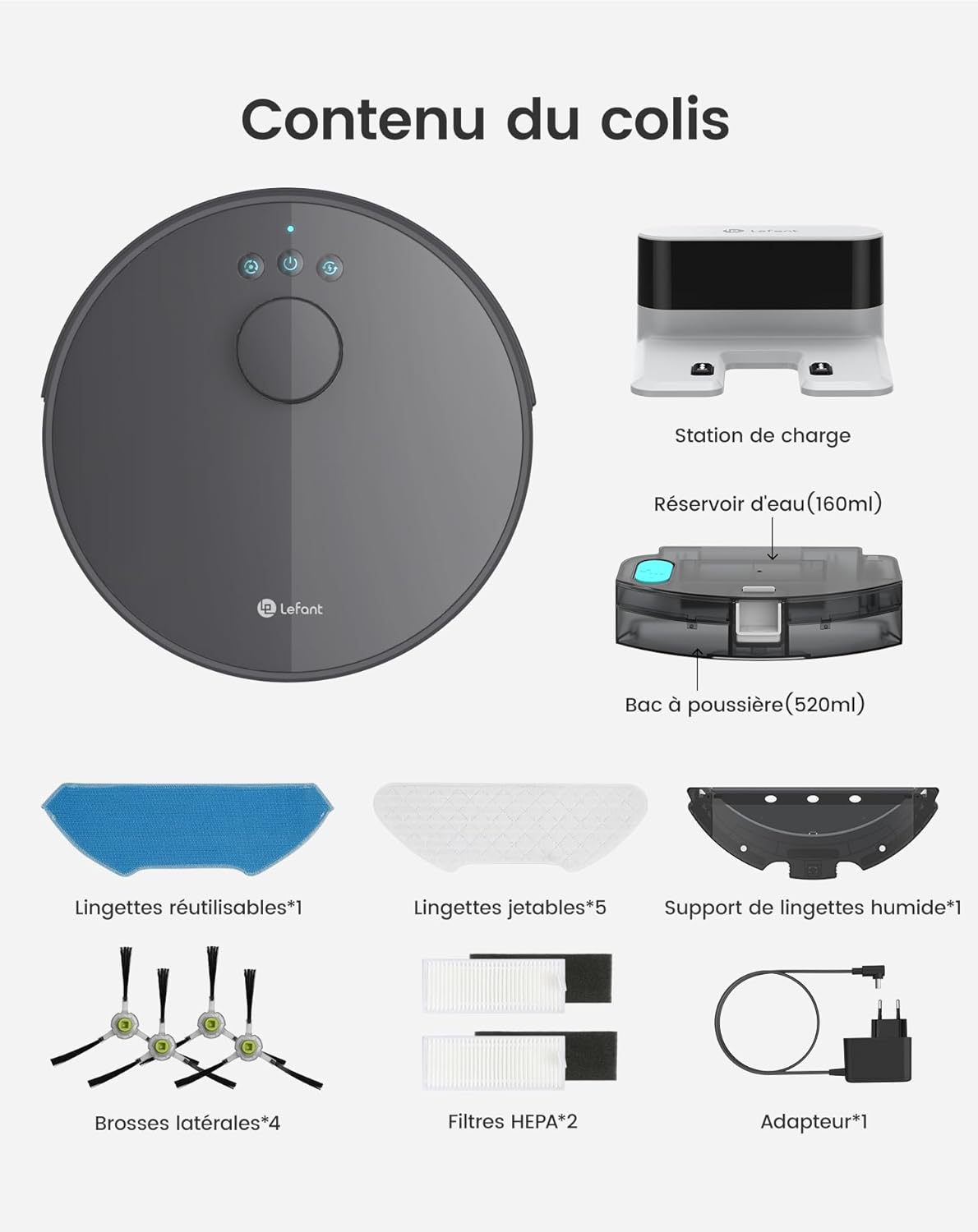 Lefant M2 Robot Aspirateur Laveur avec Cartographie, Aspiration de 5500Pa, Navigation Laser, Technologie d'évitement PSD, Nettoyage Personnalisé, Autonomie de 240 Minutes, Contrôle Via APP/Alexa/WiFi