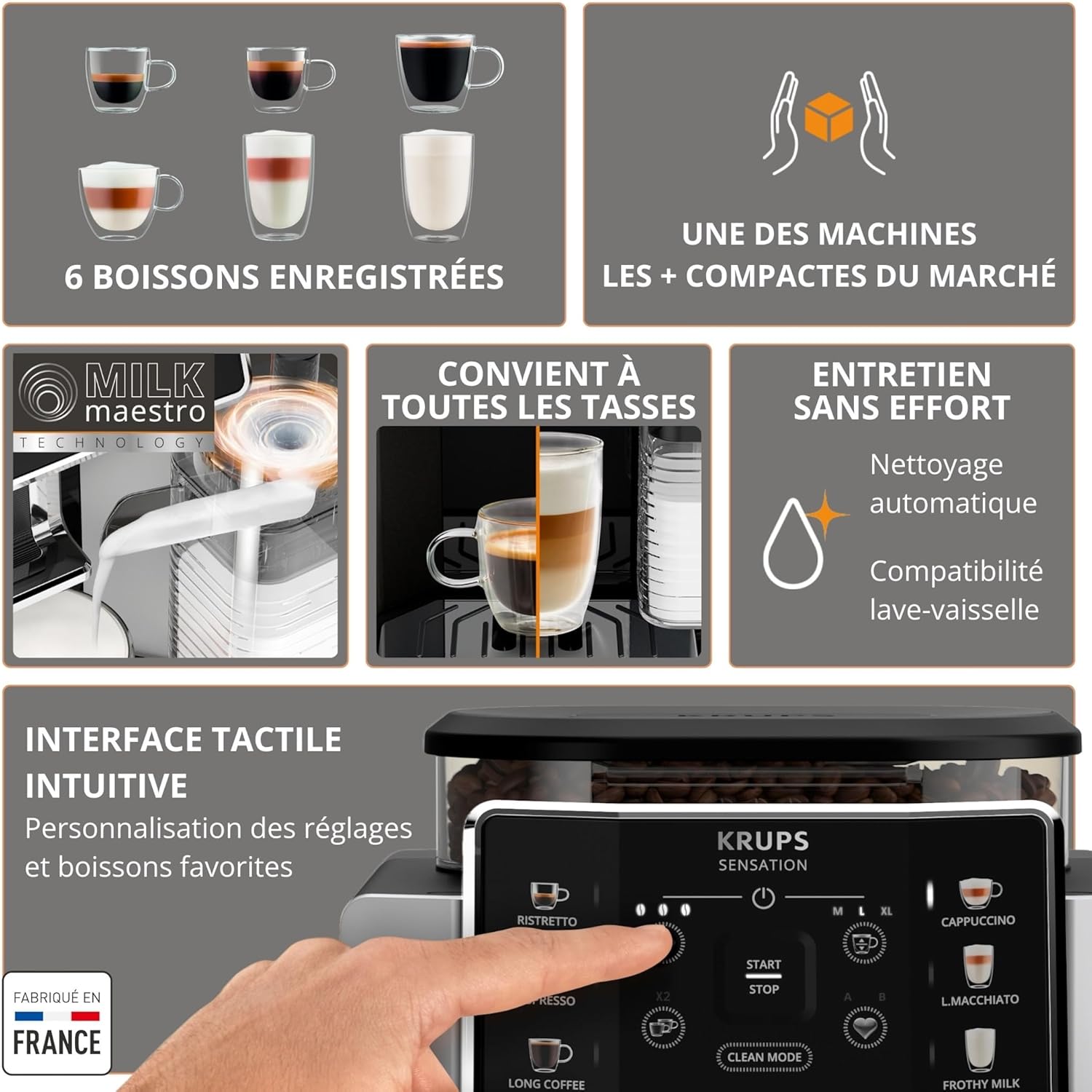 Krups Sensation Lait, Machine à café grains, machine expresso, 6 boissons, Carafe à lait, Cappuccino, Interface tactile, Nettoyage automatique, Silver, EA912E10