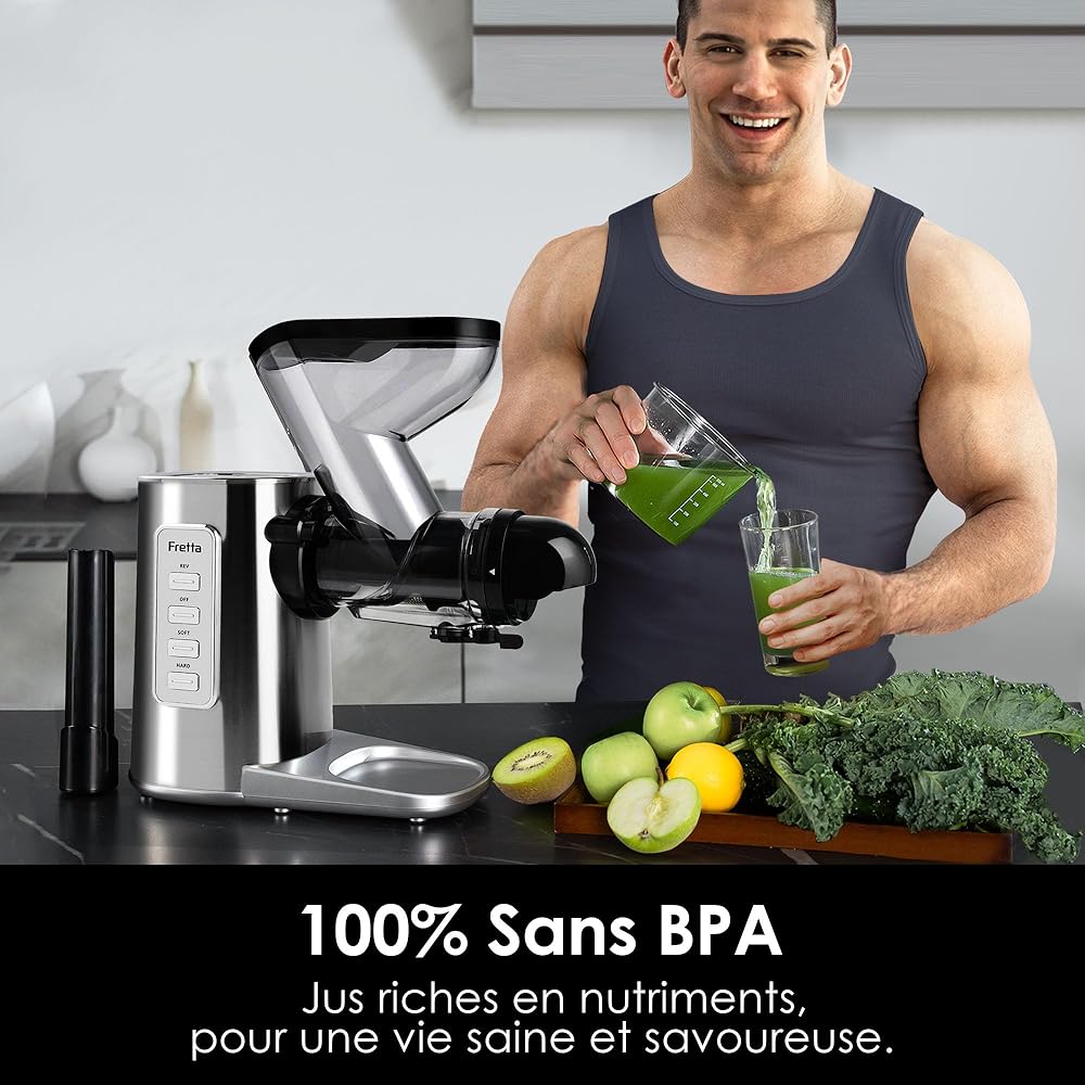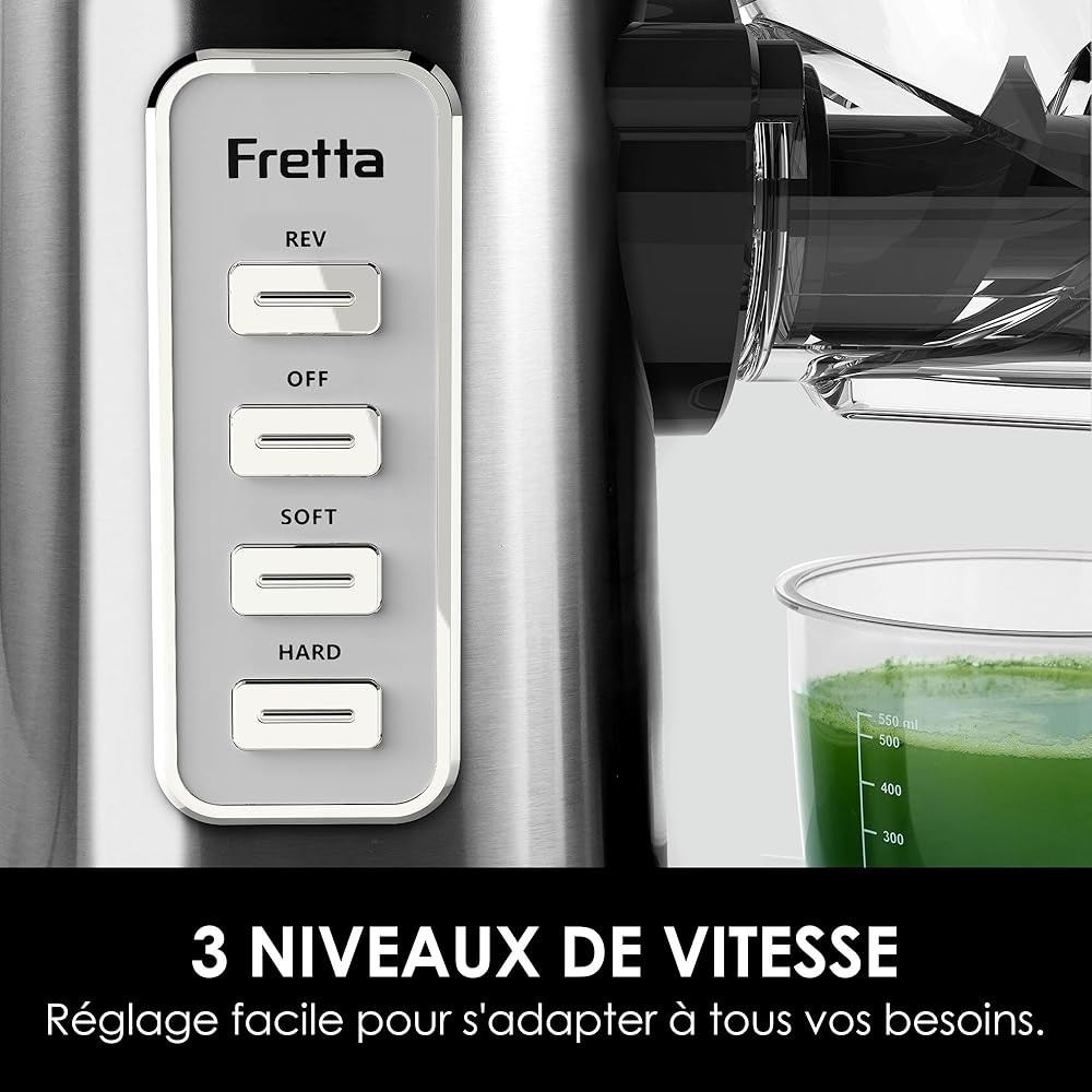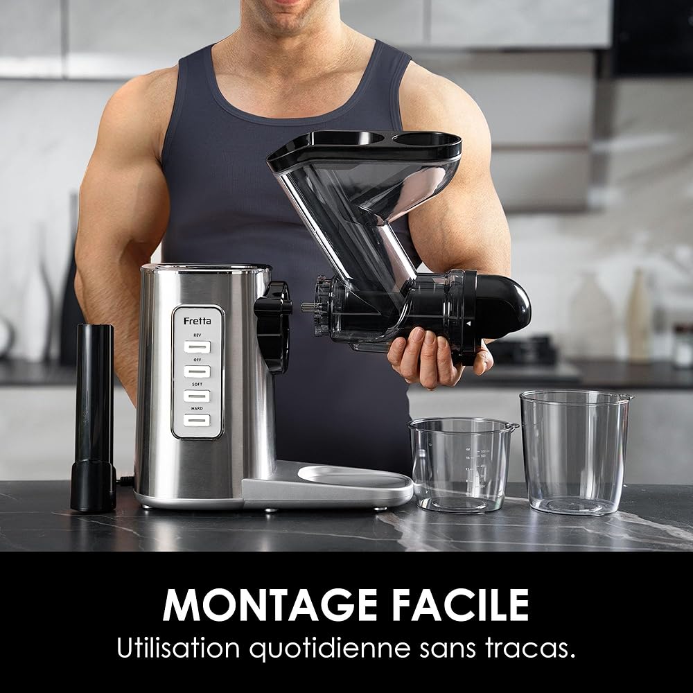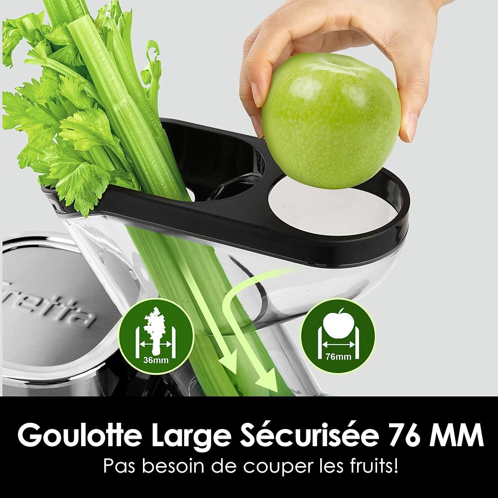 Fretta Extracteur de Jus à Froid avec Large Goulotte 76mm, Sans BPA & Corps en acier inoxydable, Extraction Lente pour Maximum de Nutriments, Facile à Nettoyer : Cuisine et Maison