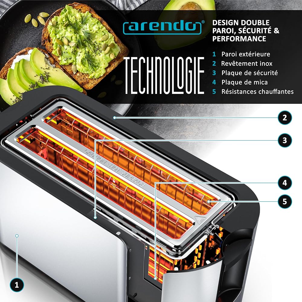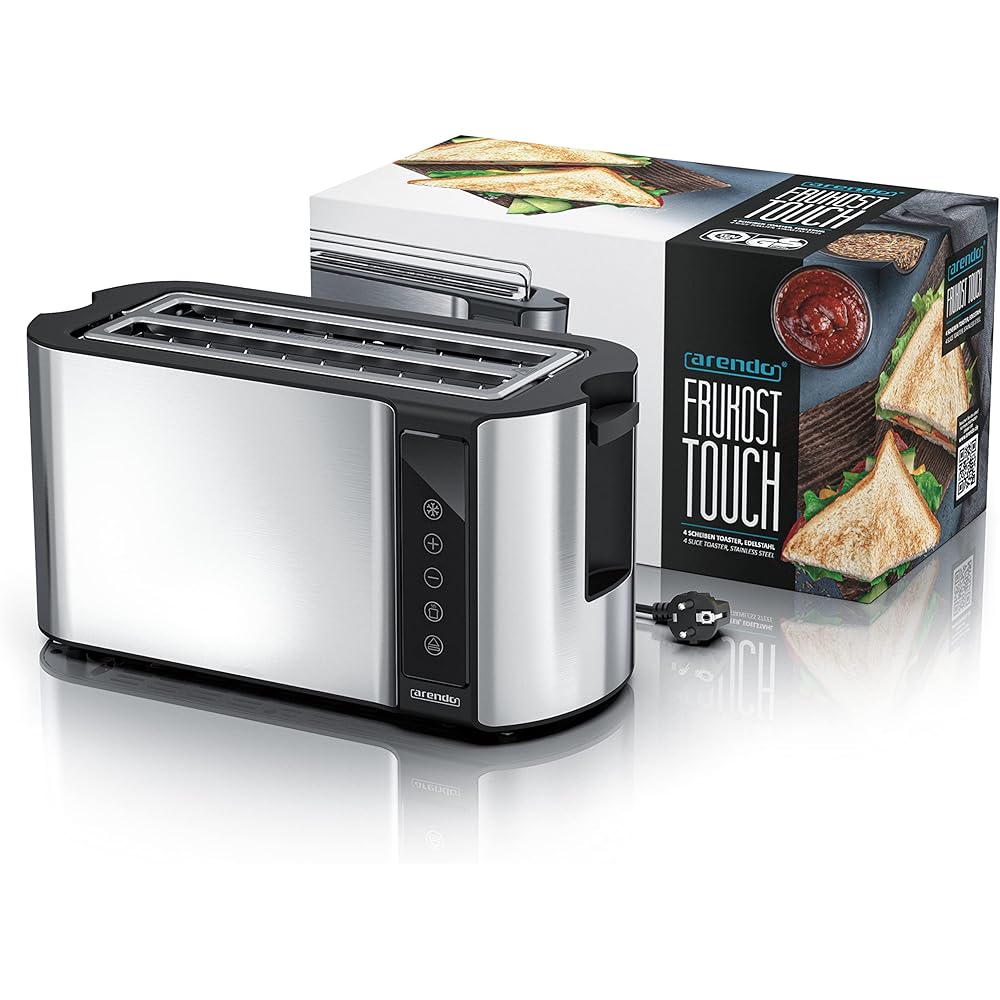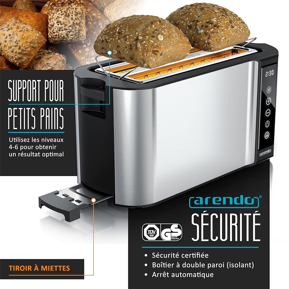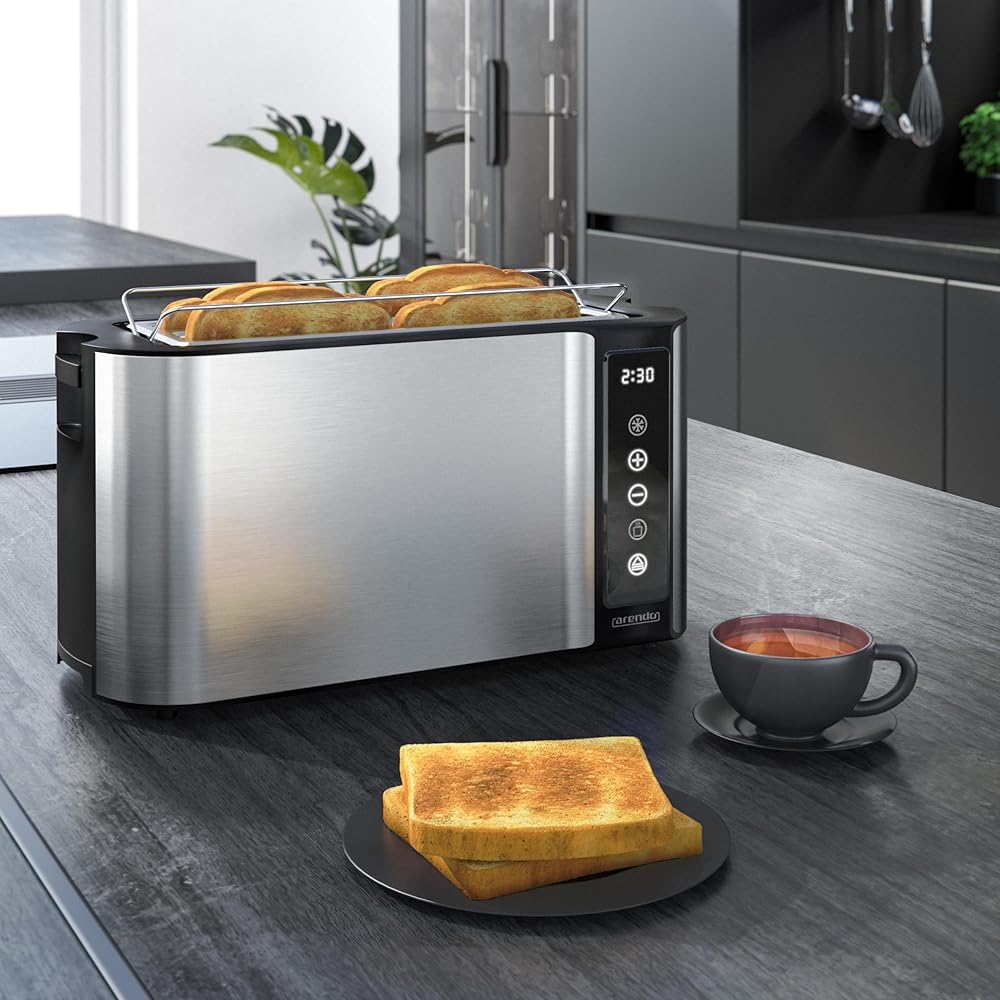 arendo Grille-Pain à 4 Fentes Longues 1500 W, écran Tactile, boîtier à Double paroi, Support à viennoiseries, 7 Niveaux de brunissement, centrage et Affichage du Temps restant, Fonction mémoire : Cuisine et Maison
