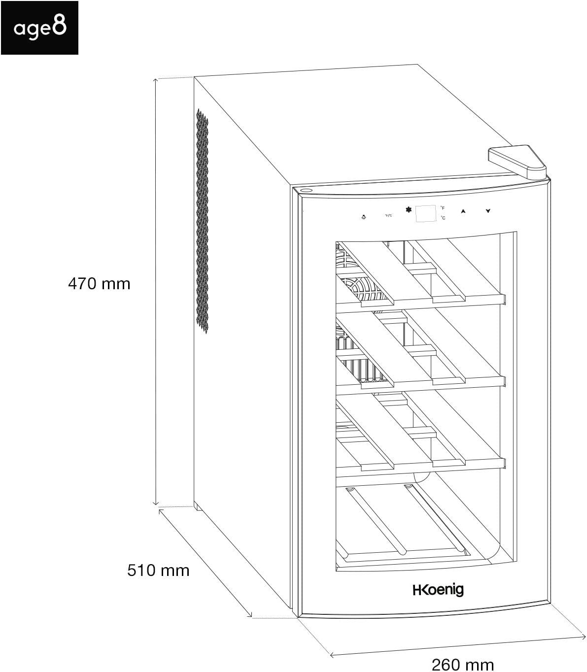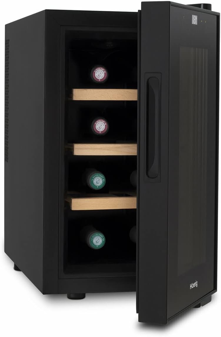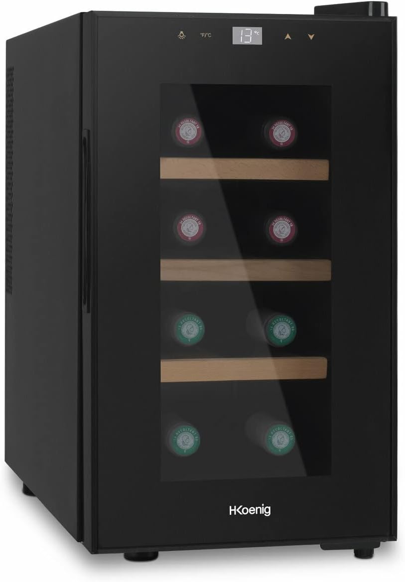 H.Koenig Cave à vin Réfrigérante Thermo Electrique 8 bouteilles de conservation AGE8 25L, Professionnelle Inox, multi température 11°C-18°C, Silencieuse, Eclairage intérieur, 3 Etagères