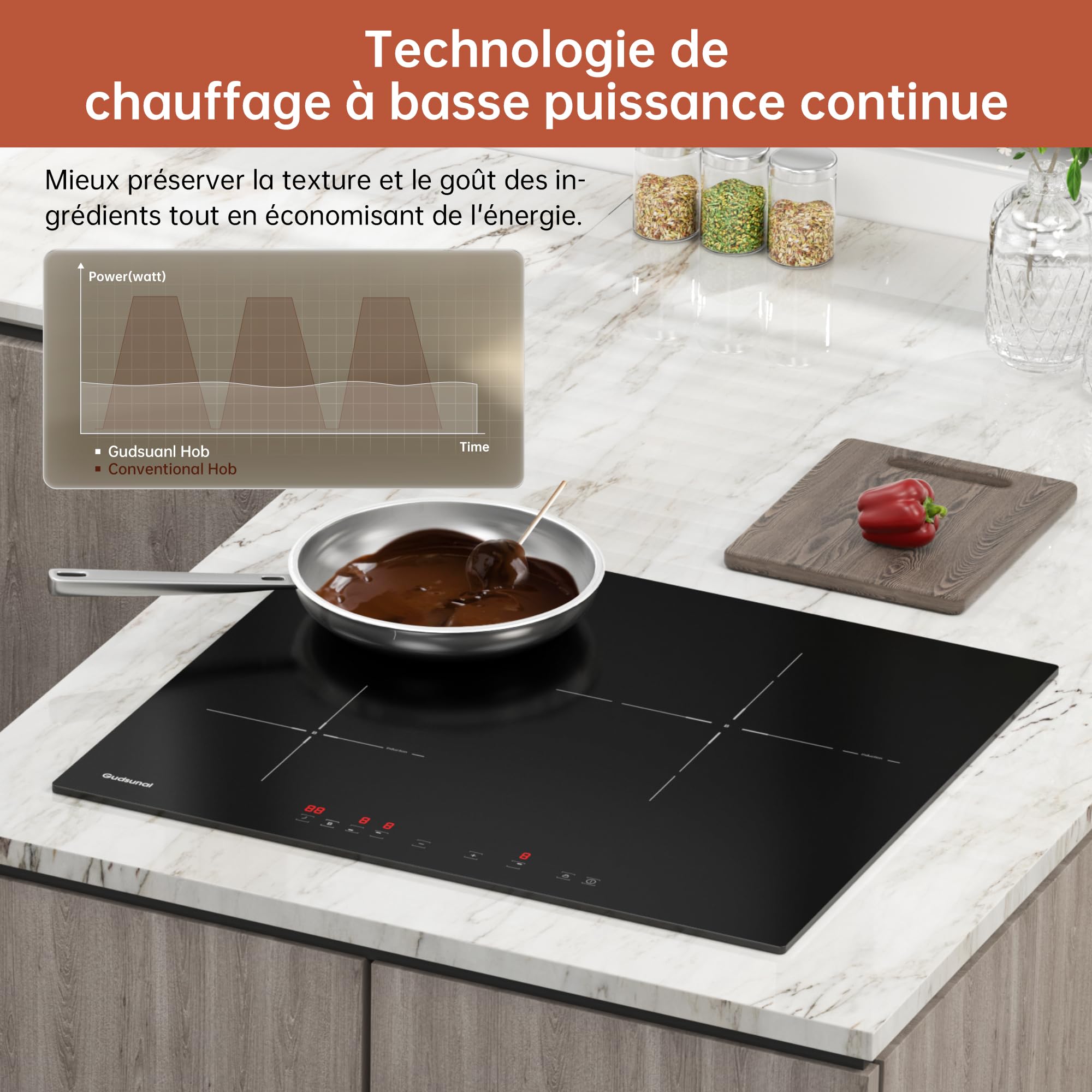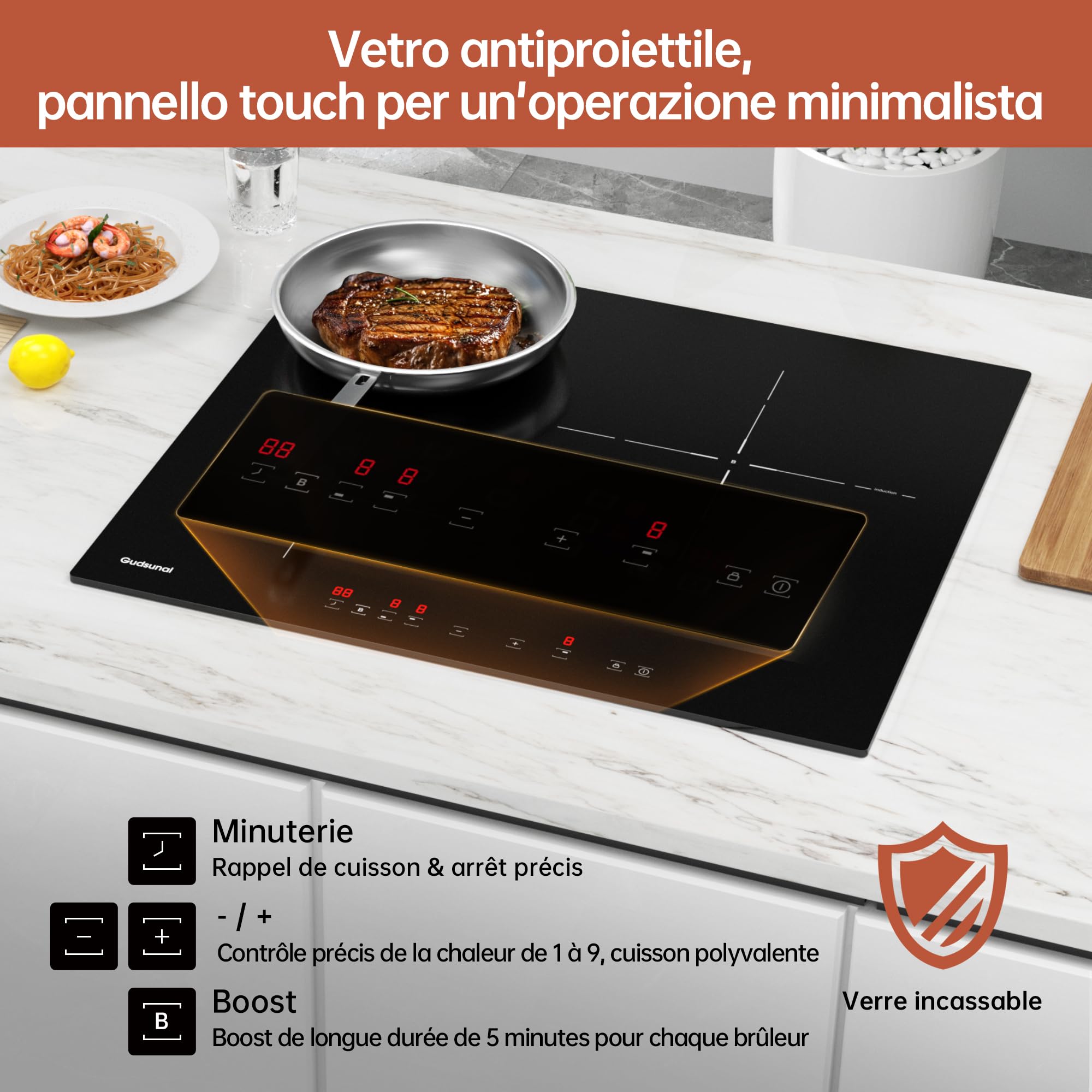 Gudsunal Plaque induction 3 feux, Table de Cuisson Encastrable,7200W, 9 niveaux de chauffage,Boost, Minuterie, Arrêt automatique, Verrouillage de sécu