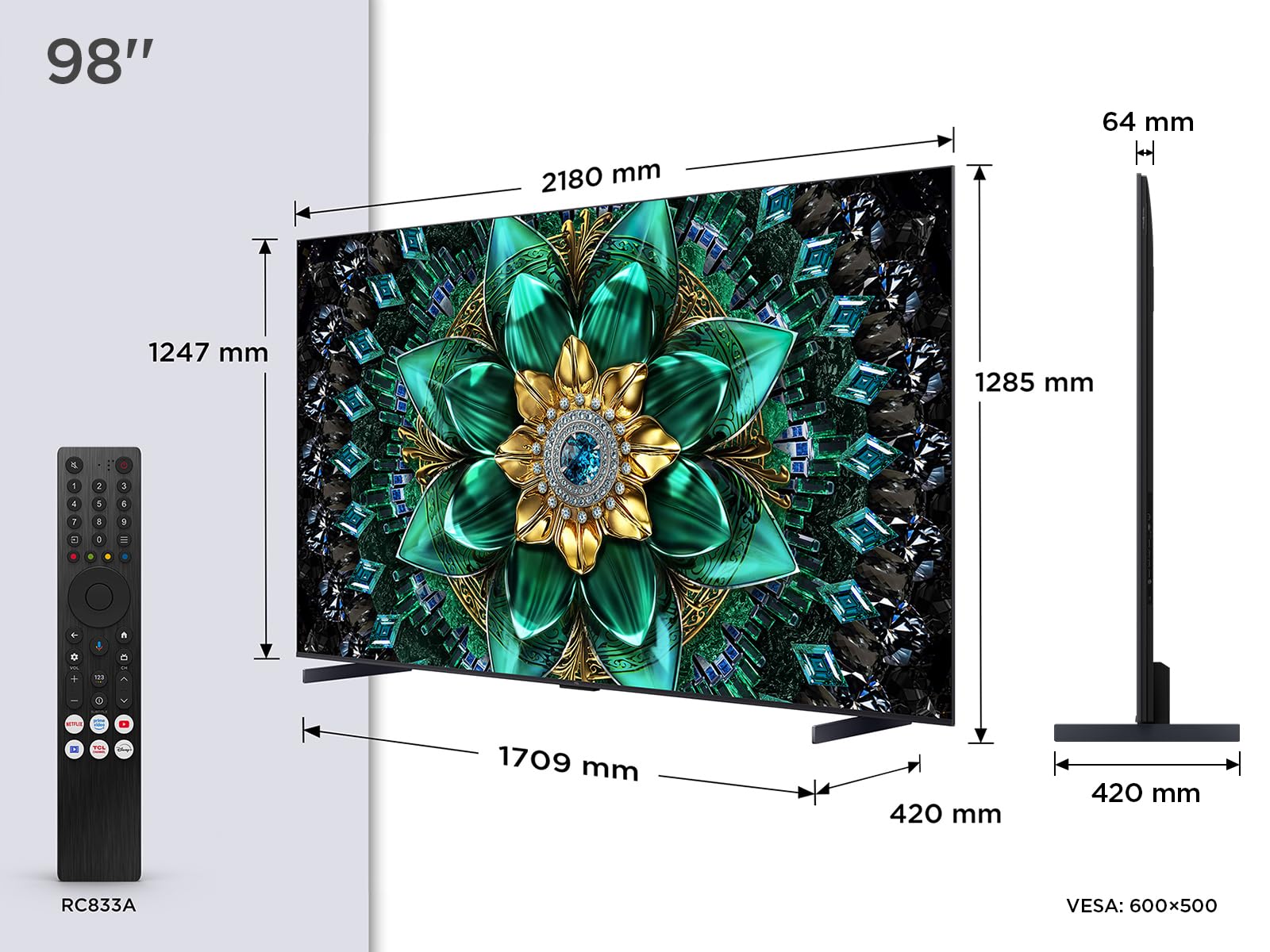 TCL 98Q6C QD-Mini LED TV, 4K HDR Premium 1000nits, Smart TV alimenté par Google (Dolby Vision IQ et Atmos, Panneau HVA Mat, système Audio Onkyo 2.1, M