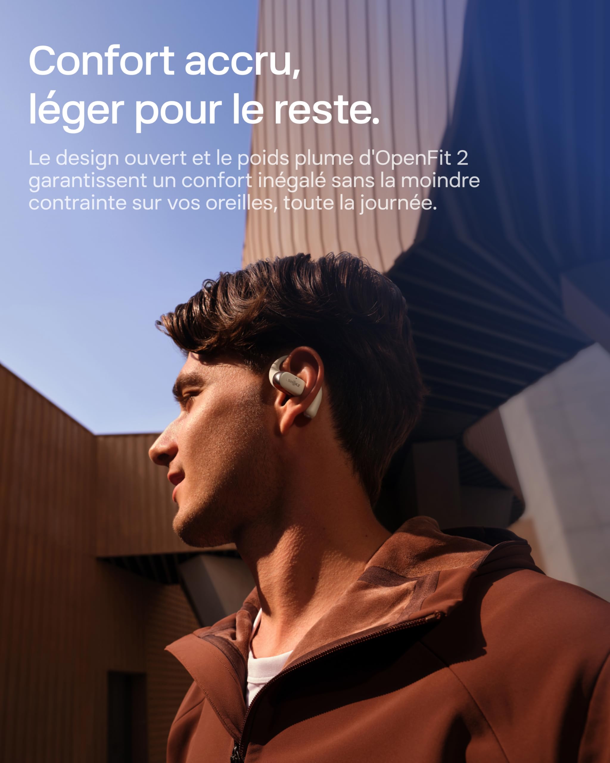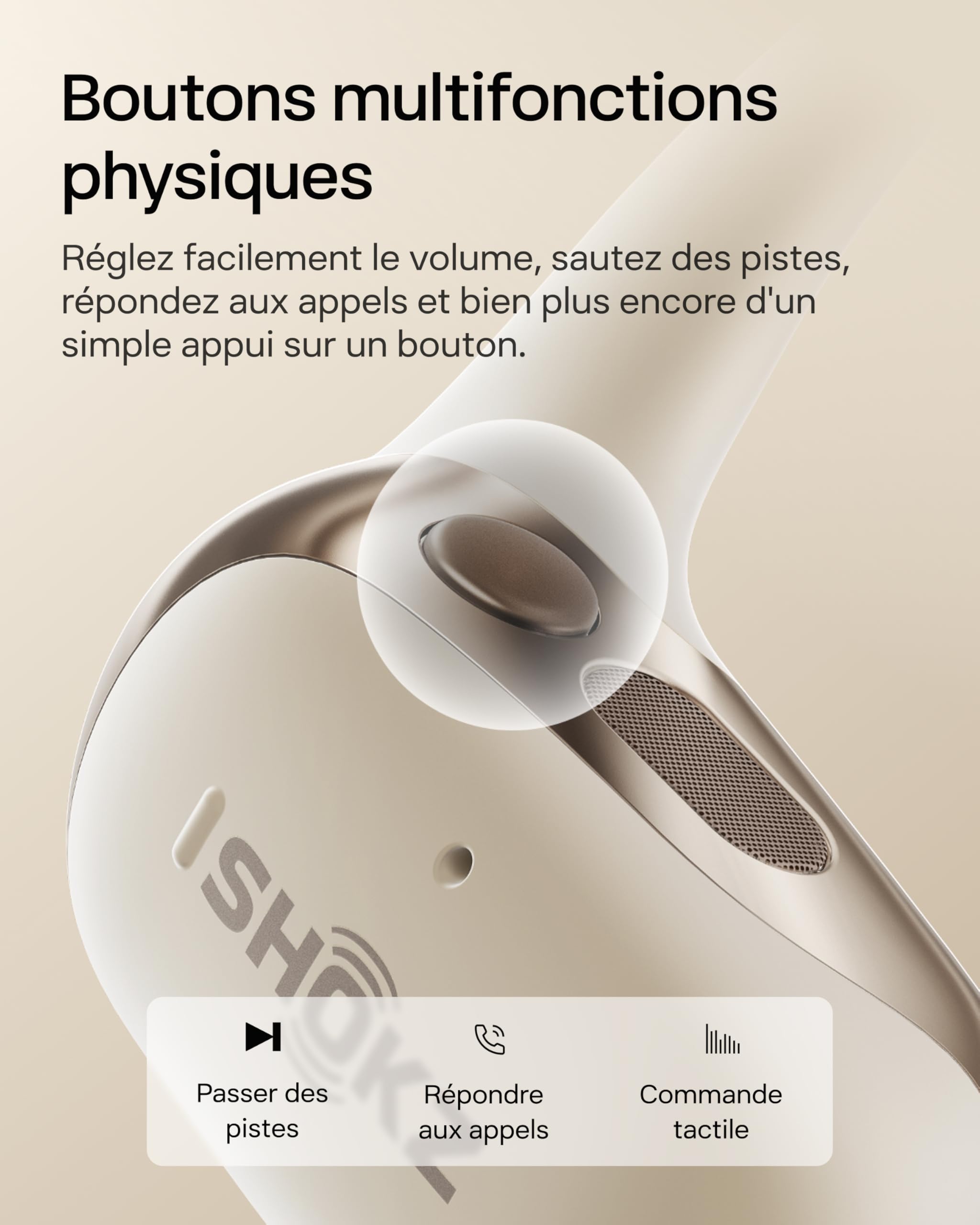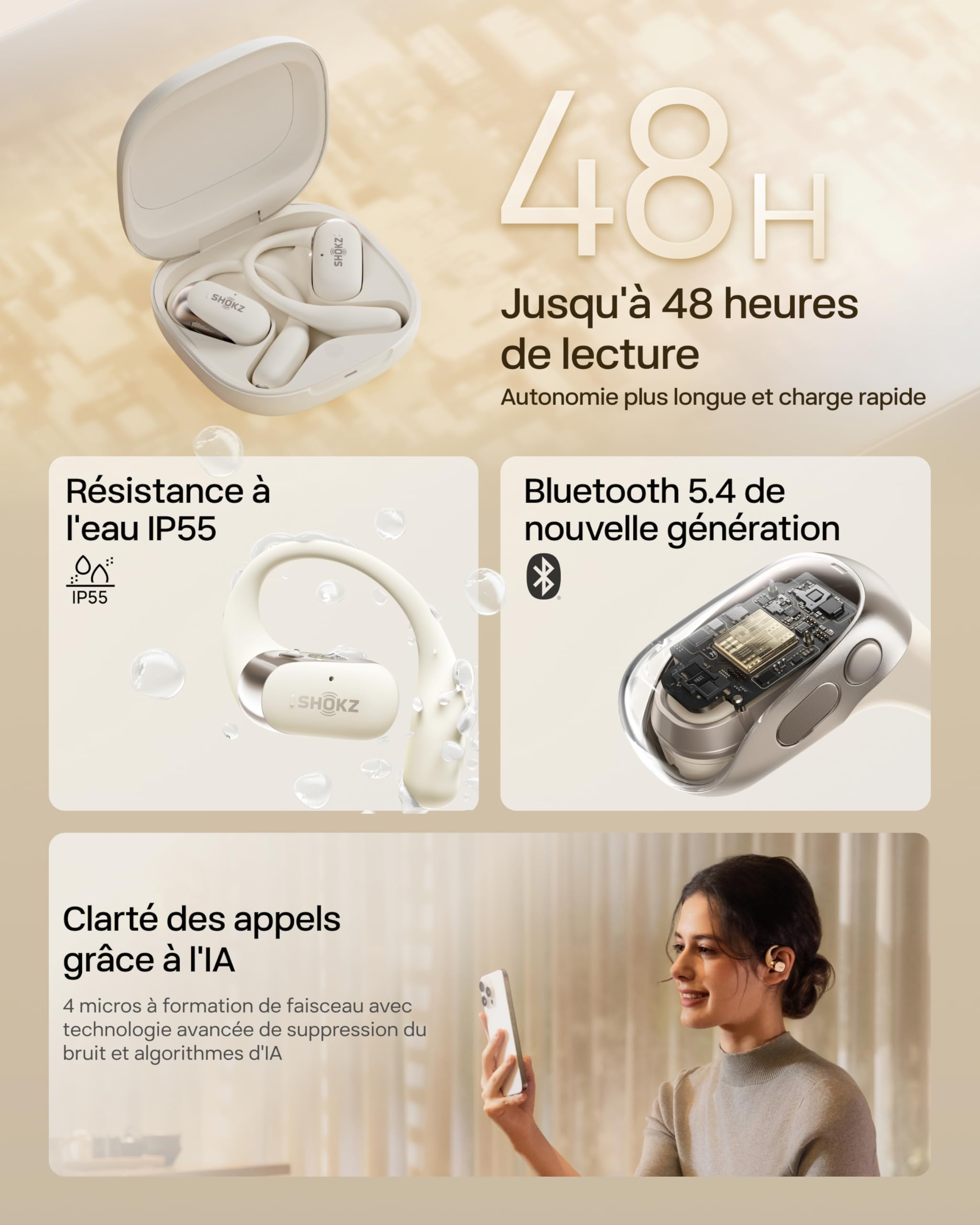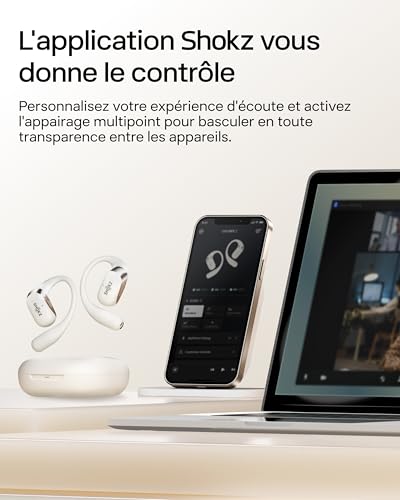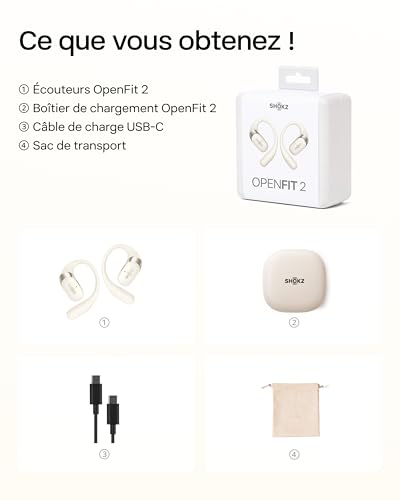 SHOKZ OpenFit 2 Casque à Oreilles Libres, écouteurs Bluetooth sans Fil avec Micro, écouteurs avec Crochet d’oreille et 48 Heures de Lecture, Charge Rapide, résistance IP55, Sac de Transport, Beige