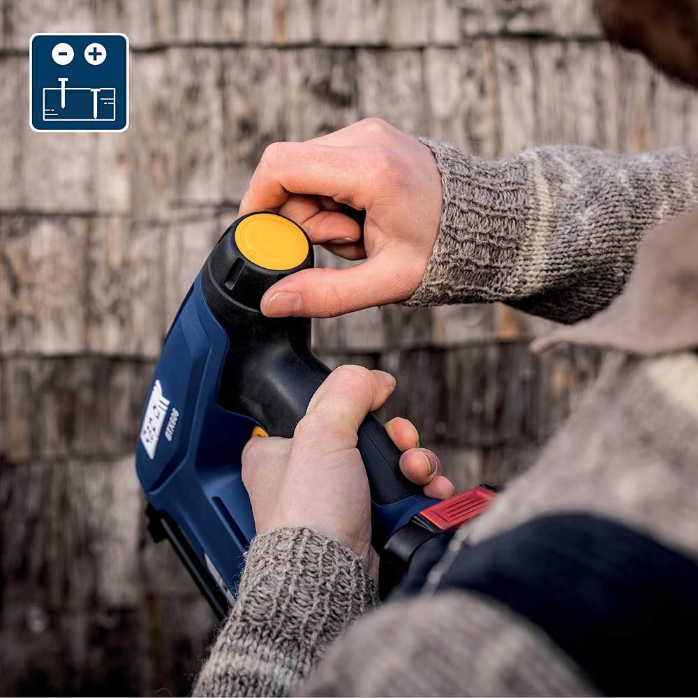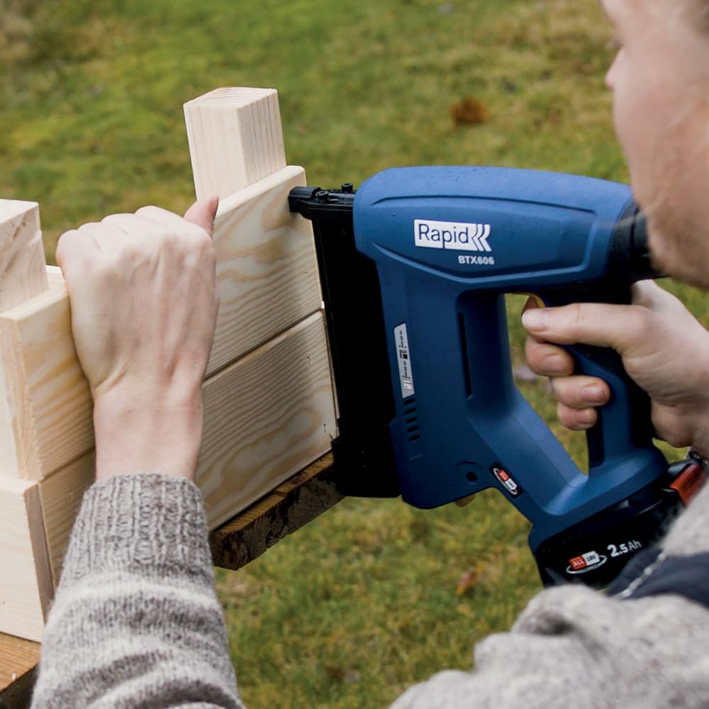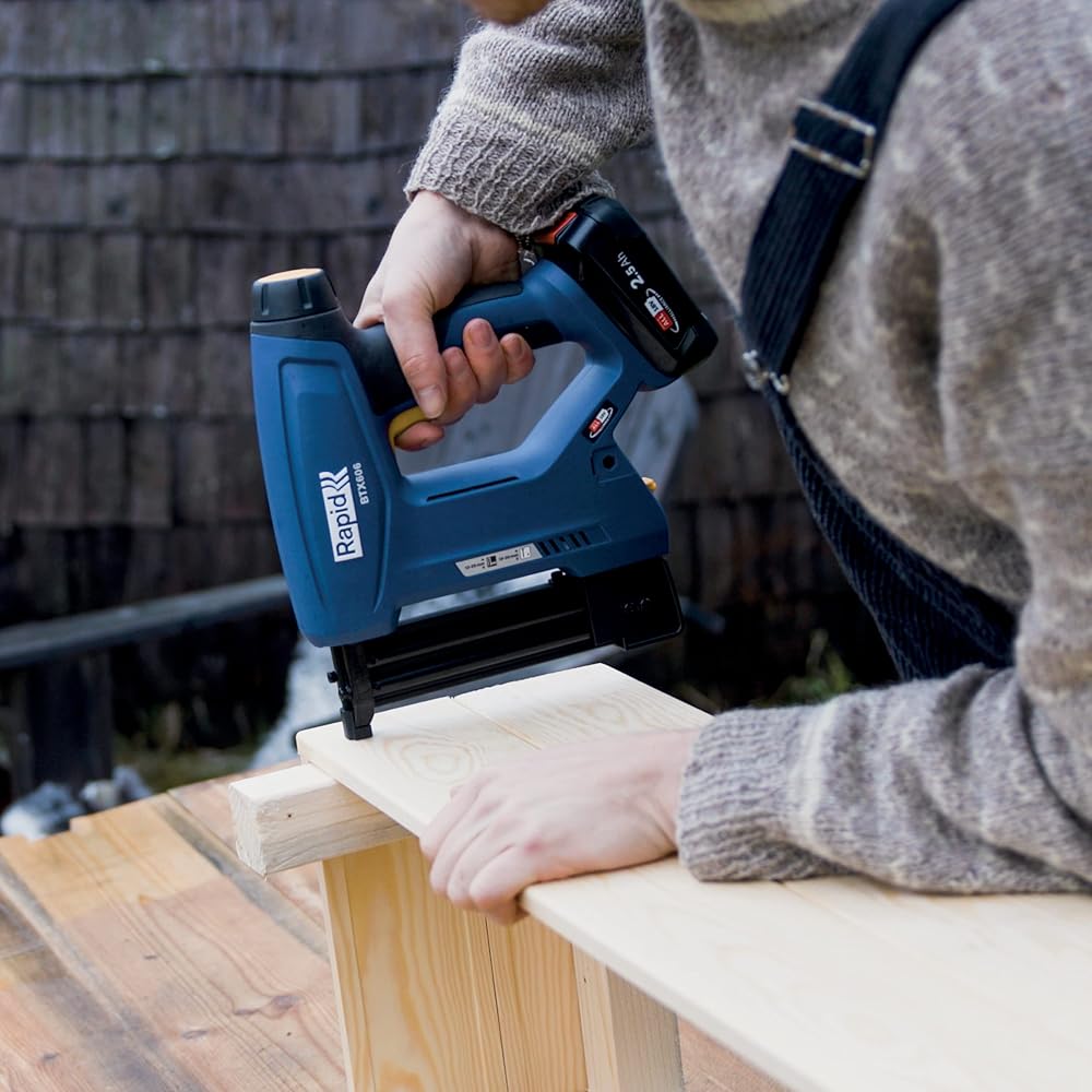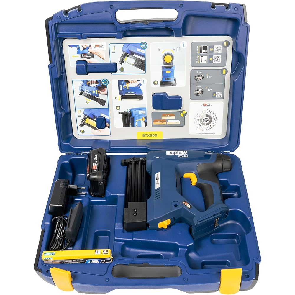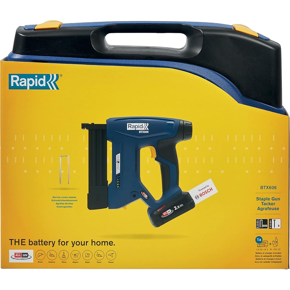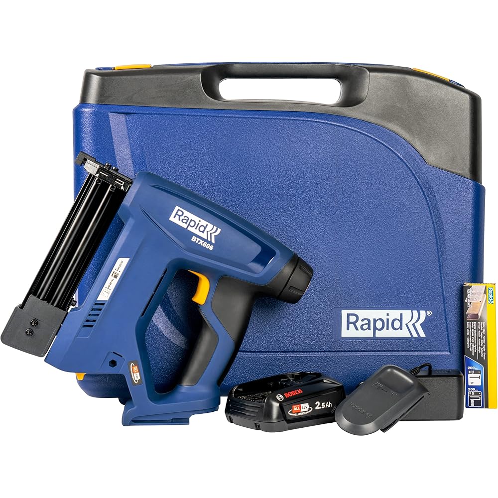 Rapid BTX606 - Agrafeuse Murale P4A 18V, Agrafeuse-Cloueuse électrique Sans Fil à Batterie, pour Agrafes à Couronne étroite & Pointes, Bois Dur & Tendre + Batterie 2,5 Ah, Chargeur, Malette : Bricolage