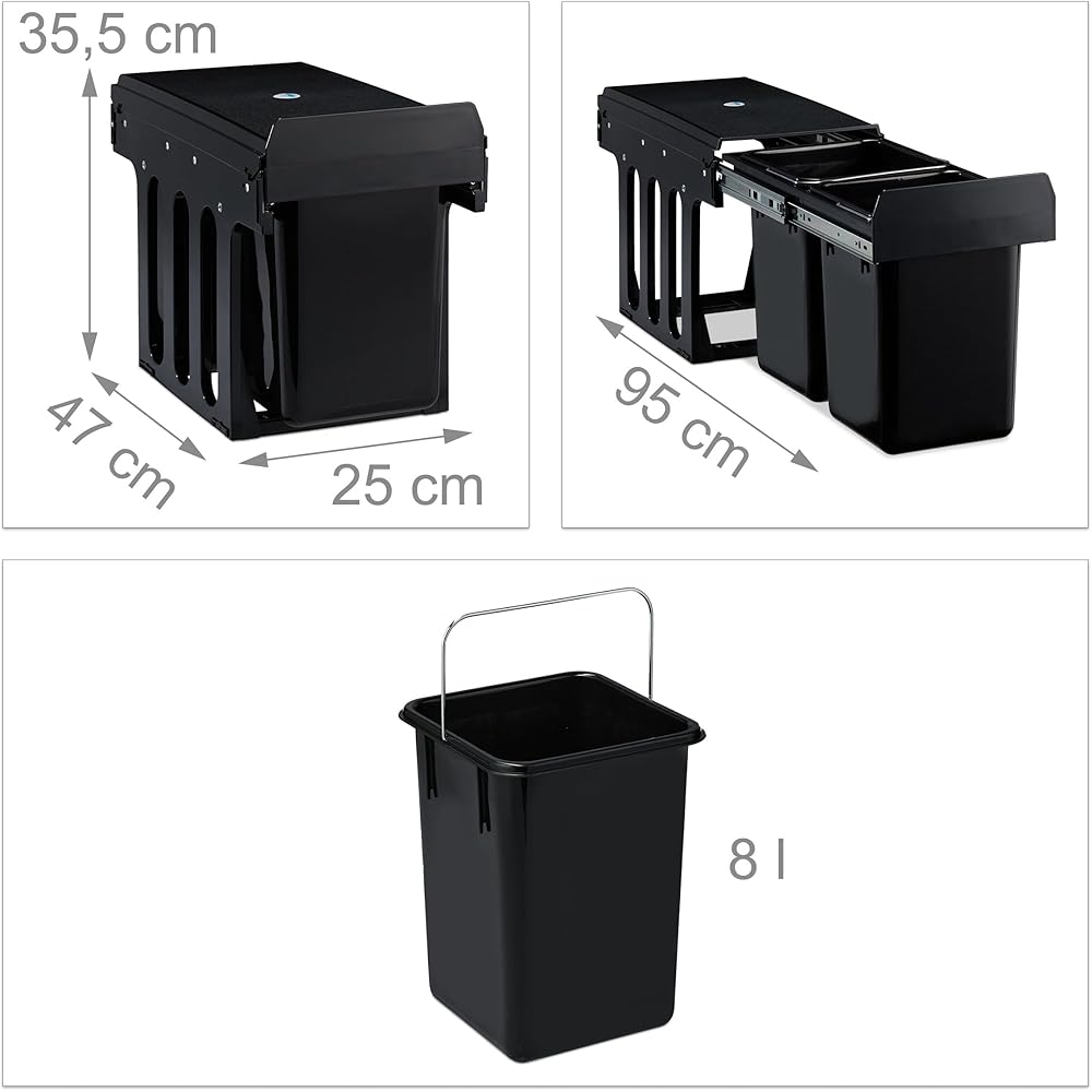 relaxdays poubelle encastrable coulissante, 2 bacs, système de trie pour le sous-évier, 2x8 l, 35,5 x 25 x 47 cm, noir : Cuisine et Maison