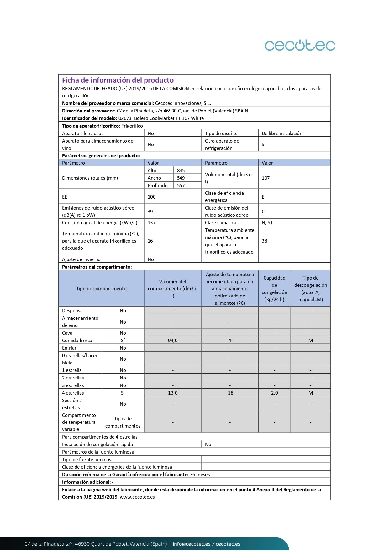 Cecotec Mini Réfrigérateur 107 L Bolero CoolMarket TT 107 White, Classe Énergétique E, Économie d'Énergie, Porte Réversible, Tiroir Congélateur, Faibl