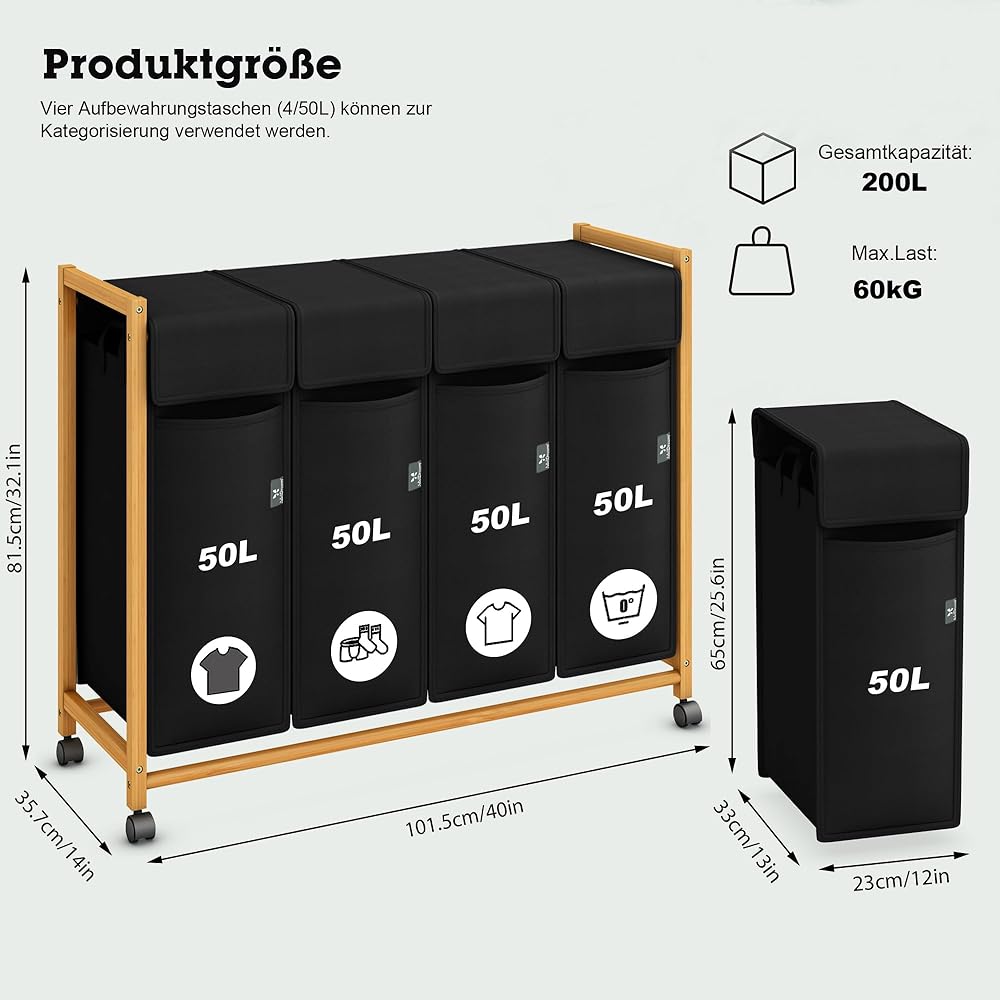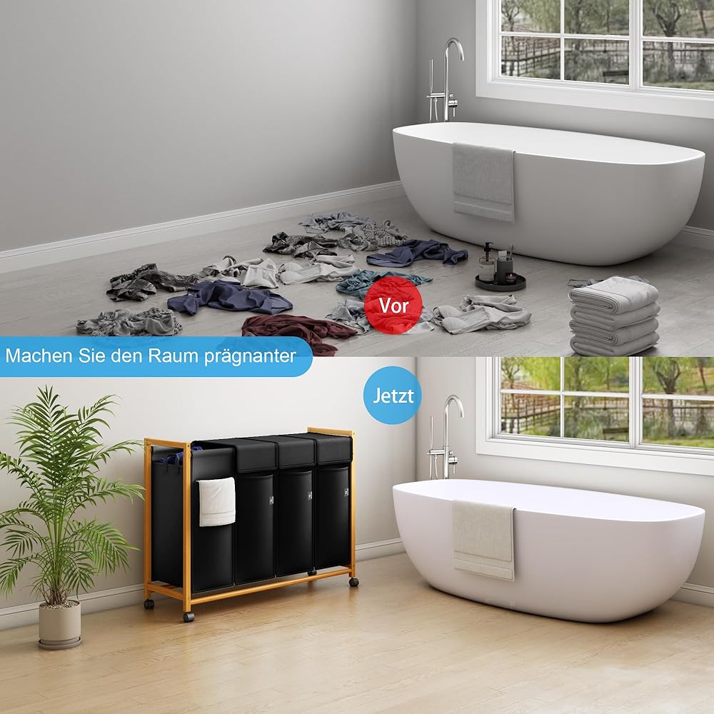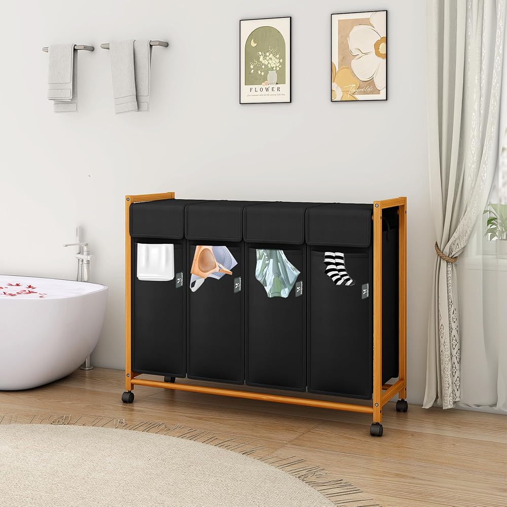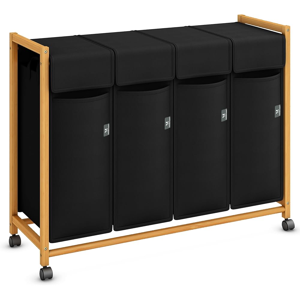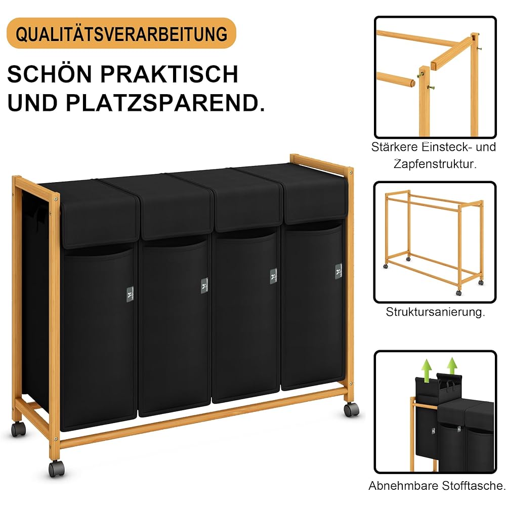AdelDream Panier à linge trieuse de vêtements avec roulettes 3 compartiments chariot à linge avec sacs amovibles collecteur de vêtements bambou Noir 12-7 : Cuisine et Maison