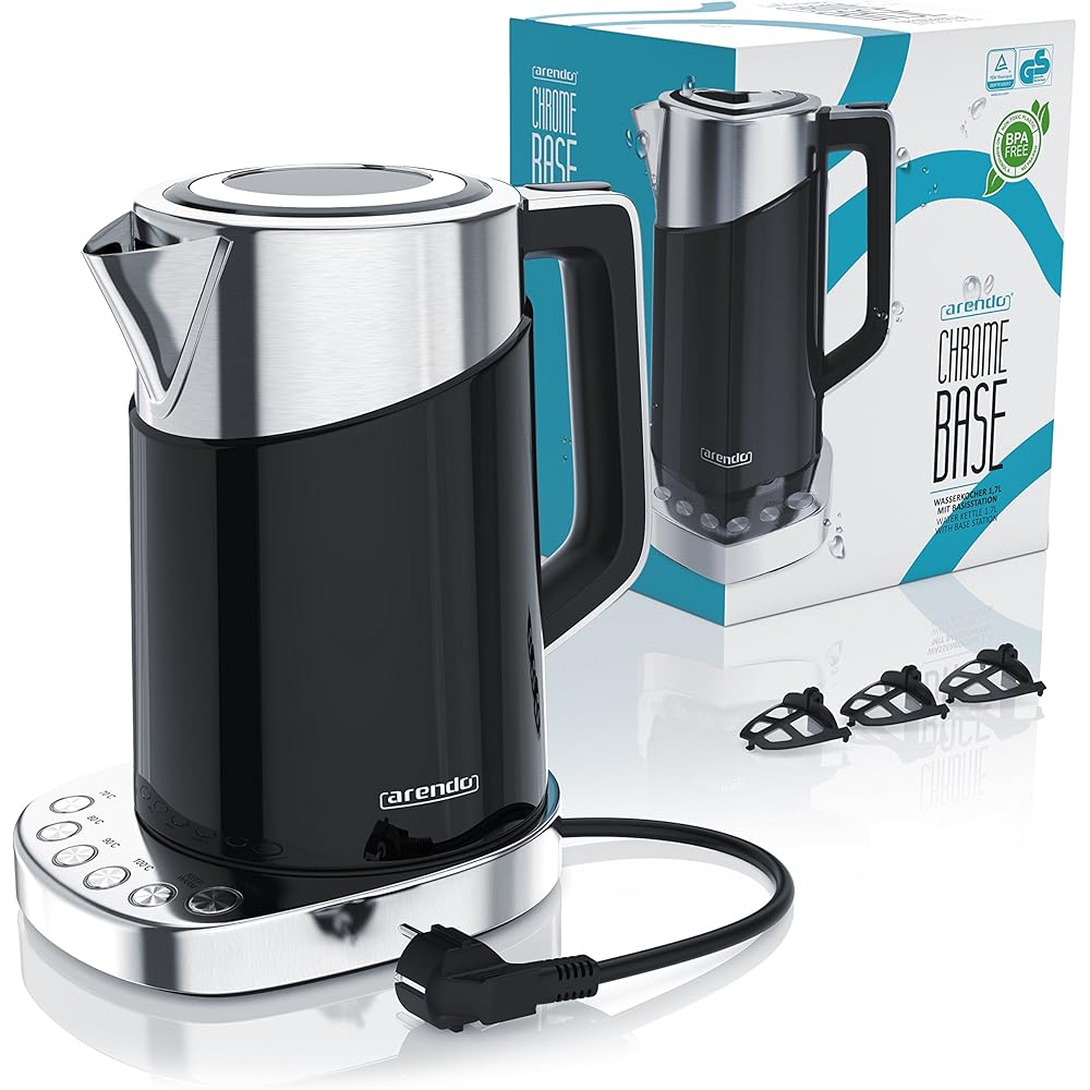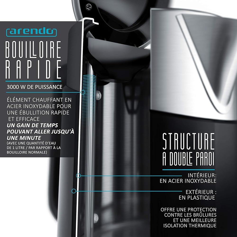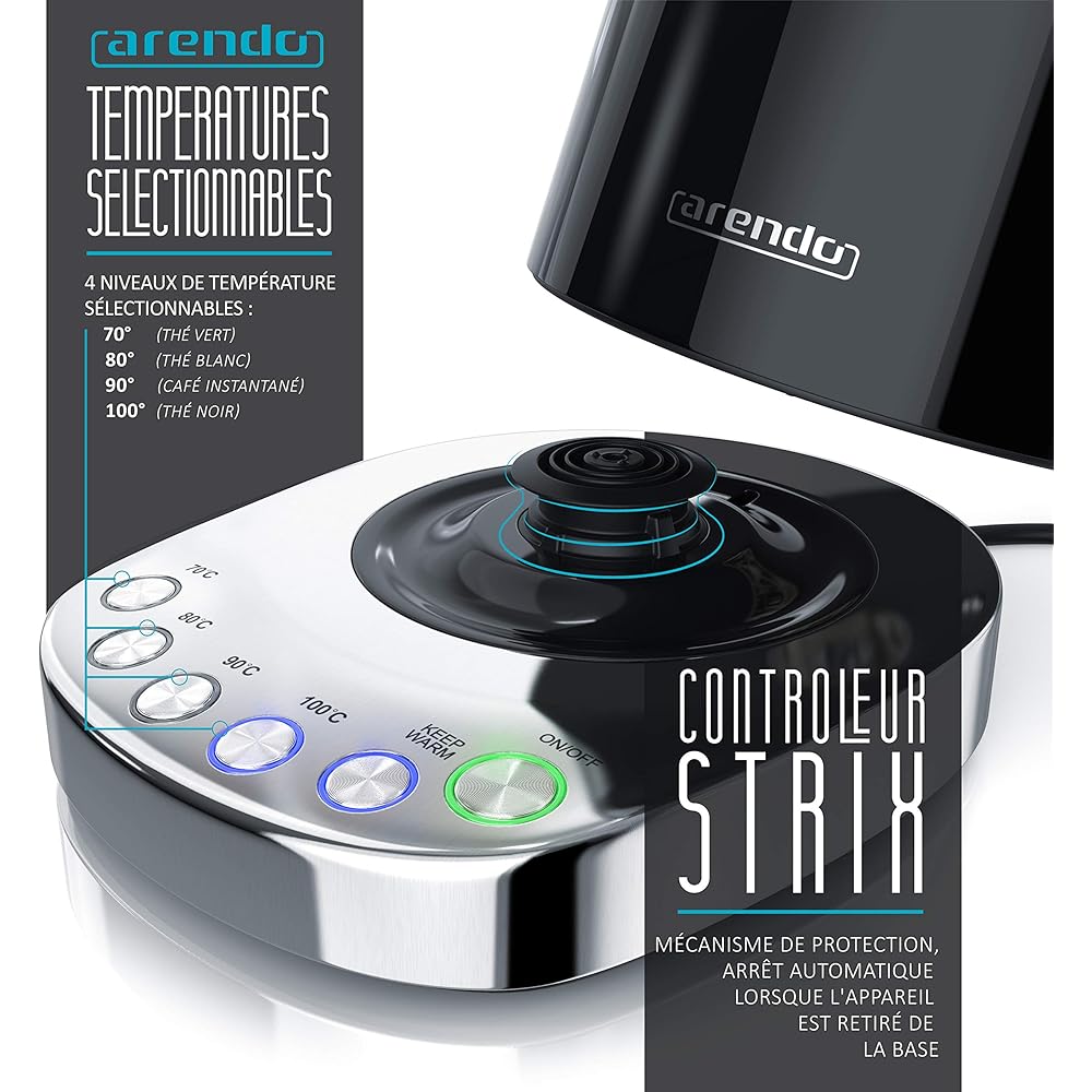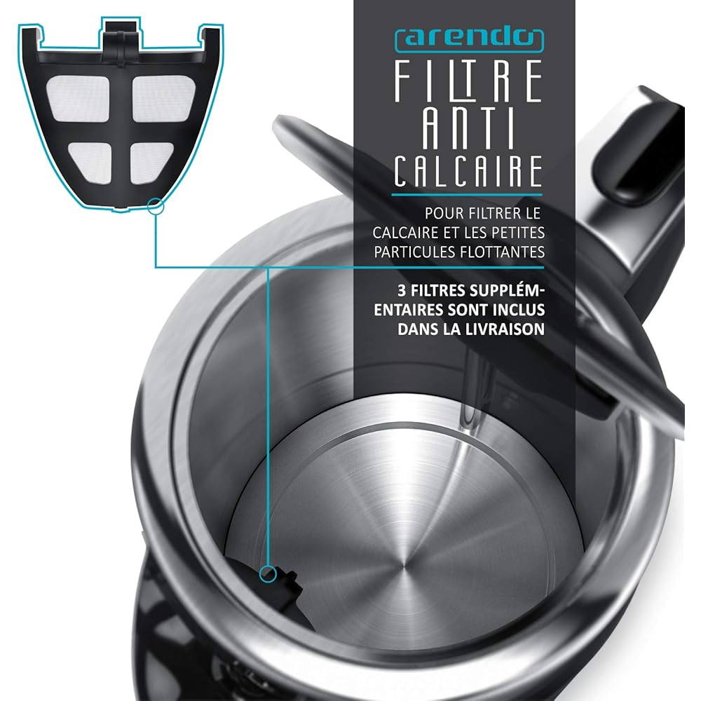 Arendo - Bouilloire en acier inoxydable de 3000 watts - 1,7 litres - Base à 4 températures sélectionnables - maintien au chaud - 3 filtres anti calcaire - Arrêt automatique - double paroi - Sans BPA : Cuisine et Maison