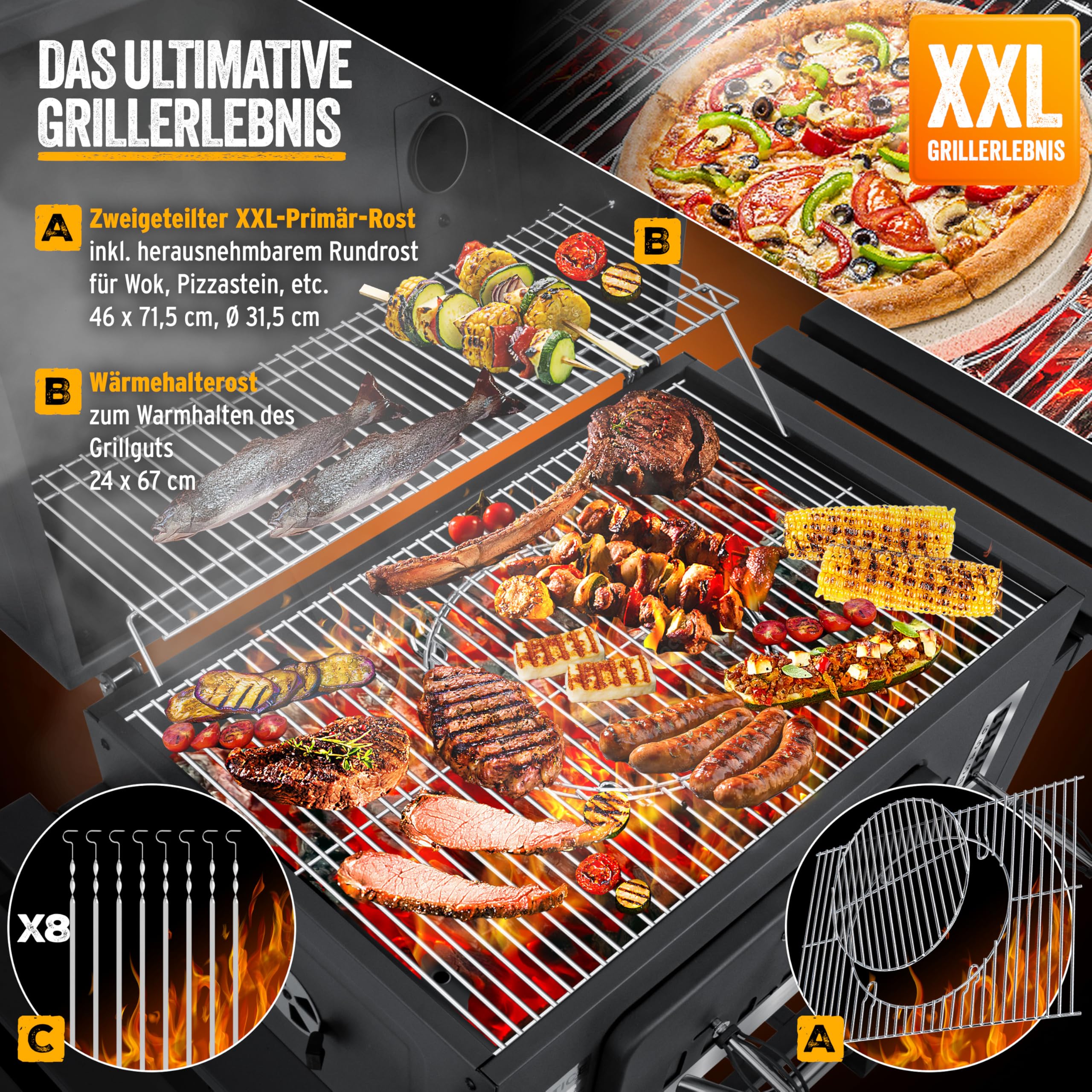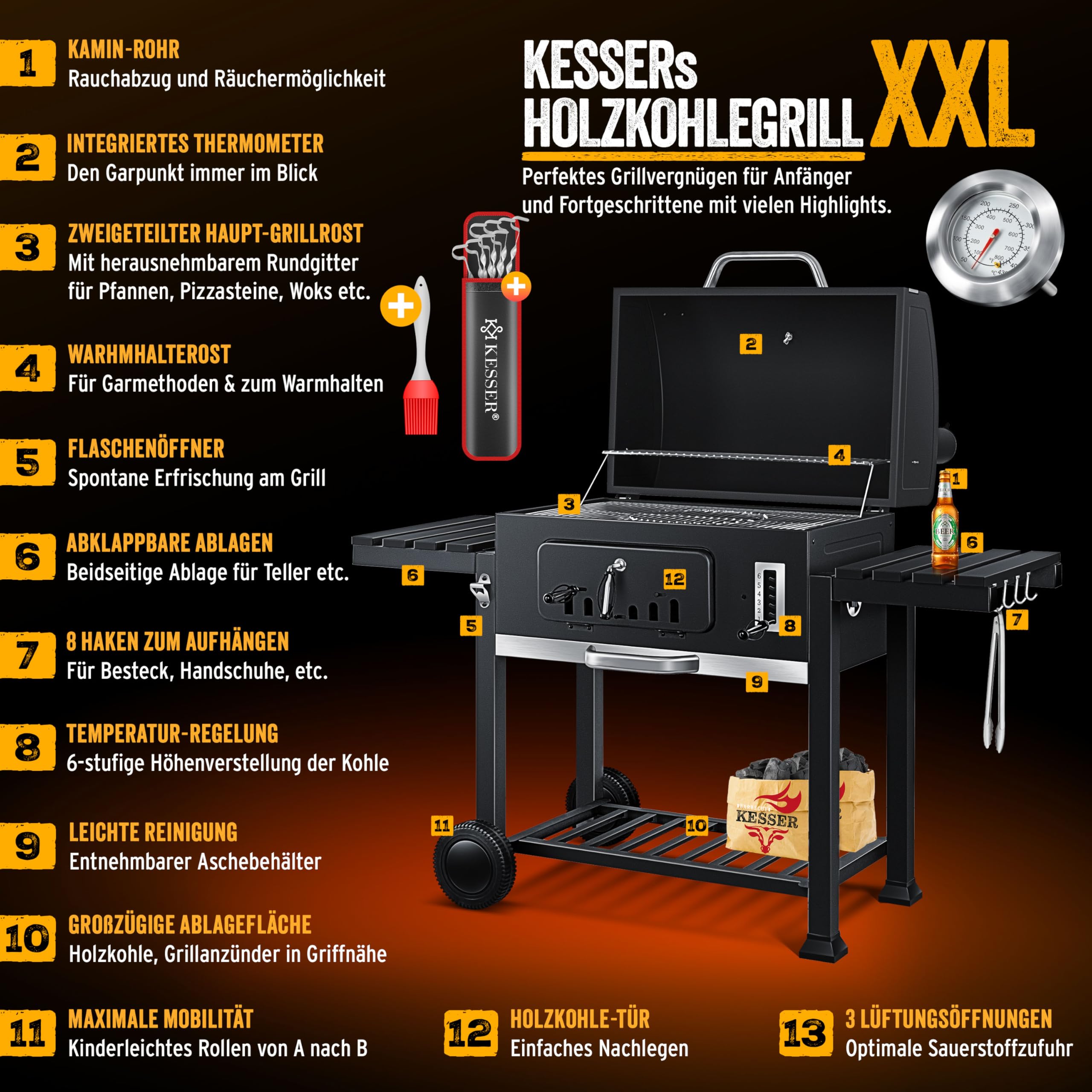KESSER® Chariot à Barbecue | Grill XXL à Charbon de Bois avec Couvercle, Roues, poignée en Acier Inoxydable, Grille et thermomètre | Grand Barbecue au Charbon de Bois
