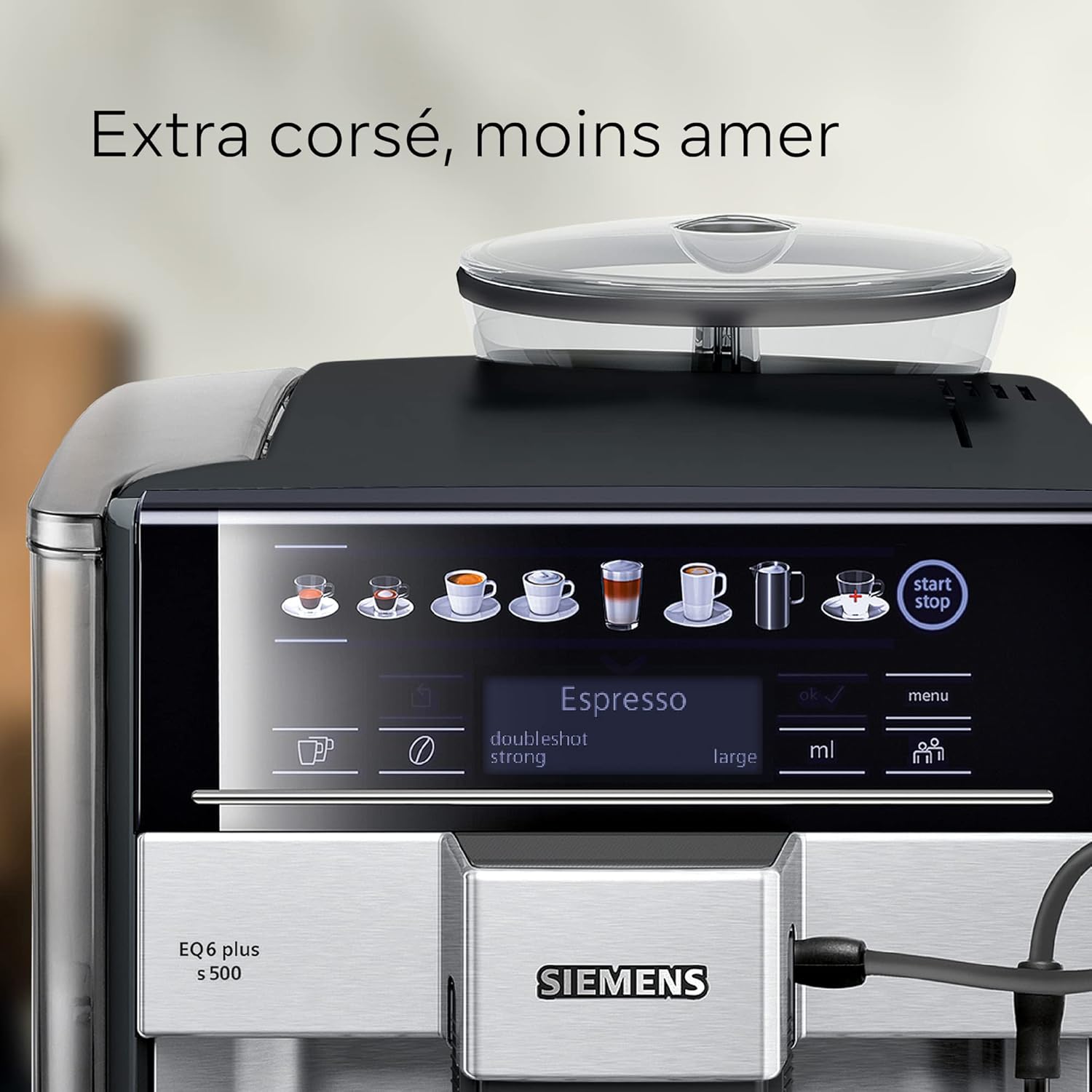 SIEMENS, machine à café tout automatique, EQ6 plus s500, aromaDouble Shot, système autoMilk Clean, Broyeur céramique, affichage coffeeSelect, gris/noir - Inox TE655203RW