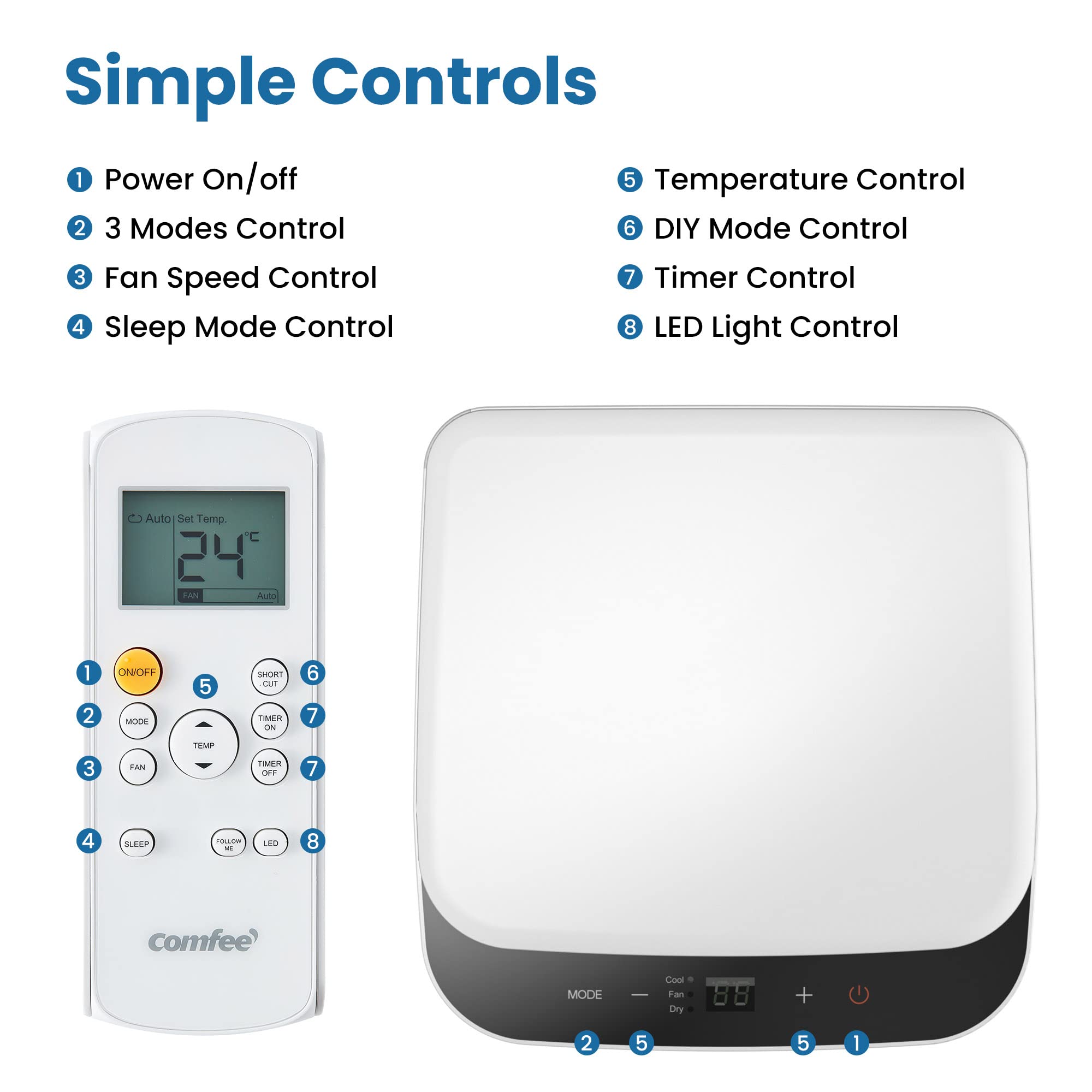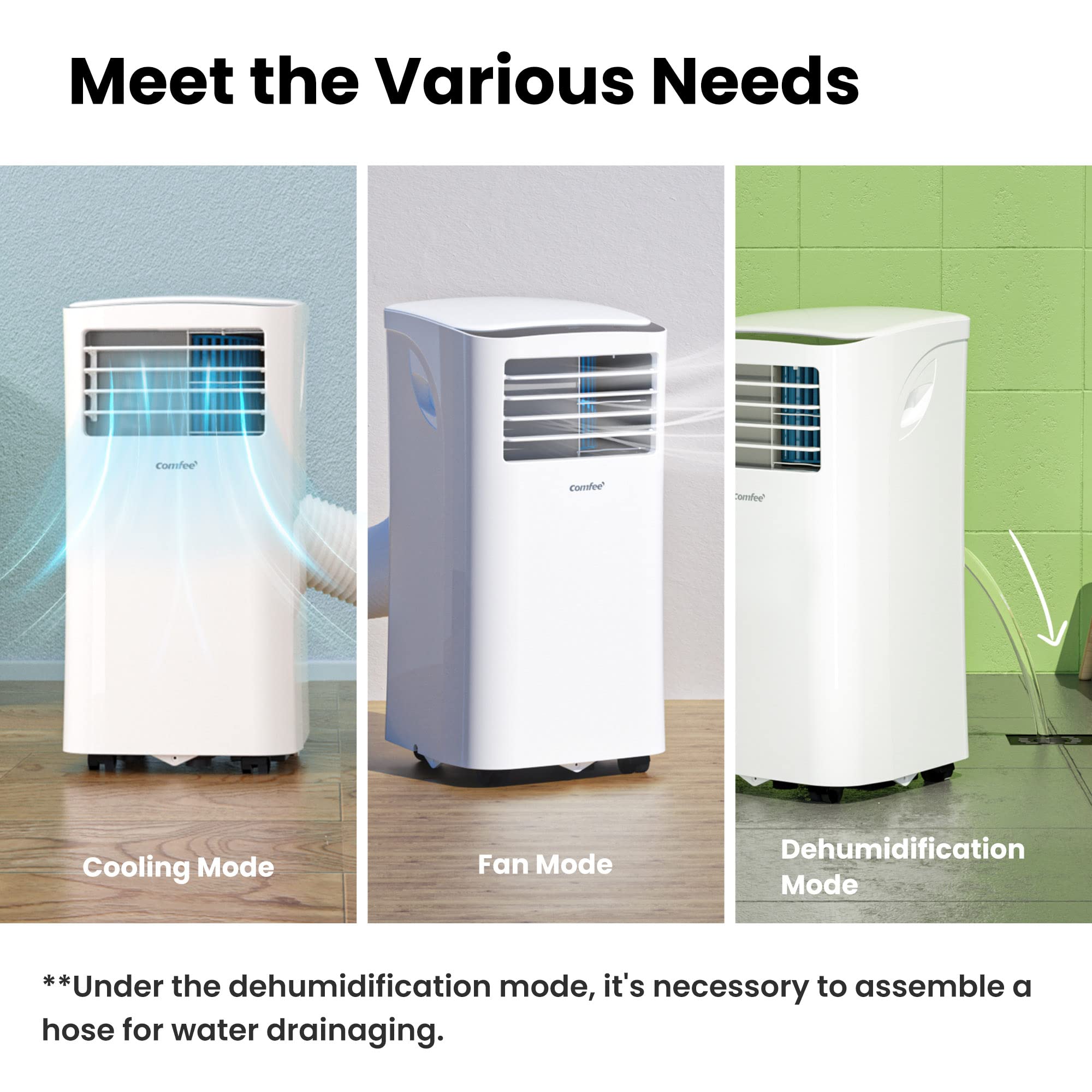 COMFEE' Climatiseur Mobile 9000 BTU/h 2,6kW, 3-EN-1 Refroidisseur Déshumidificateur Ventilateur, Fonction Follow me, Minuterie, Mode nuit, Pour salon