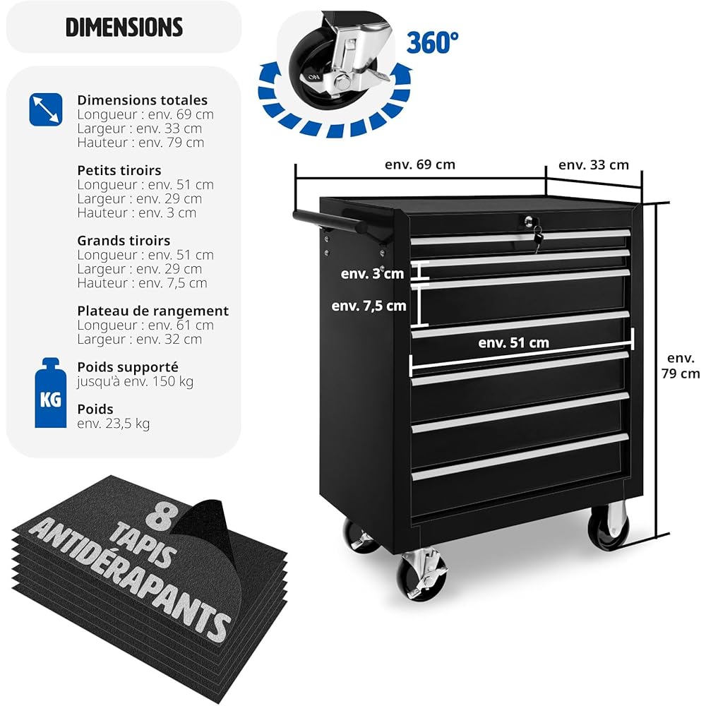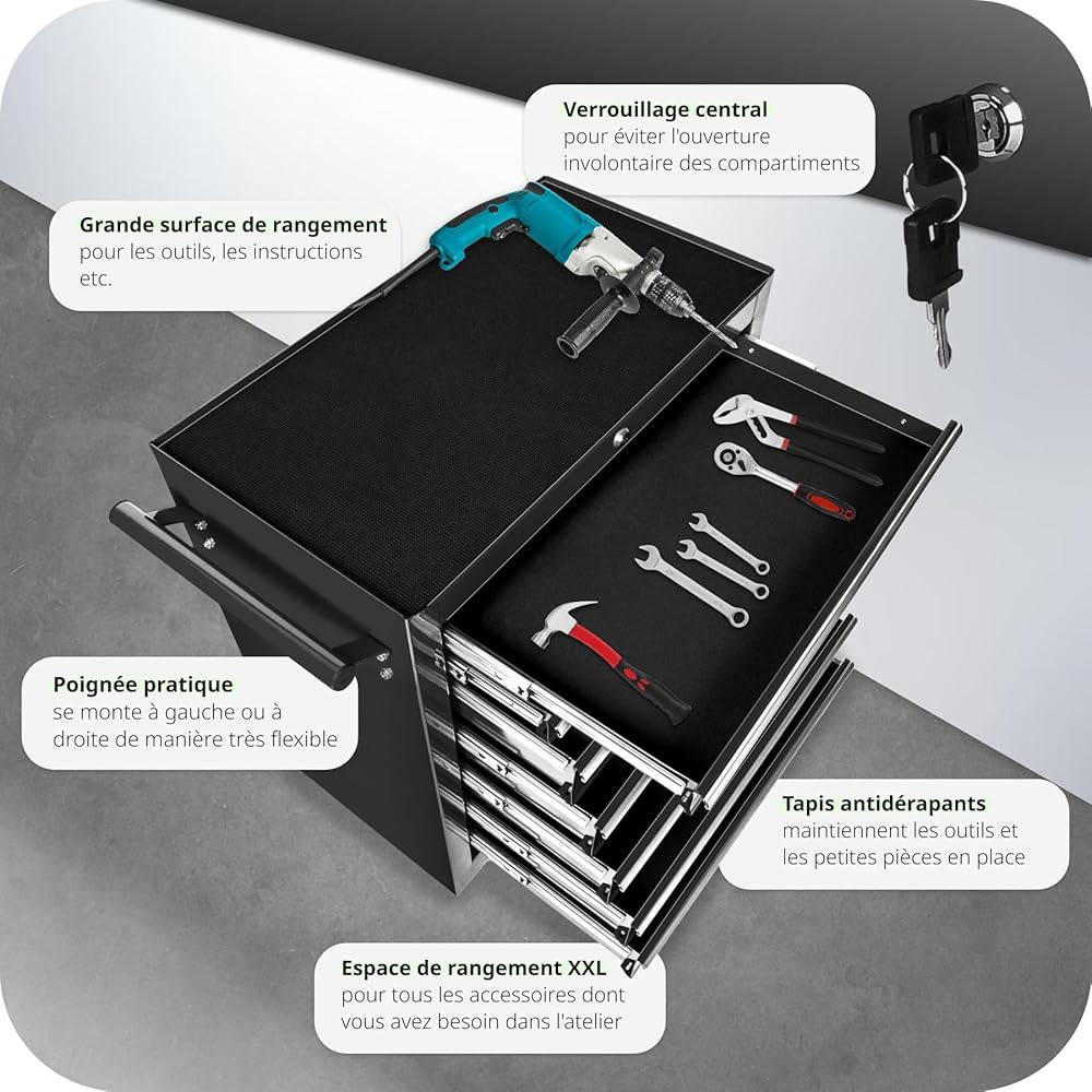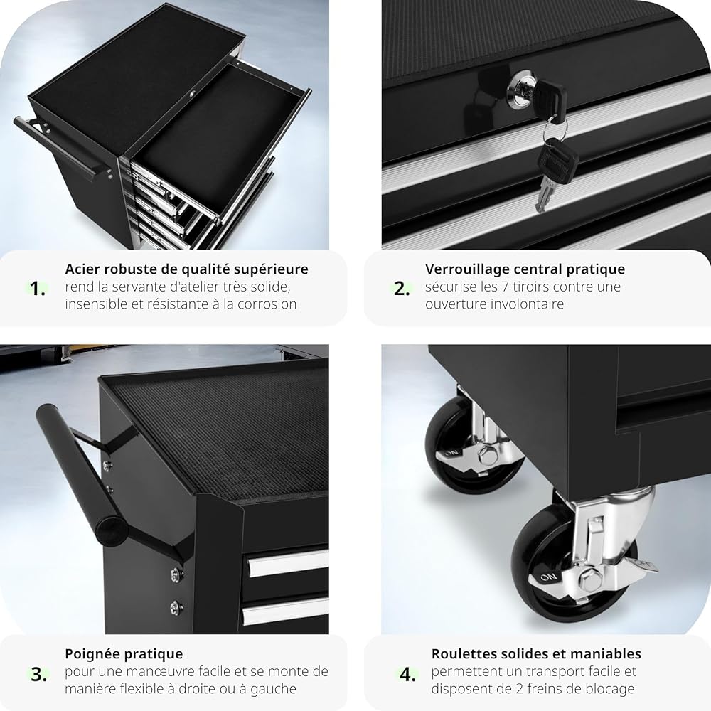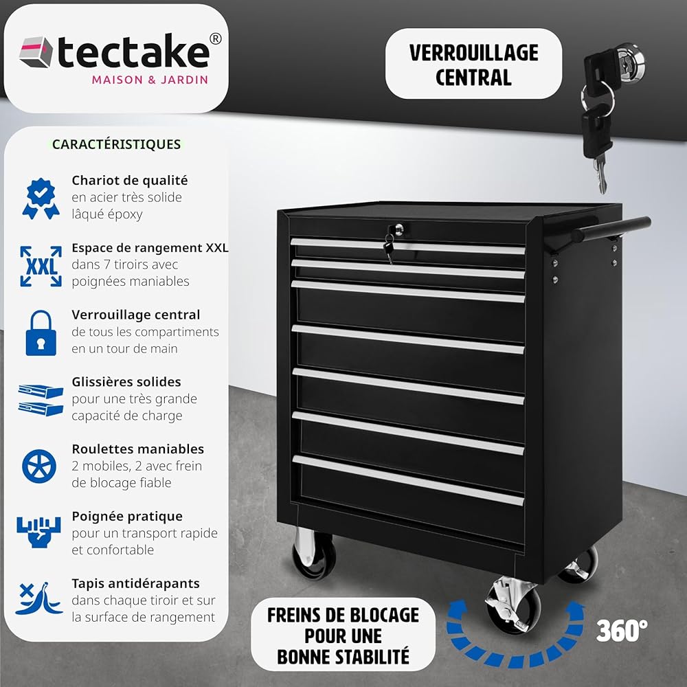 TecTake® Chariot d'atelier Metallique Servante d'atelier Vide Trolley Professionnel 7 Tiroirs spacieux Verrouillables Chariot a Roulette pour Rangement Atelier Garage - Noir : Commerce, Industrie et Science