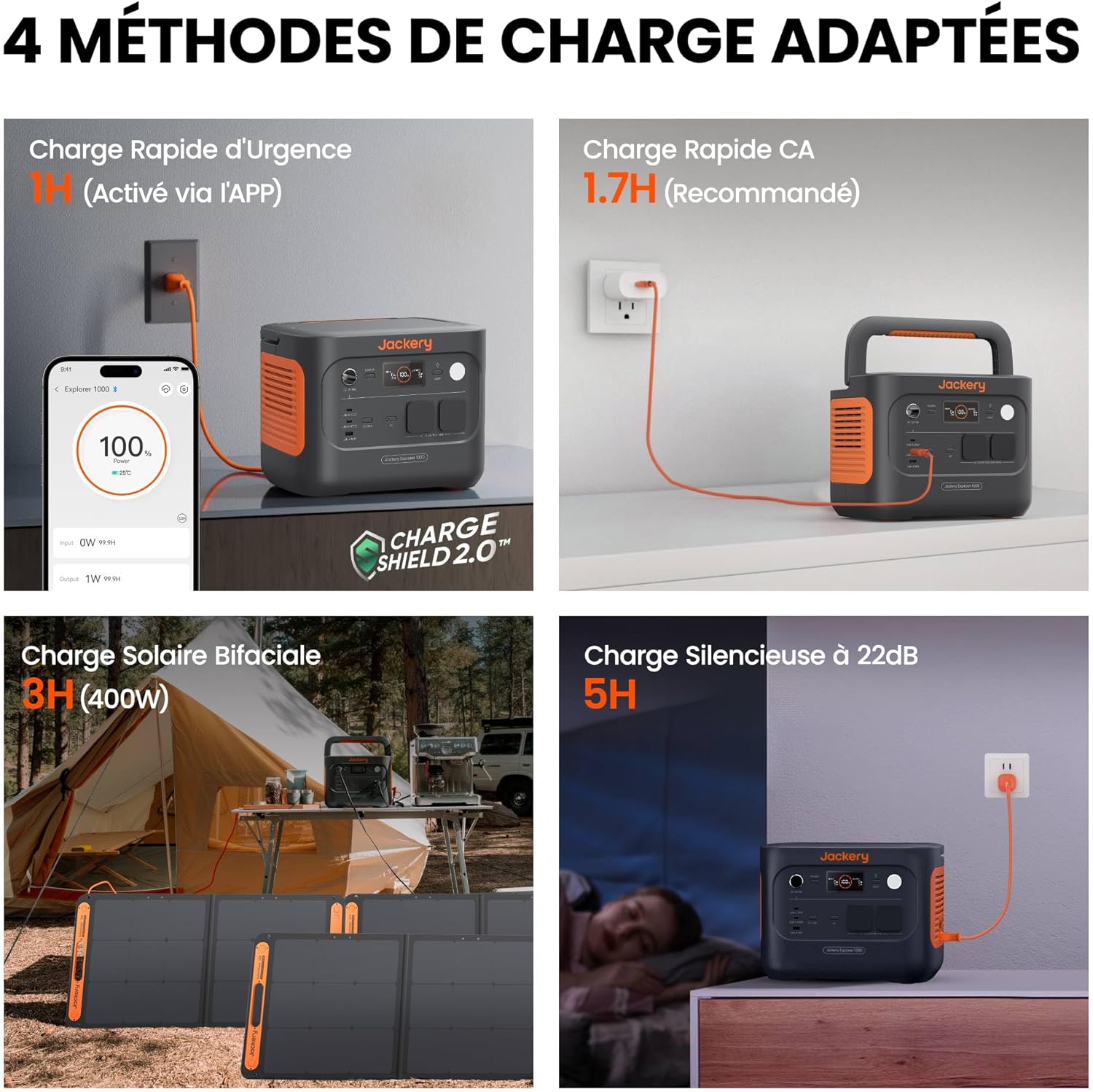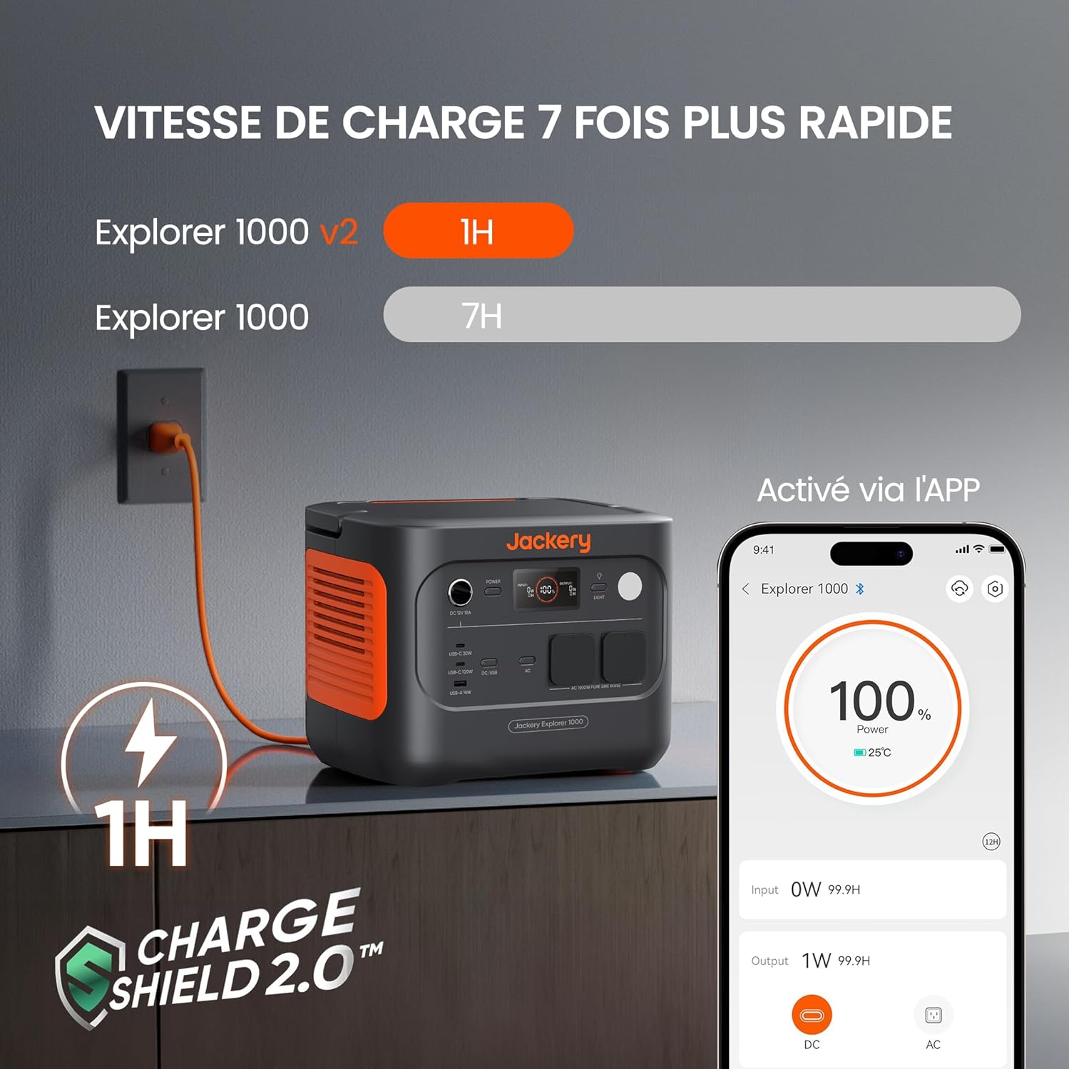 Jackery Explorer 1000 v2 Générateur Électrique Portable avec 100W Panneau Solaire, 1070Wh Batterie LFP, 1500W CA/100W USB-C Sortie, Charge Complète Rapide 1H via APP pour Plein Air,Camping-car,Urgence