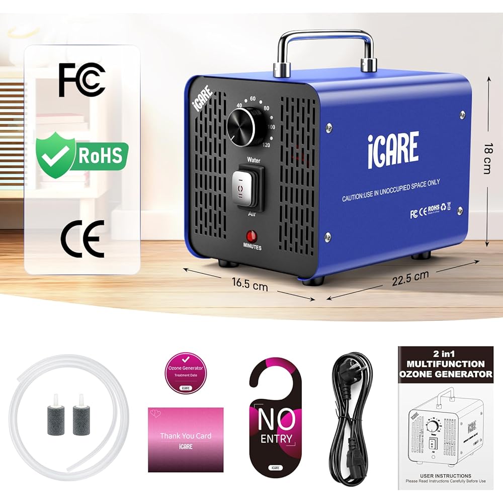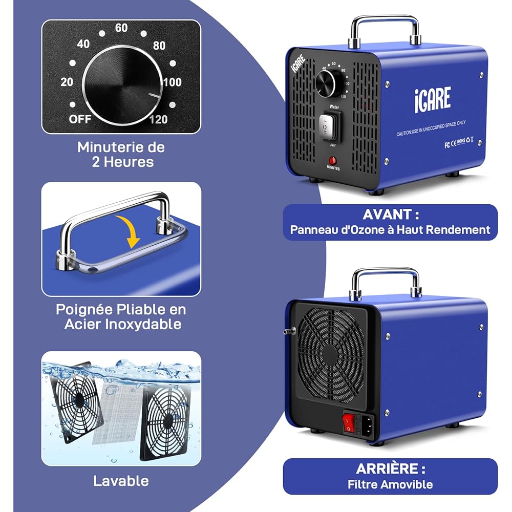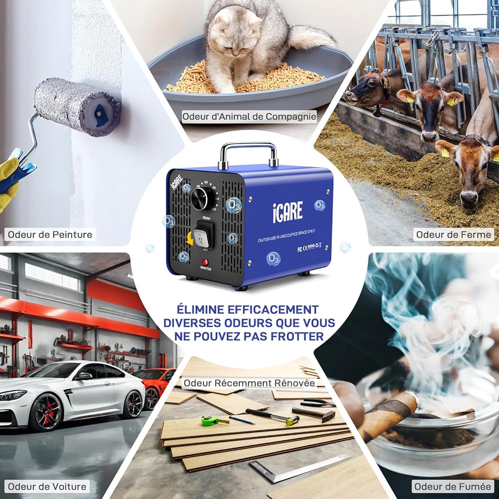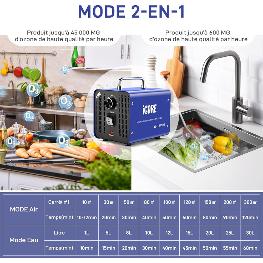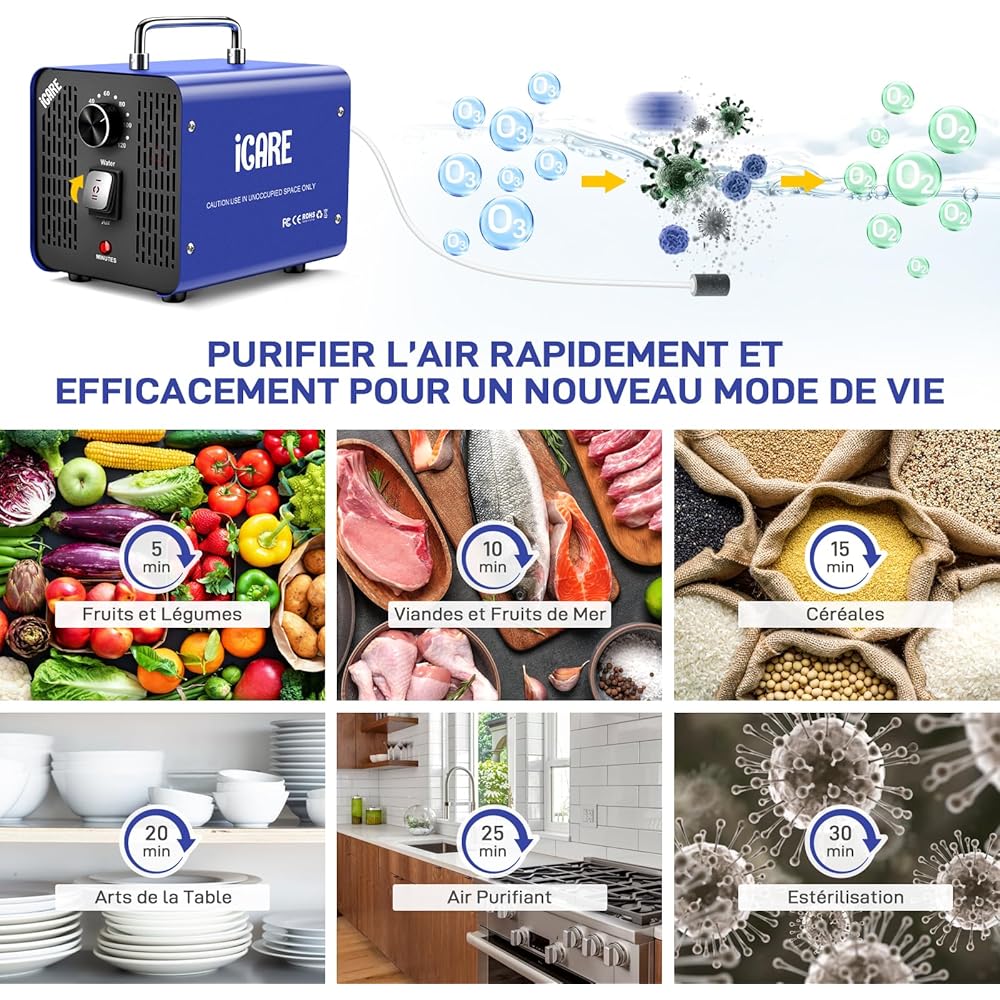 Générateur d'Ozone pour Eau et Air, 45000mg/h Purificateur d'Air à l'Ozone Éliminateur D'Odeurs avec Minuteur pour Salle de Bain, Cuisine, Animaux Domestiques, Voitures, Fumée, Eau, Fruits, Légumes : Cuisine et Maison