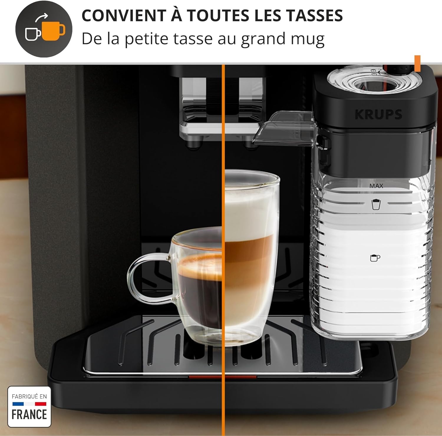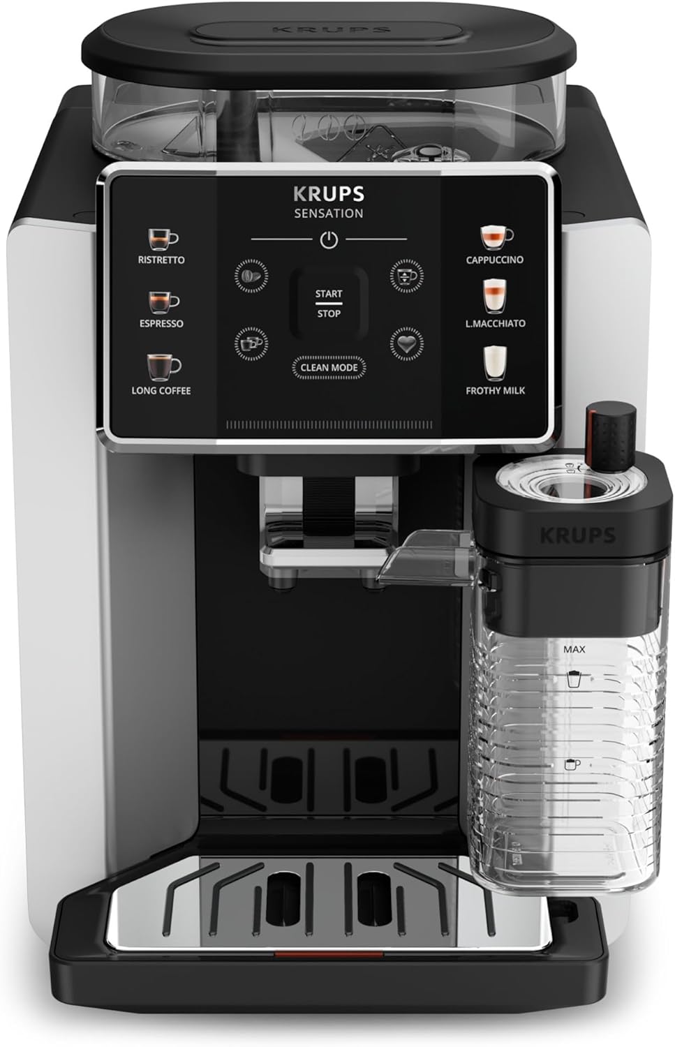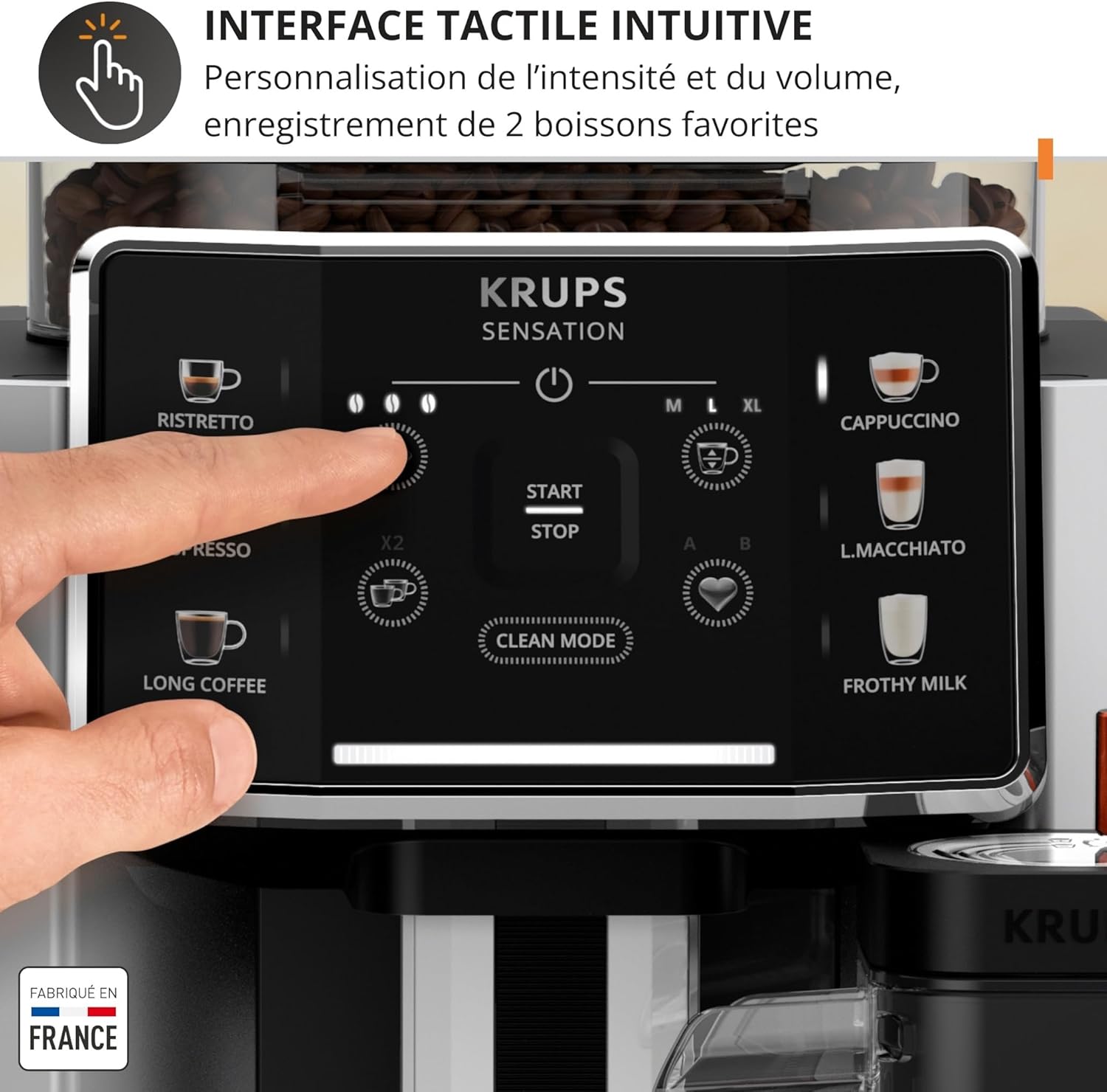 Krups Sensation Lait, Machine à café grains, machine expresso, 6 boissons, Carafe à lait, Cappuccino, Interface tactile, Nettoyage automatique, Silver, EA912E10