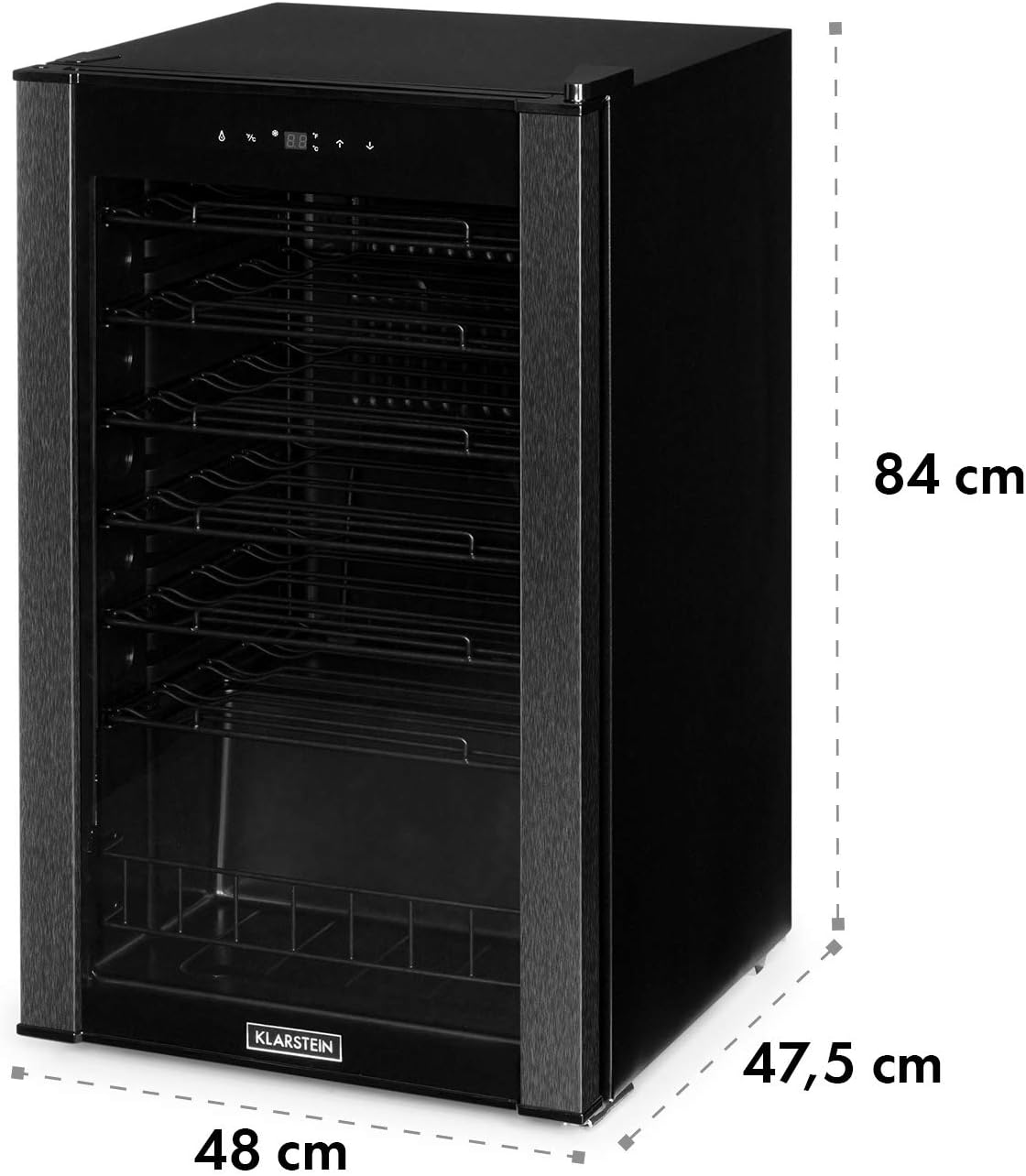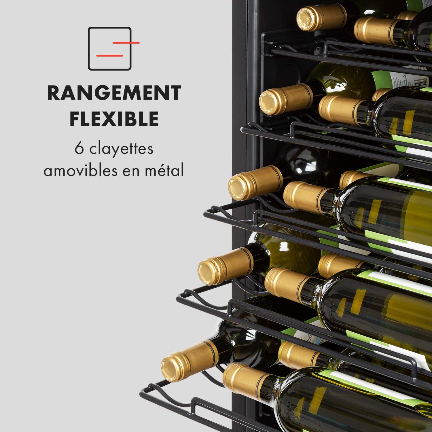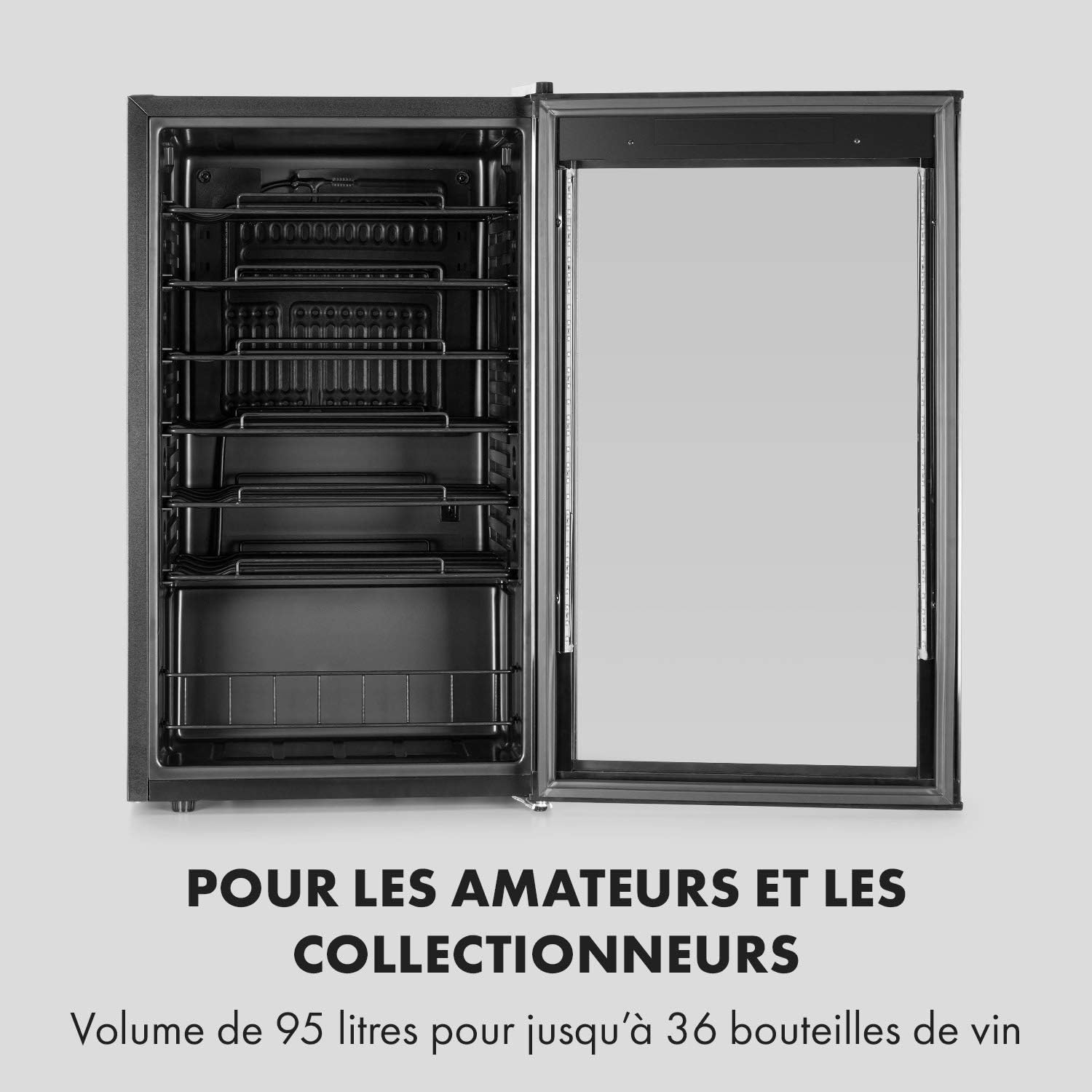 Klarstein Vinomatica - Cave à vin, Compacte, Capacité de 95L, 36 bouteilles, Porte panoramique, Cadre en acier inoxydable noir, Eclairage intérieur, 6 tablettes amovibles, Réglable de 4 à 18°C, Noir