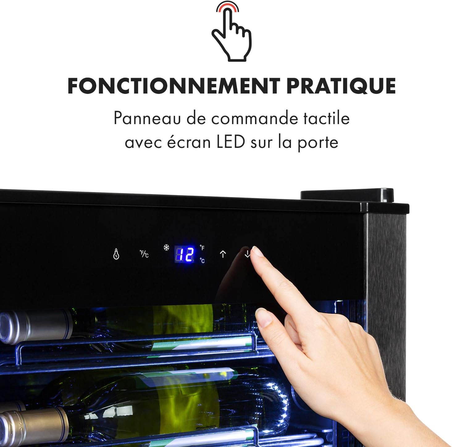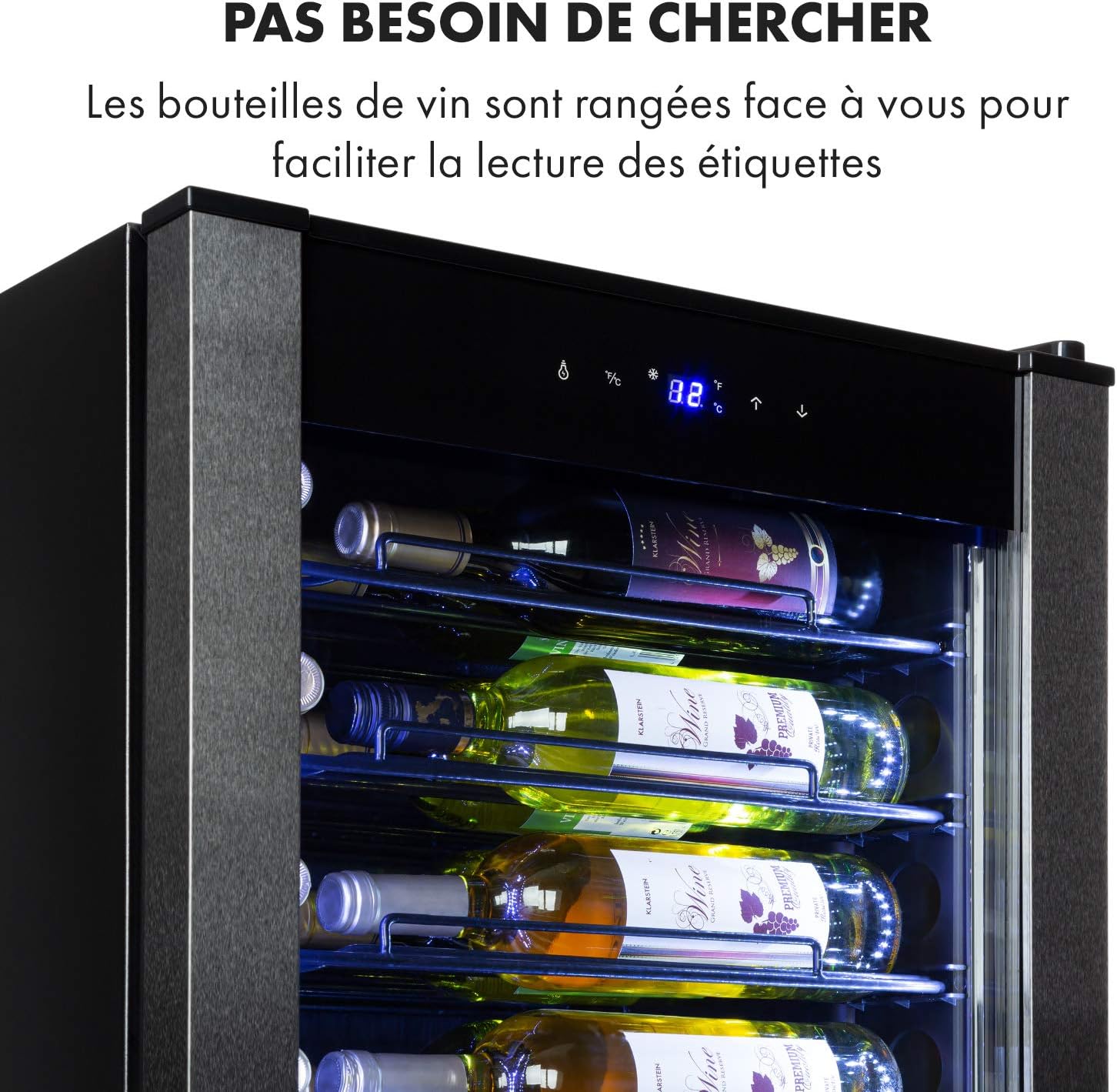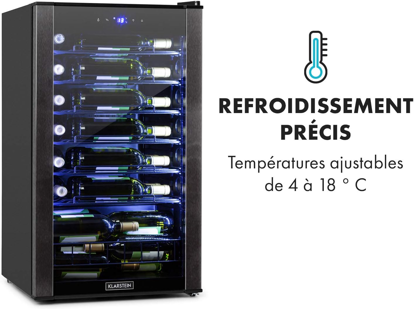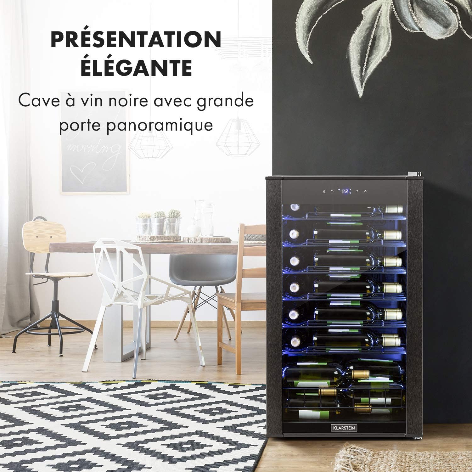 Klarstein Vinomatica - Cave à vin, Compacte, Capacité de 95L, 36 bouteilles, Porte panoramique, Cadre en acier inoxydable noir, Eclairage intérieur, 6 tablettes amovibles, Réglable de 4 à 18°C, Noir