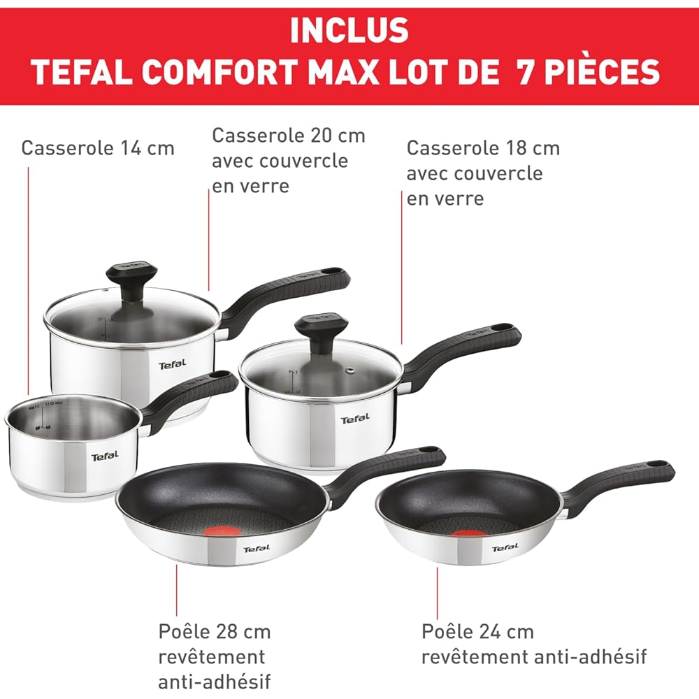 Tefal Comfort Max Casseroles 14/16/18 cm + couvercles 16/18 cm, Poêles 20/24 cm, Induction, Revêtement antiadhésif sur (poêles), Inox haute qualité, Garantie 10 ans, Poignées thermo-isolées C972S544 : Cuisine et Maison