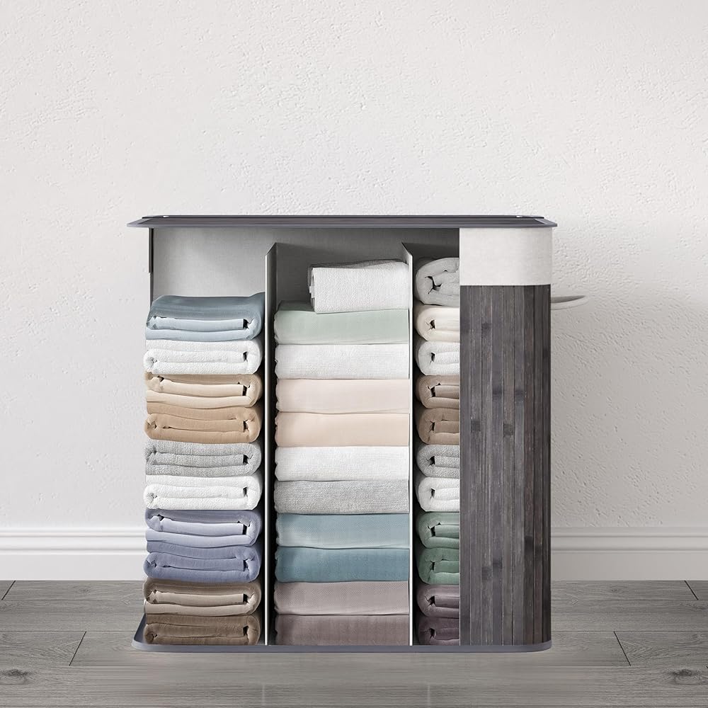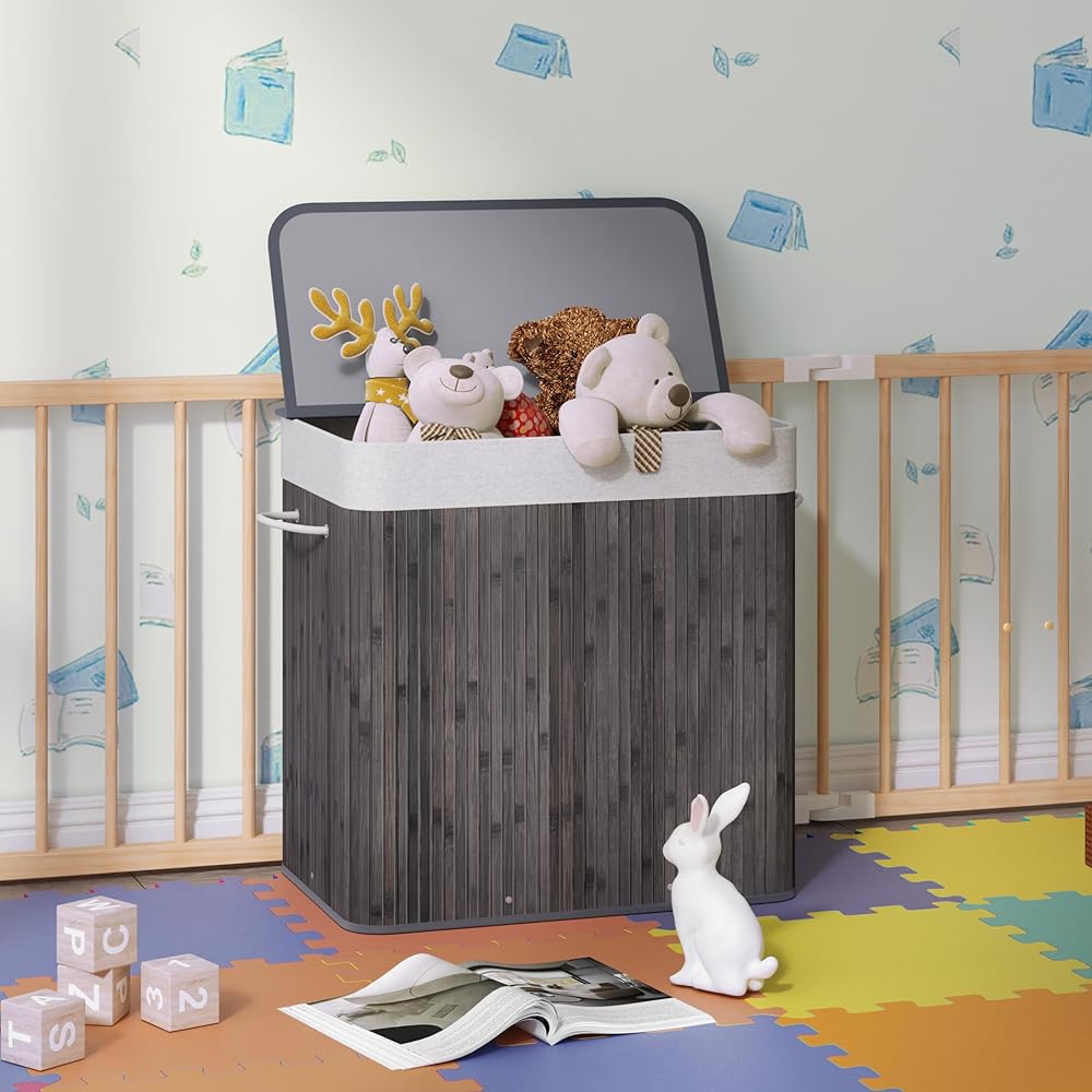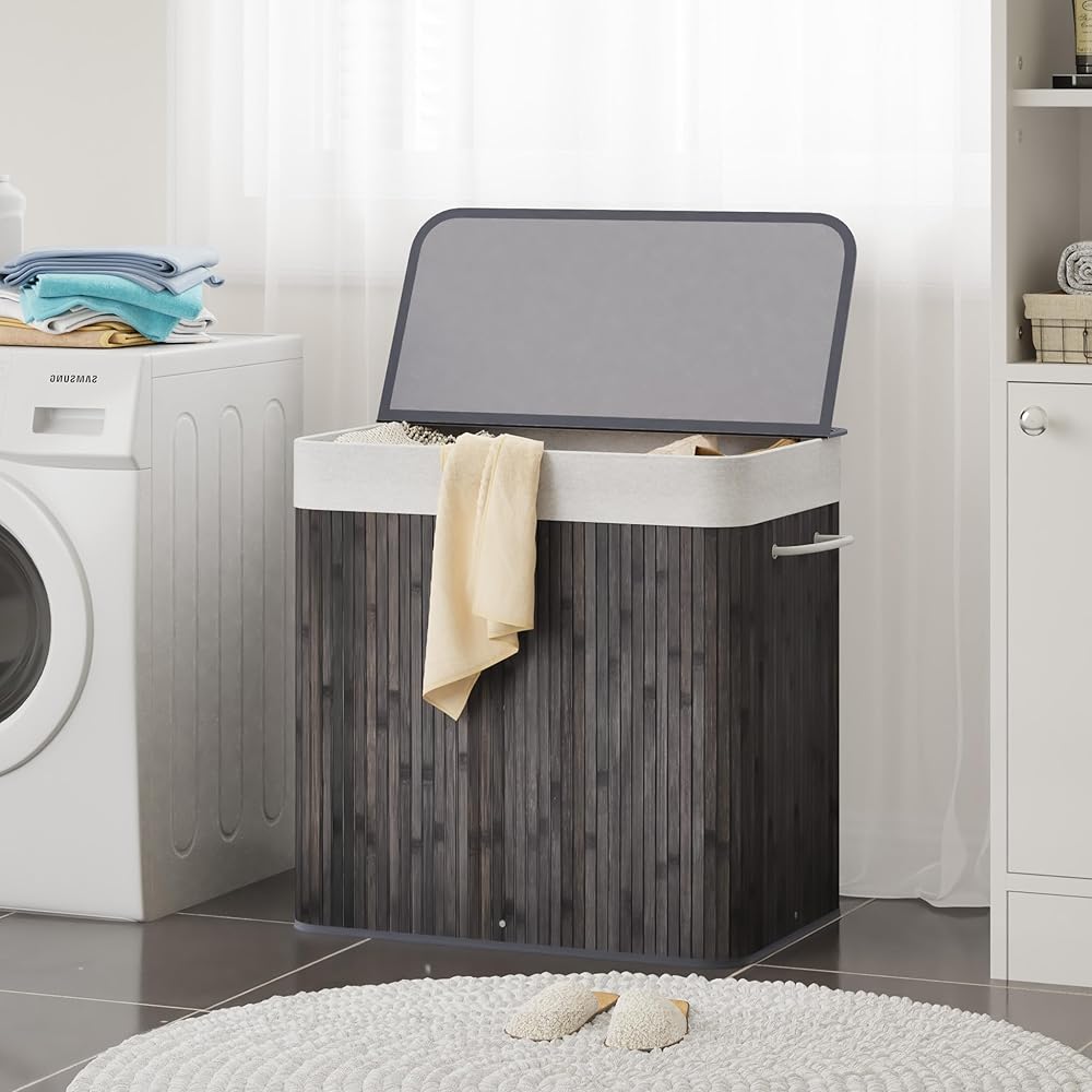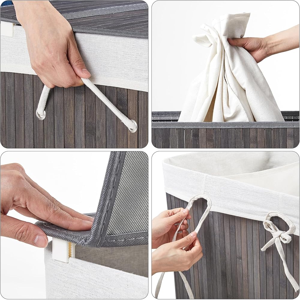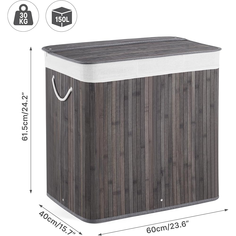 Mondeer Panier à Linge 150L avec Couvercle, 3 Compartiments,Corbeille en Bambou Naturel Boîte de Rangement à Linge Pliable avec Couvercle Amovible pour Buanderie, Chambre, 61.5 x 40 x 60 cm, Gris : Cuisine et Maison