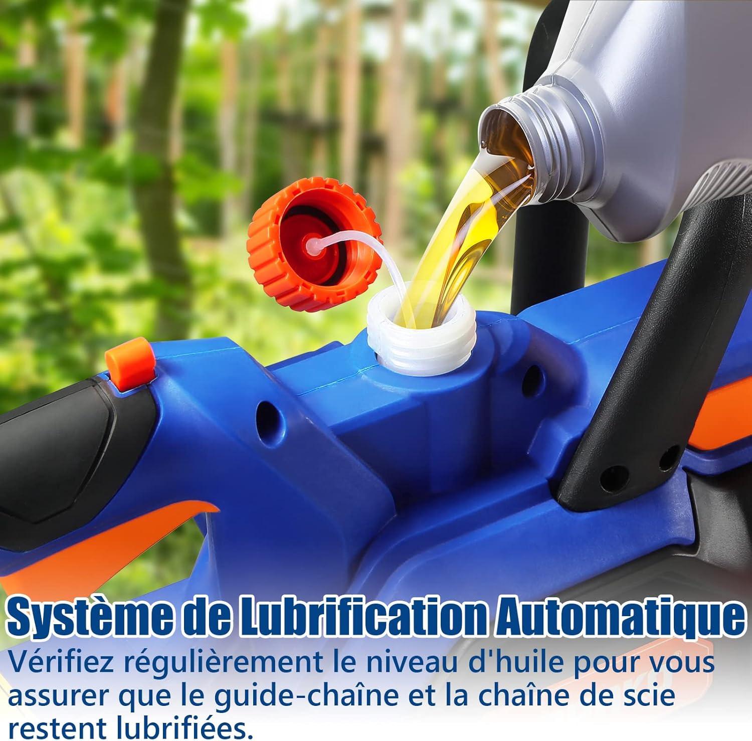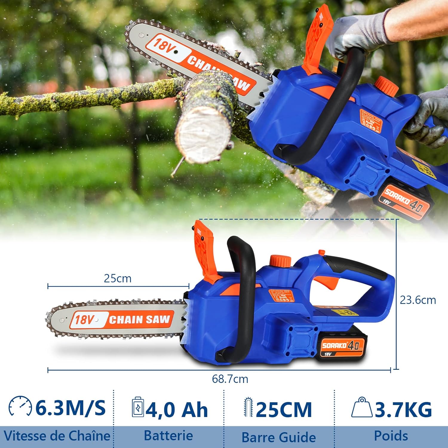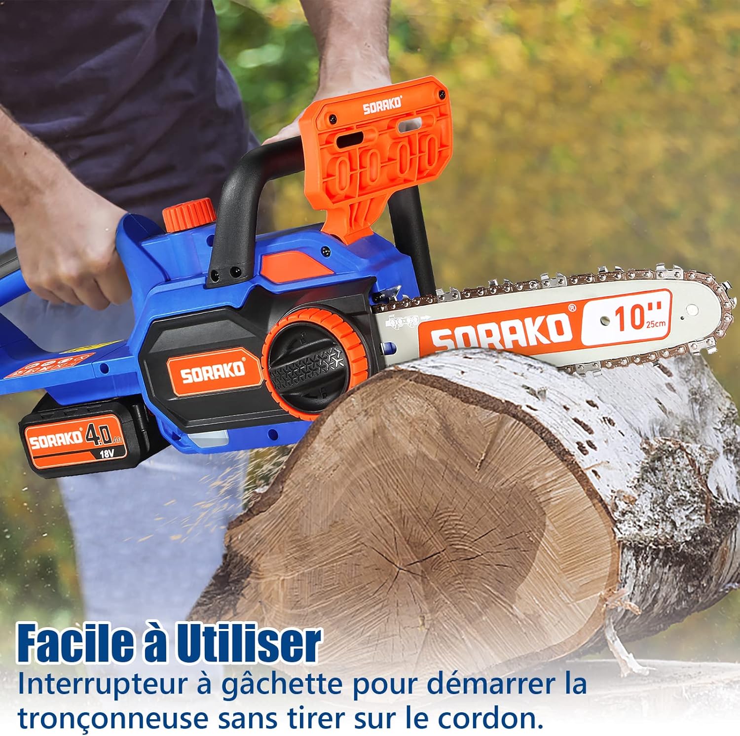 SORAKO Trononneuse Sans Fil 4.0Ah 18V, Tronconneuse a Batterie 25,4cm, Tendeur de Chaine Sans Outil (Comprend une batterie Li-Ion, chargeur rapide) Pour Couper du Bois Arbres Haies