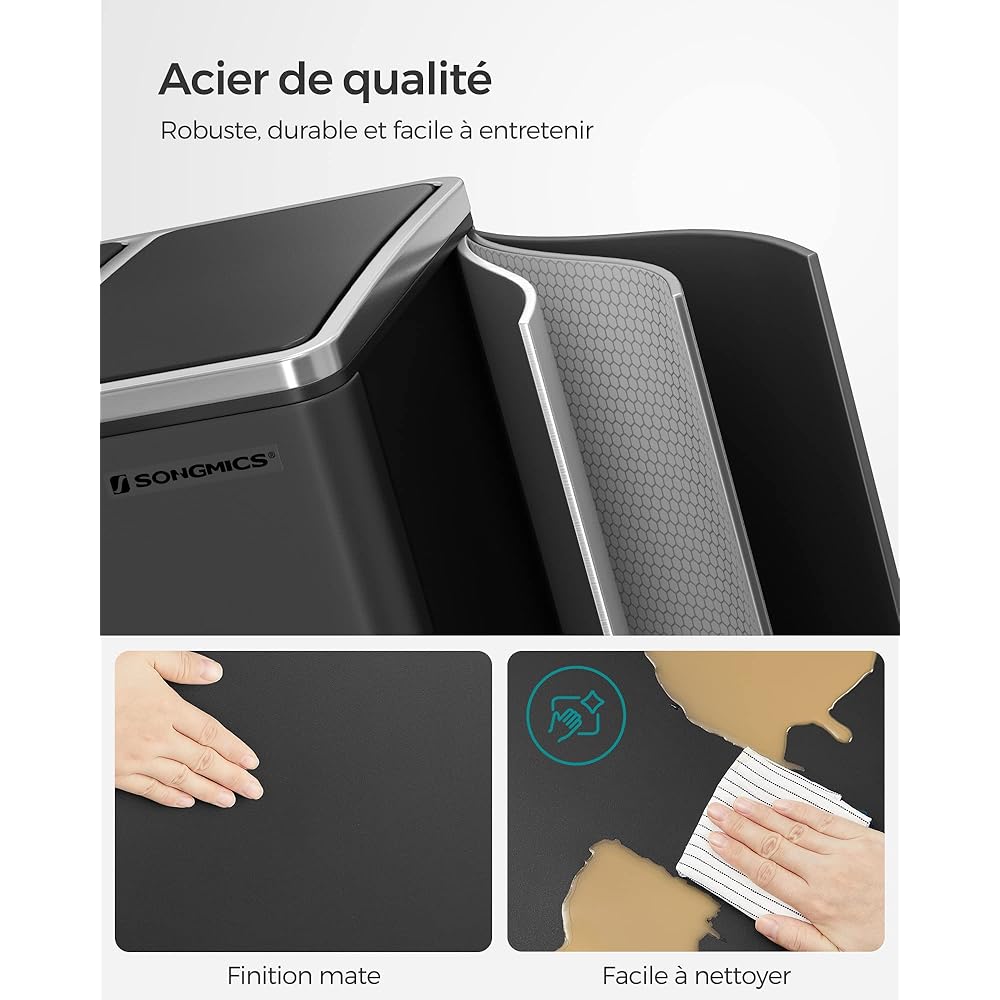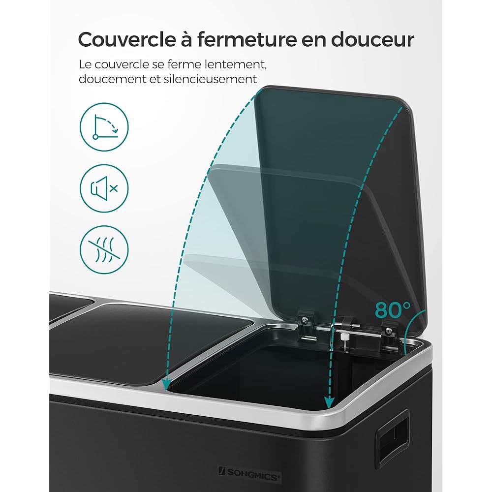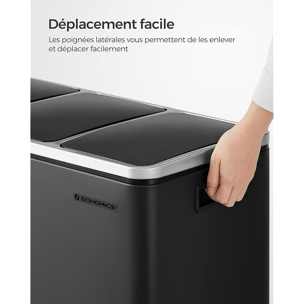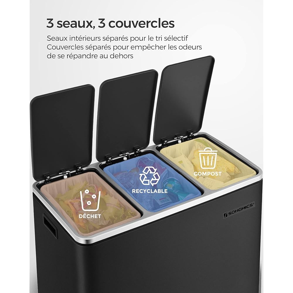 SONGMICS Poubelle Cuisine, 3 x 18L, Poubelle de Tri, 3 Compartiments, Déchets, Compost, Couvercles à Fermeture en Douceur, Pédales, Seaux Intérieurs, Acier, Noir d'Encre LTB54BK : Cuisine et Maison